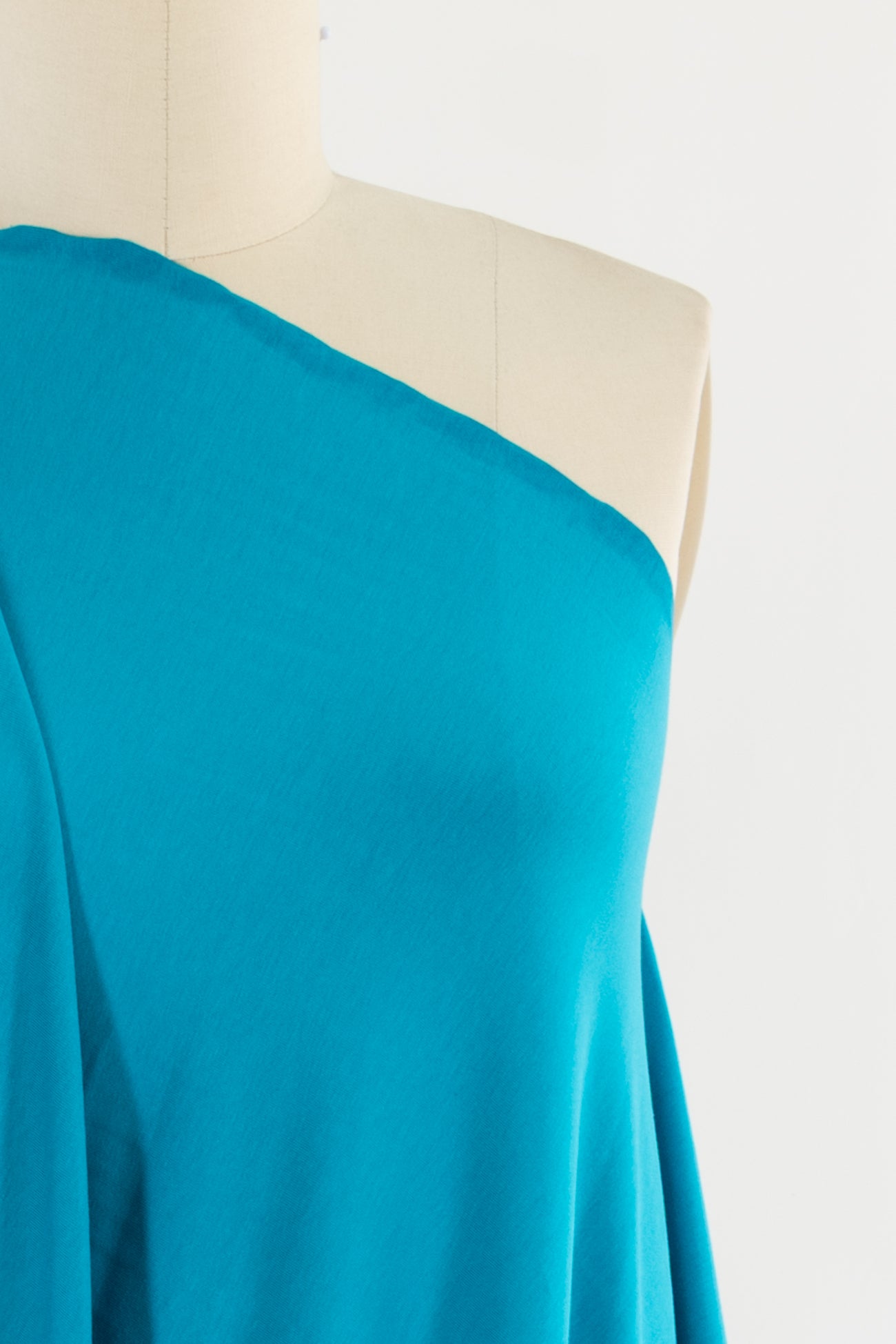 Clear turquoise in an impeccable European quality cotton/spandex jersey knit, produced in Denmark. Light/mid-weight, opaque, and will skim the body in a flattering way. It has a soft, smooth texture, fluid drape, 4-way stretch, and some rolling at the cut edge. Right for a variety of garments: t-shirt, tunic, dress, soft pants, leggings, cardigan, skirt, or lounge-wear, as well as children's and men's clothing. Oeko-Tex® certified.