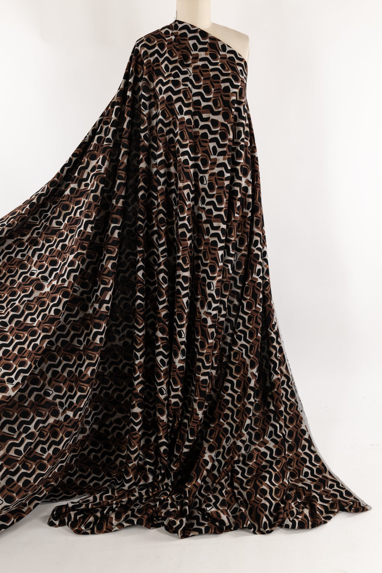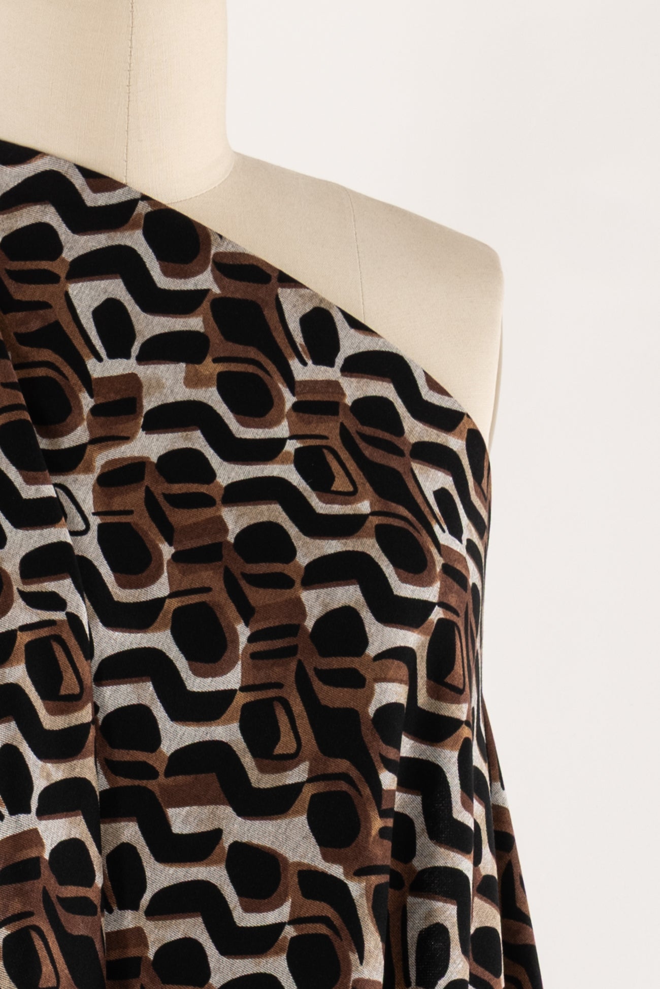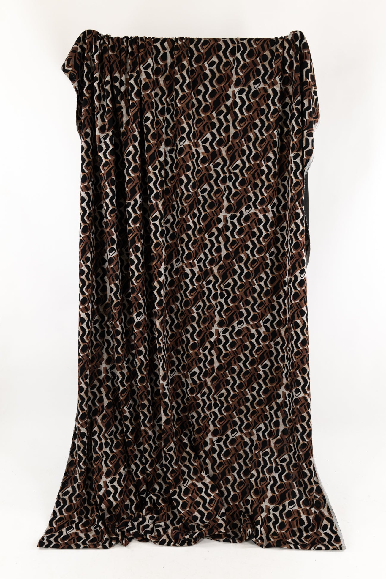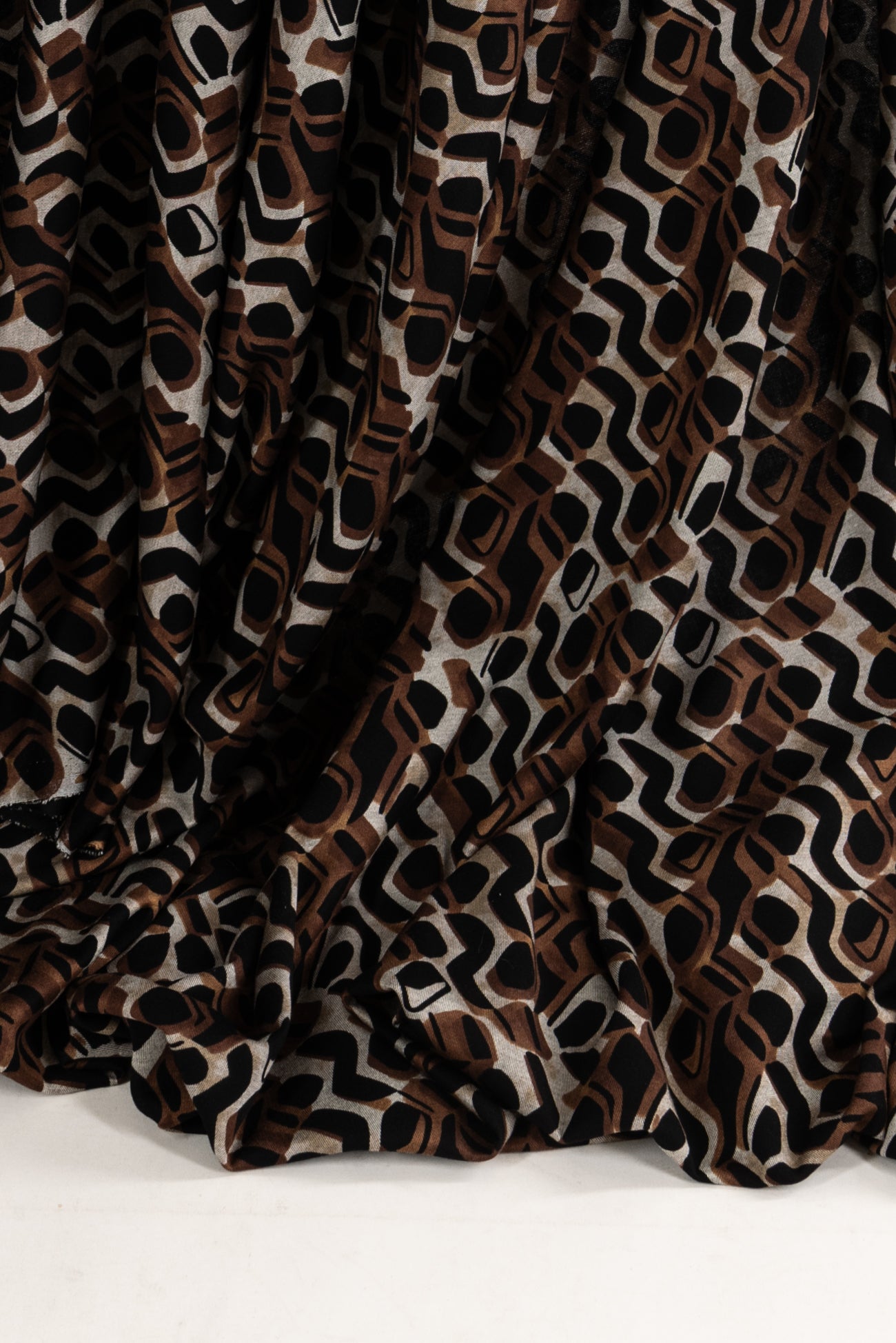 Graceful art deco graphic in shades of brown, taupe, and black. Digital print on a light/mid-weight ponte/double knit, with a smooth soft hand and drape, solid black on the back side, 2-way stretch, a 9¼" repeat, and no rolling at the cut edge. Right for both tops and bottoms, t-shirt, cardi, light jacket or coat, vest, caftan, soft pant, skirt, or dress.
