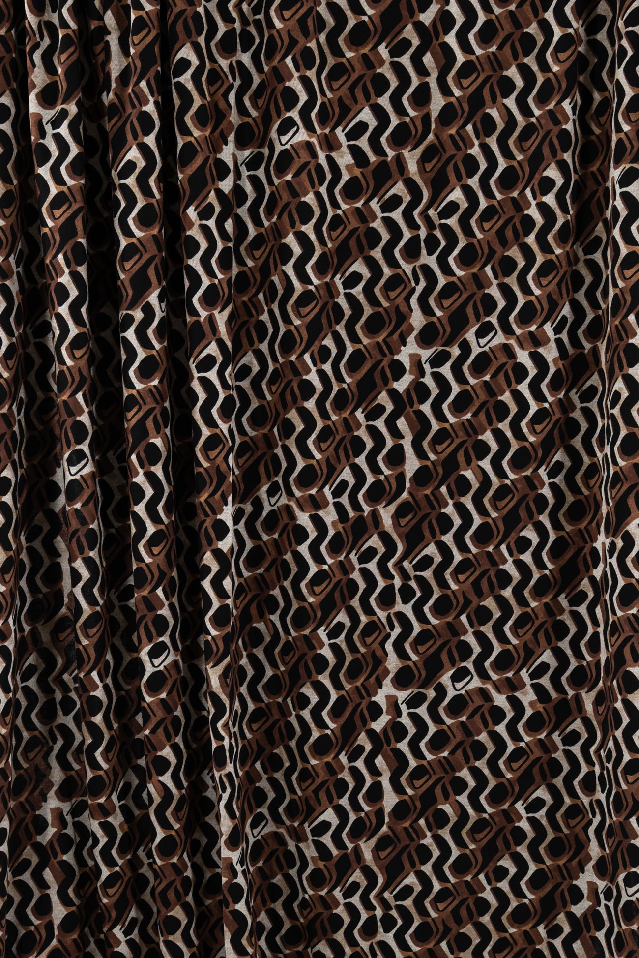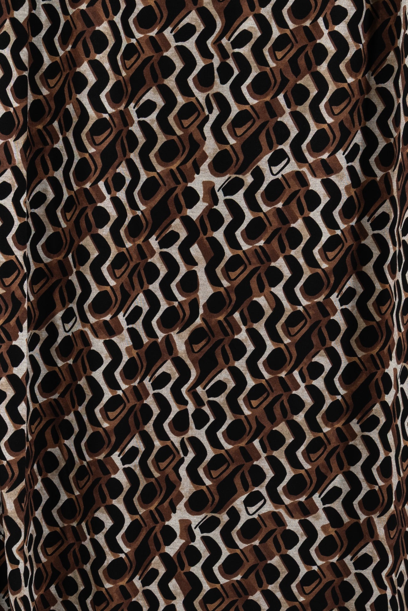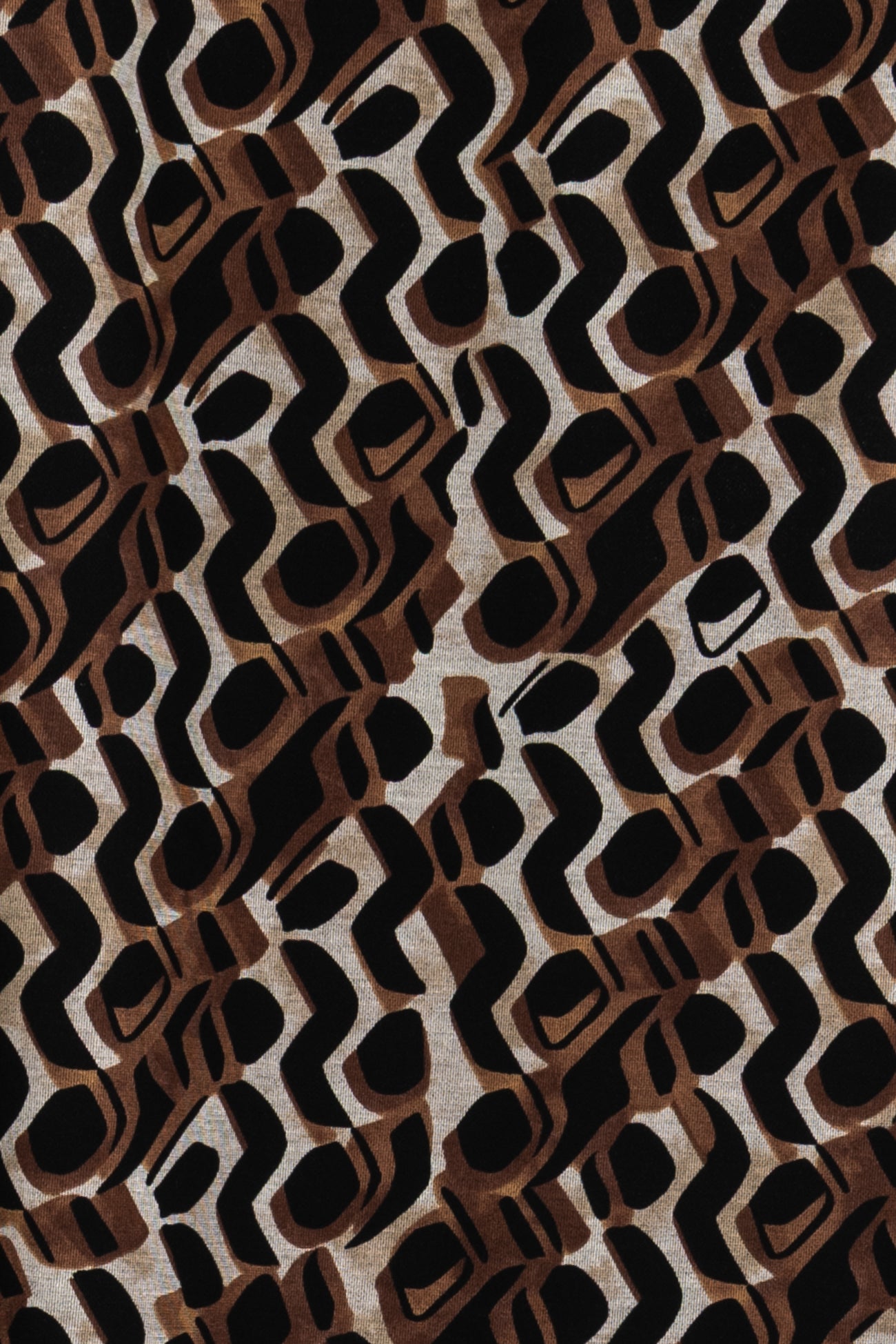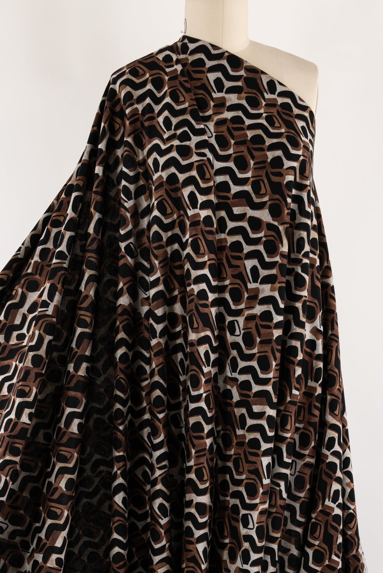 Graceful art deco graphic in shades of brown, taupe, and black. Digital print on a light/mid-weight ponte/double knit, with a smooth soft hand and drape, solid black on the back side, 2-way stretch, a 9¼" repeat, and no rolling at the cut edge. Right for both tops and bottoms, t-shirt, cardi, light jacket or coat, vest, caftan, soft pant, skirt, or dress.