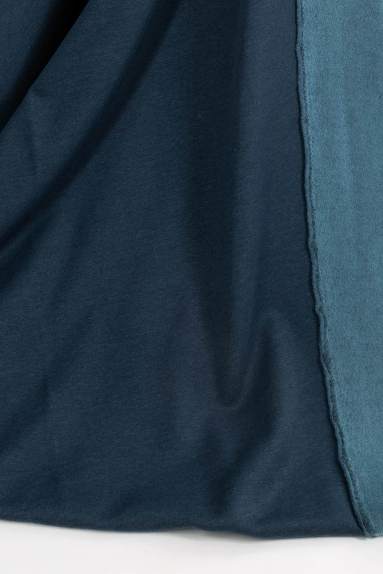 Brindled charcoal and pale turquoise fleece in a super soft, cozy and drapey cotton/poly blend, a beautiful quality knit from Denmark. Think of a just right sweatshirt type fabric without any stiffness, with a lovely drape and a super appealing soft hand on both sides of the fabric. The back side is softly brushed fleece, the face is smooth yet soft. Crosswise stretch with some rolling at the cut edge, but no raveling and I'd consider using parts of the back side as a design element. The mid/heavyweight is right for a top, tunic or t-shirt, dress, hoodie, yoga or loungewear, light jacket, cozy coat, men's or children's.