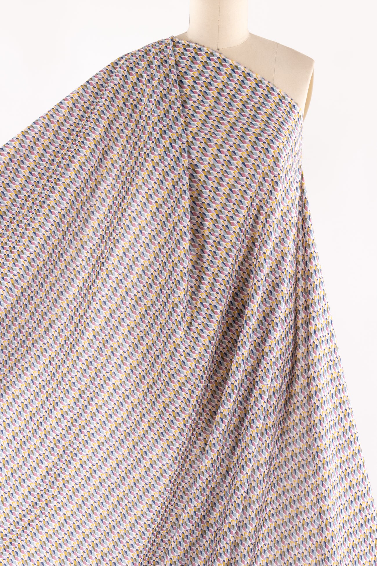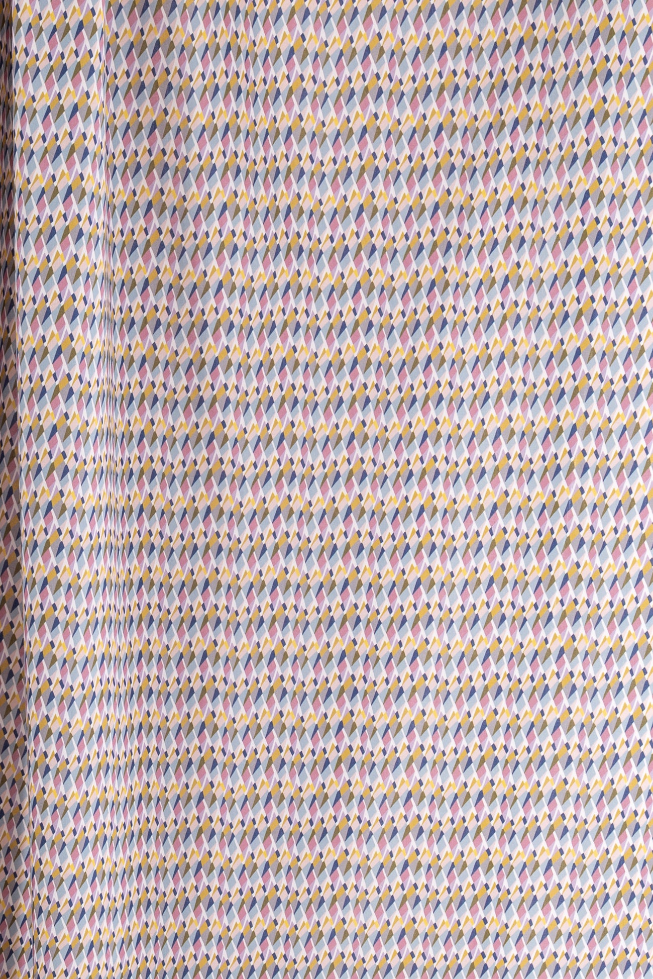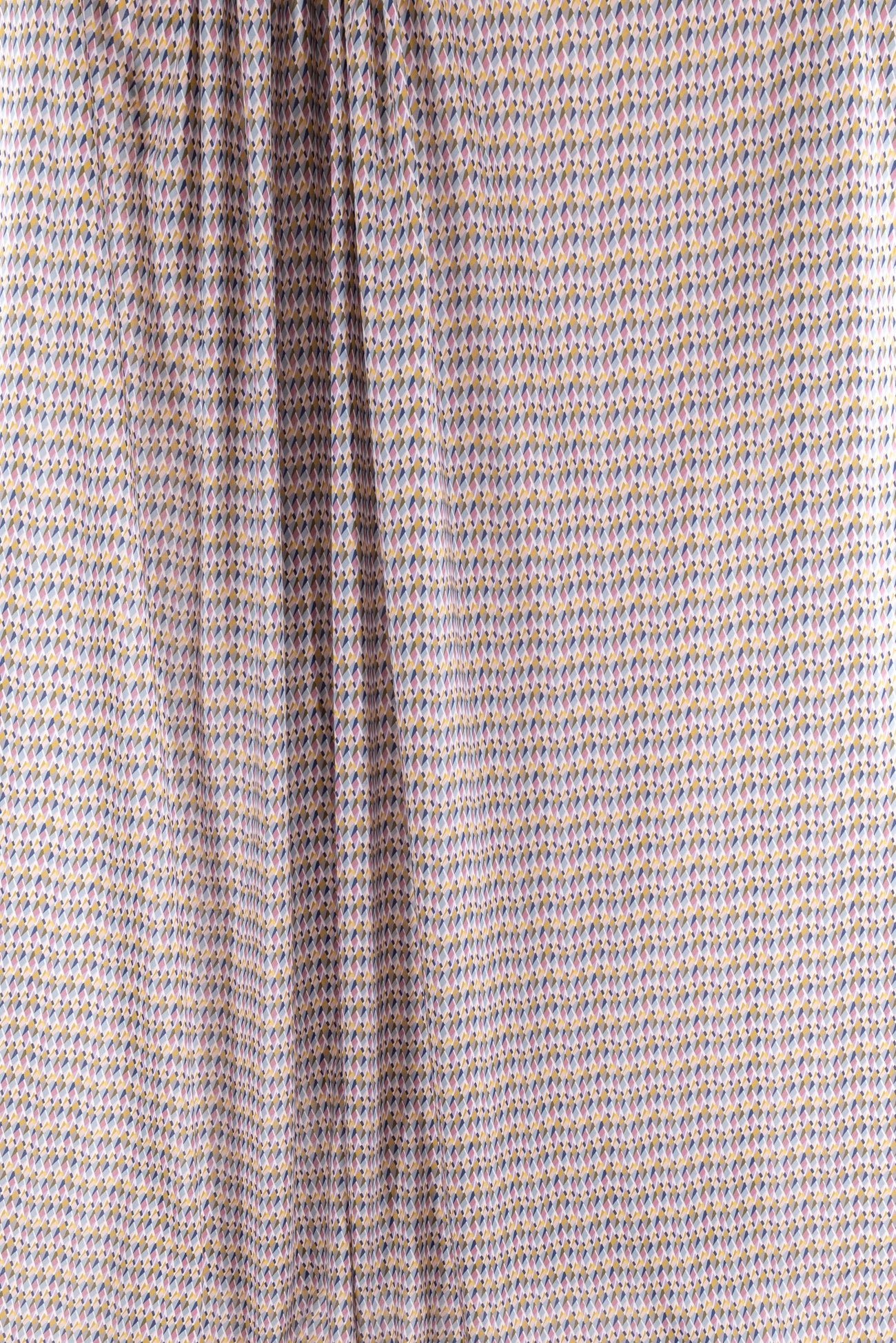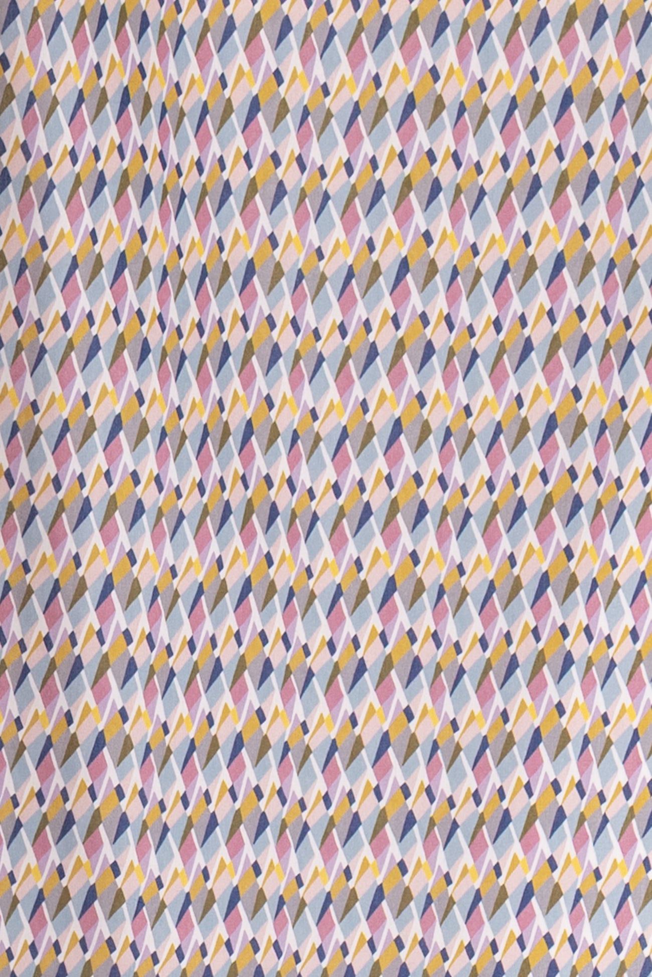 Modern Liberty geometric, tesselated diamond shapes in soft shades of blue, pink, gray, and yellow on a white background. Deadstock from a NYC designer, produced in Northern Italy for Liberty of London, printed on the renowned and exceptional Tana Lawn, the cotton that behaves and feels like silk. Fine-grained, with a cool, smooth, soft hand, fluid drape, depth of color. Perfect for a shirt, dress, skirt, tunic, soft pant, caftan, loungewear, children or men, accessories or home decor. Right to wear everyday or for statement pieces. OEKO-TEX® certified.