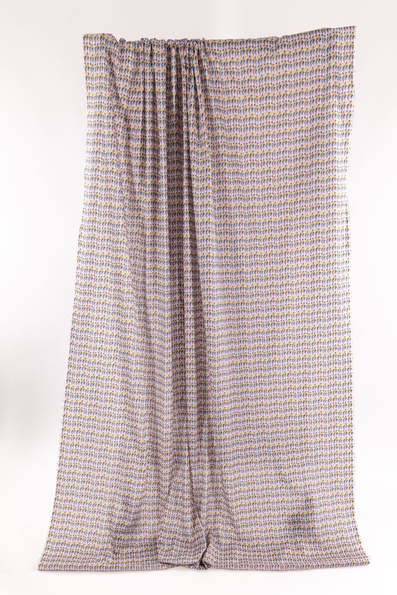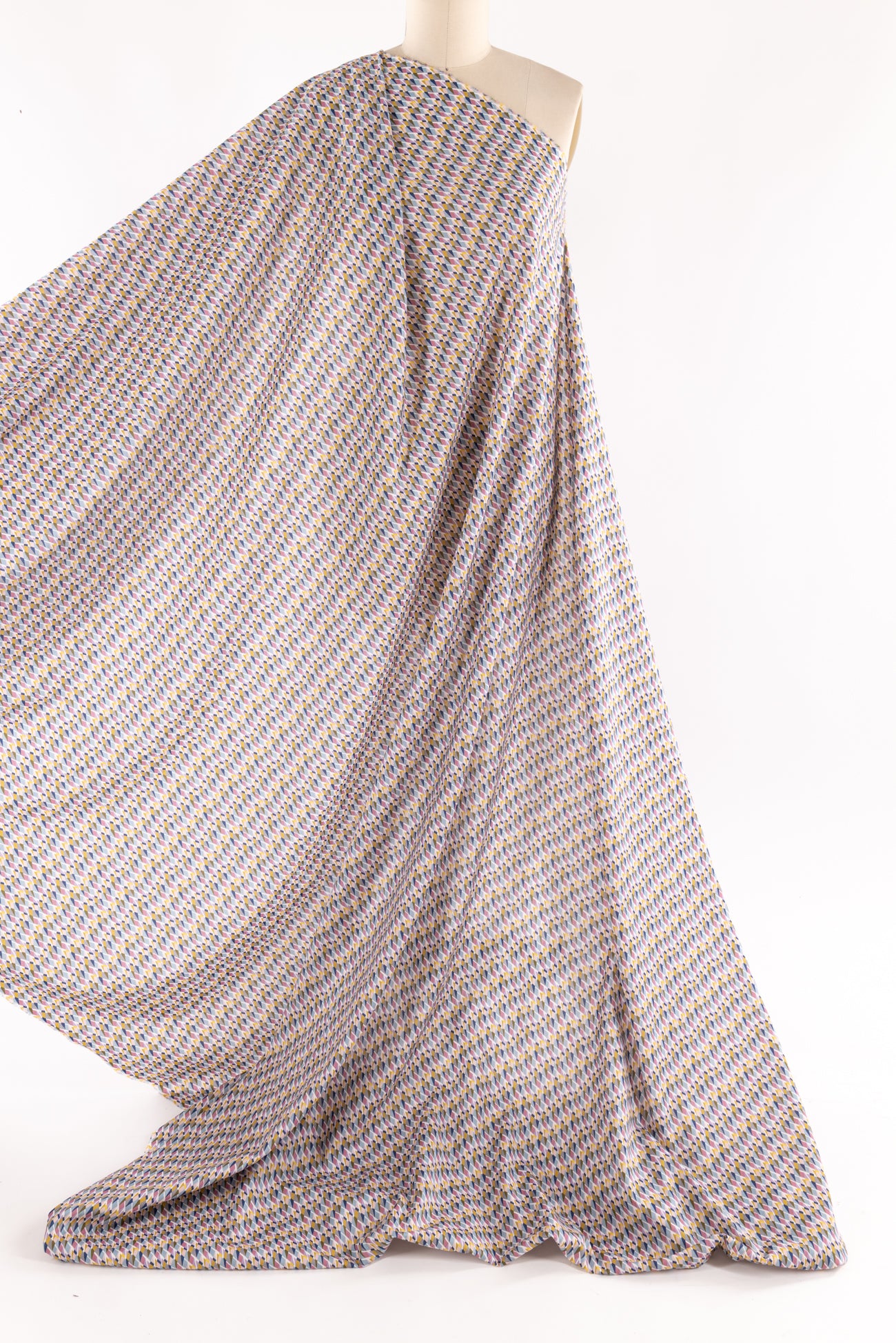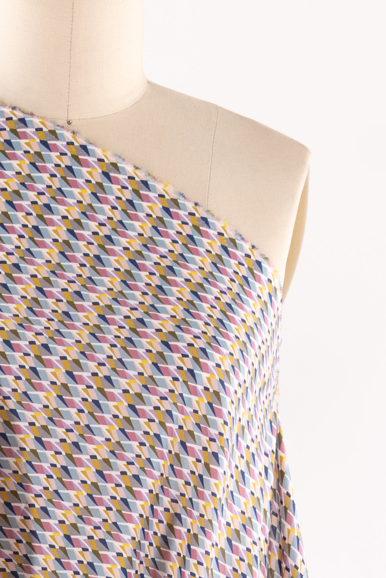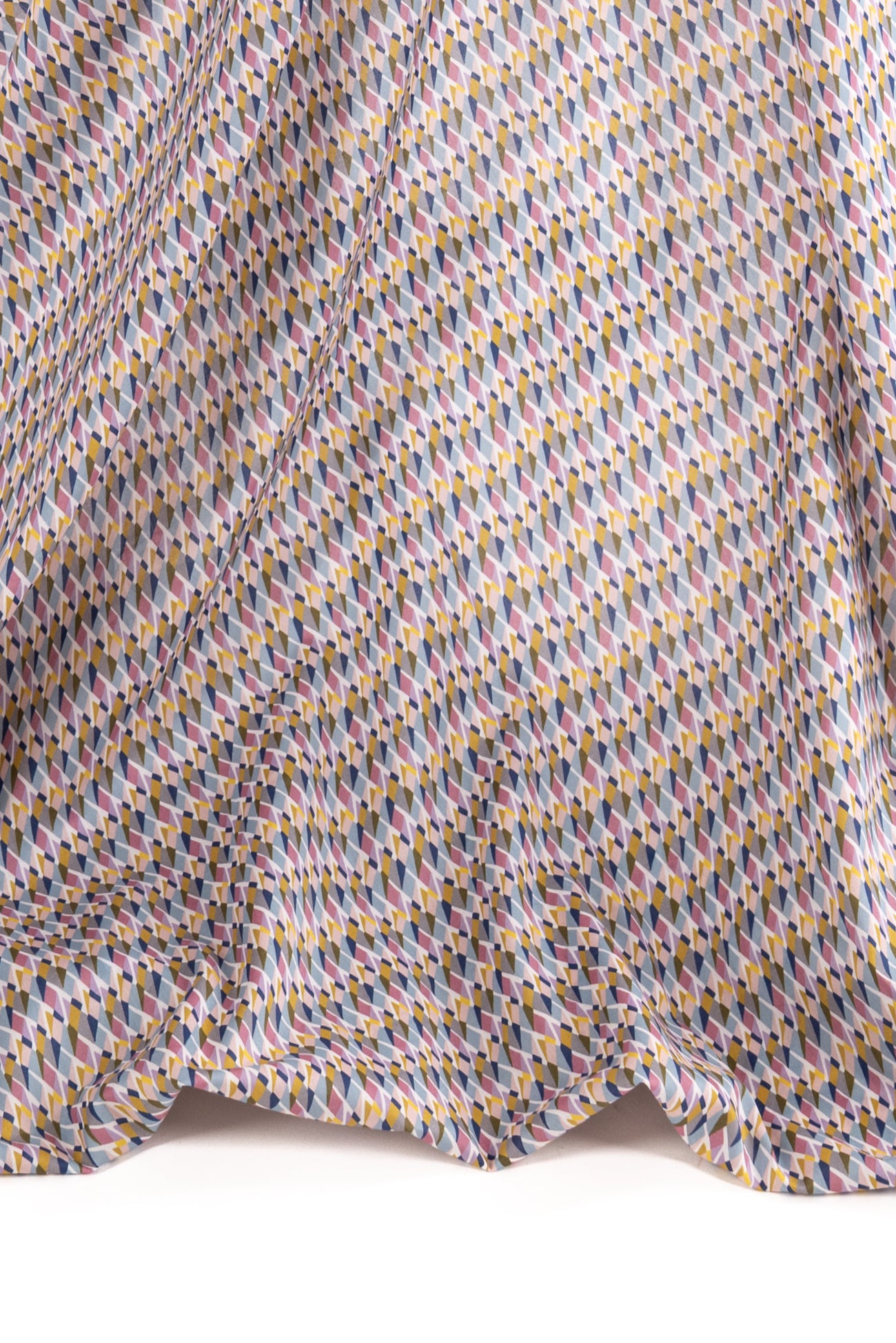 Modern Liberty geometric, tesselated diamond shapes in soft shades of blue, pink, gray, and yellow on a white background. Deadstock from a NYC designer, produced in Northern Italy for Liberty of London, printed on the renowned and exceptional Tana Lawn, the cotton that behaves and feels like silk. Fine-grained, with a cool, smooth, soft hand, fluid drape, depth of color. Perfect for a shirt, dress, skirt, tunic, soft pant, caftan, loungewear, children or men, accessories or home decor. Right to wear everyday or for statement pieces. OEKO-TEX® certified.