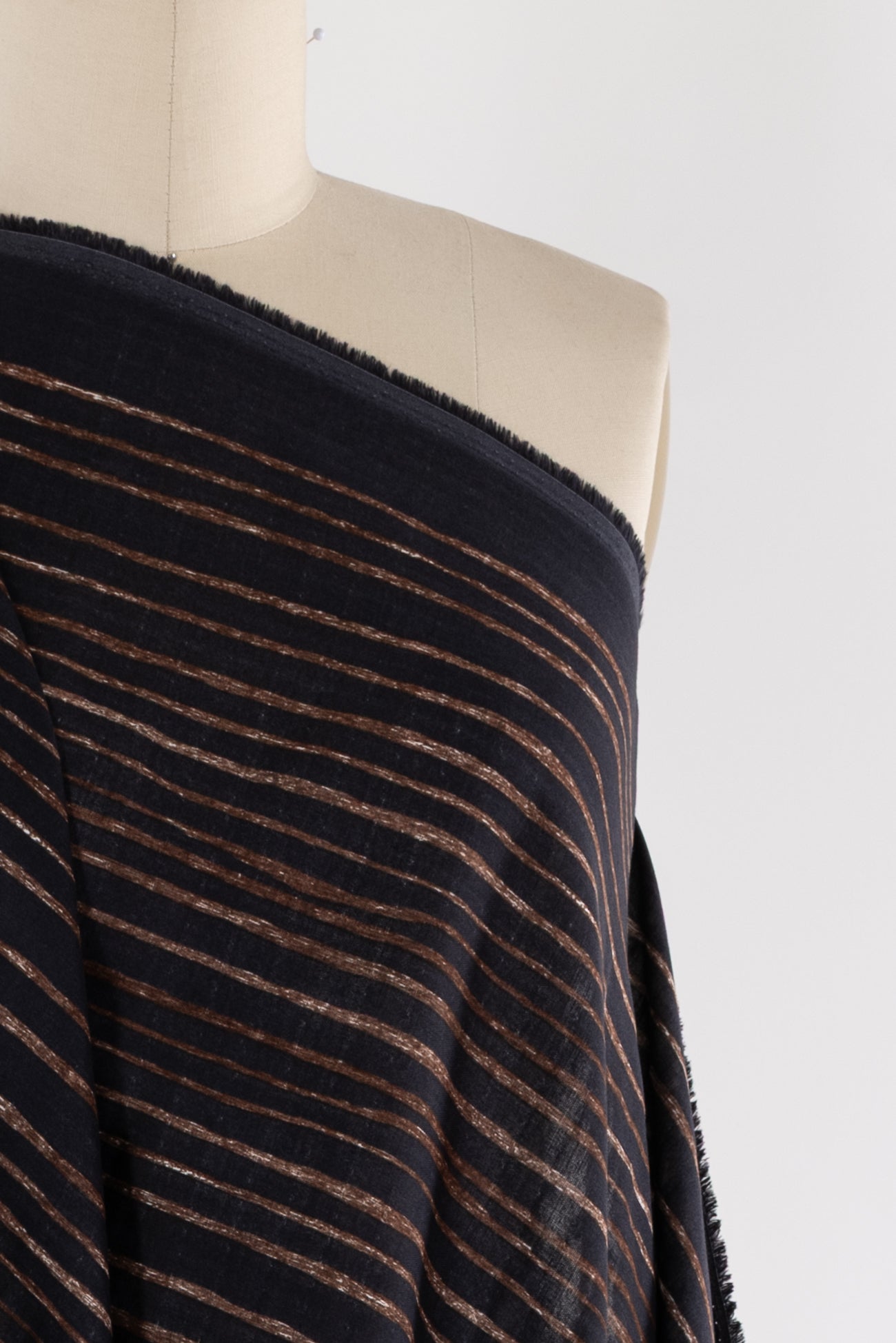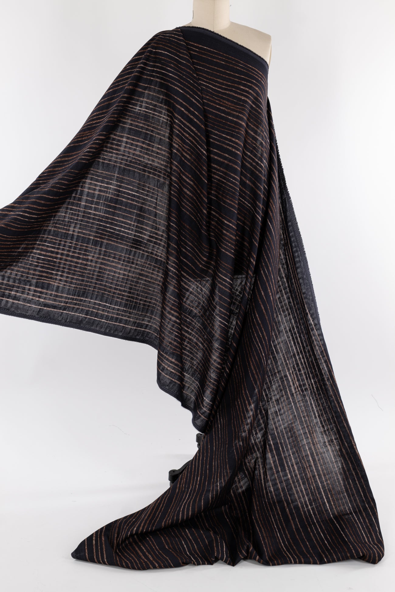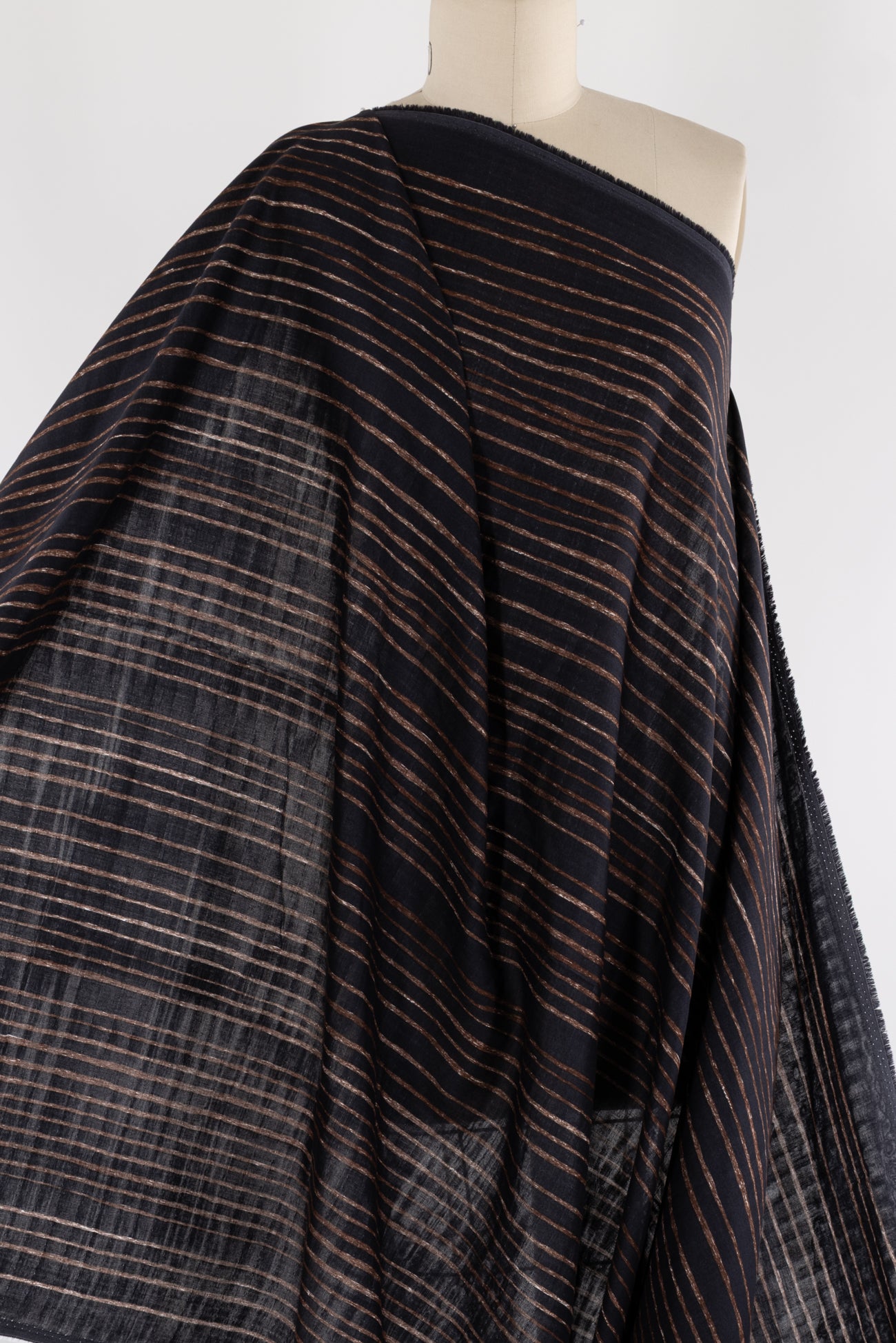 Sophisticated stripes in black and brown with white accents printed on a fine double gauze Japanese cotton. Light/shirting-weight with a smooth hand and soft drape. The unique weave is actually two layers of fine light cotton woven together, joined at regular intervals, and the effect is airy yet opaque and stable; a popular clothing fabric in Japan, as it is breathable, supple, soft, and very comfortable in both cool and warm weather, a pleasure to sew with and to wear. Lightweight and right for both tops and bottoms, a dress, tunic, shirt, light jacket, vest, kimono, caftan, duster coat, soft pants, or children's clothes. Makes lovely accessories as well -- small bags, pot holders, table linens, etc.
