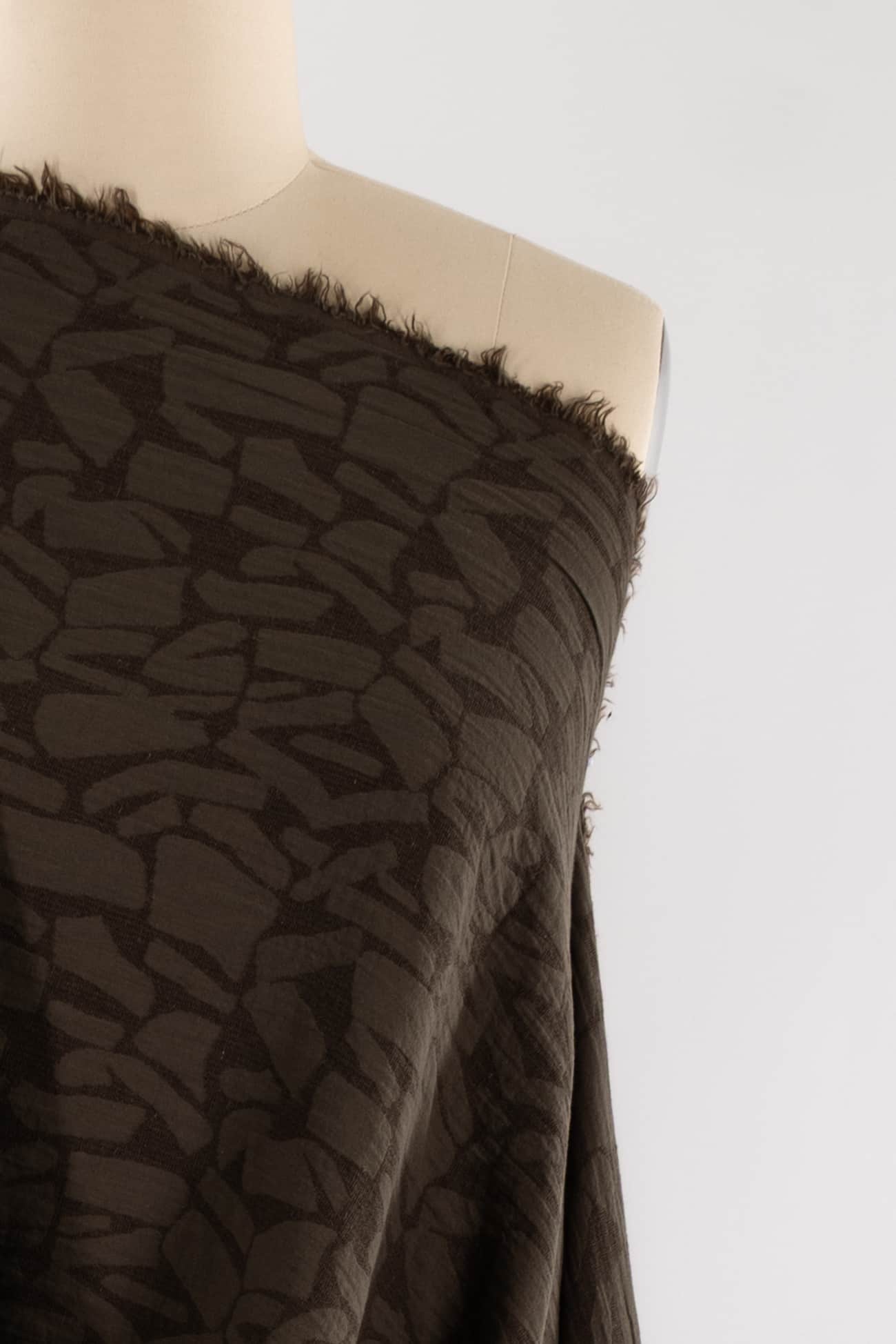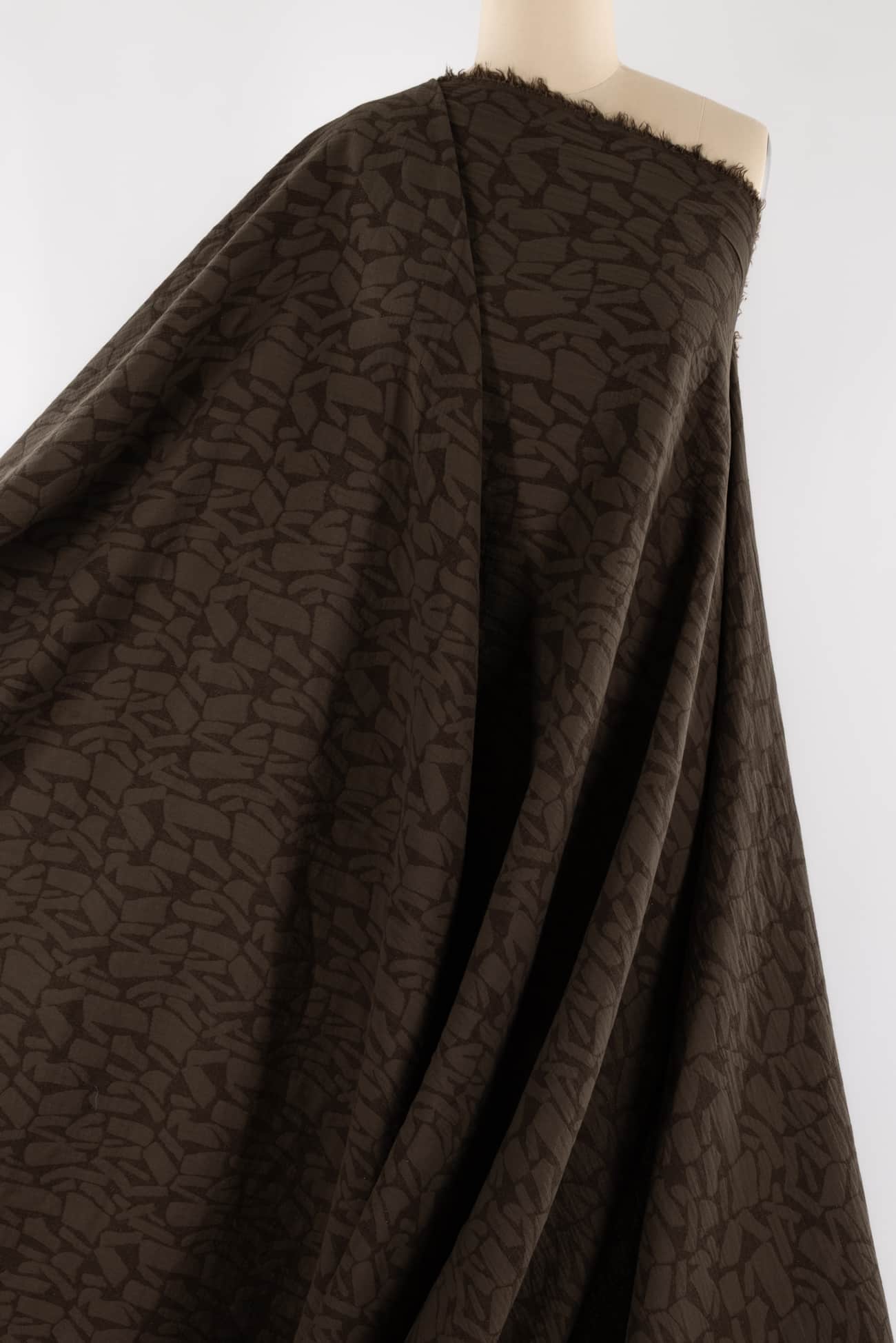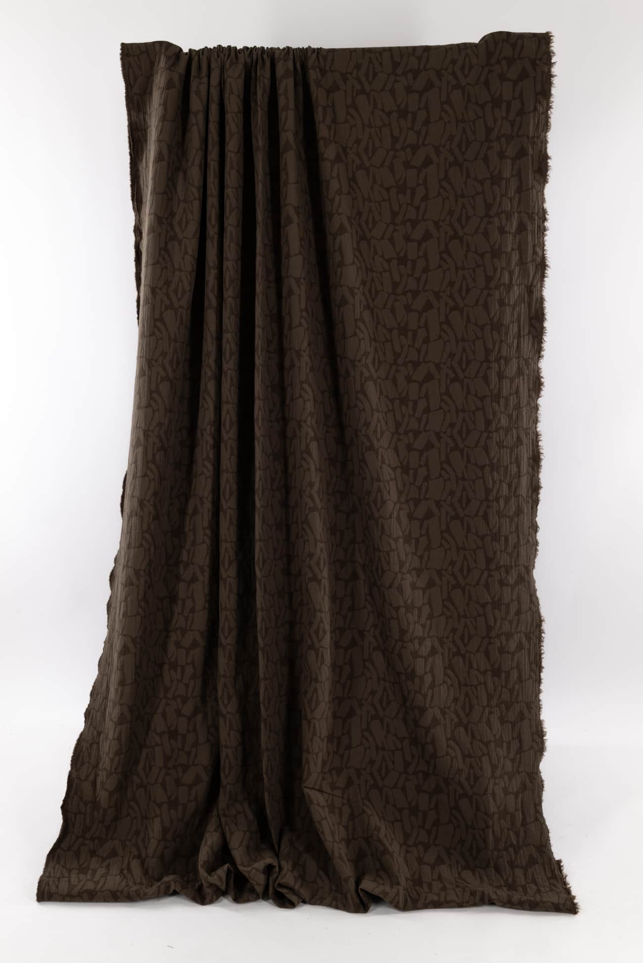 Quietly beautiful in all ways, rich olive cotton blend jacquard has a softly textured abstract/organic geometric woven in all-over design. Light suiting weight with a touch of depth, subtle texture, soft hand, and malleable drape. Use either or both sides. Feels delicious, no wrinkling, ideal for a jacket, vest, duster coat, or structured dress. Marcy says, 'Perfect for travel, ideal for a layering piece to dress up or down.'