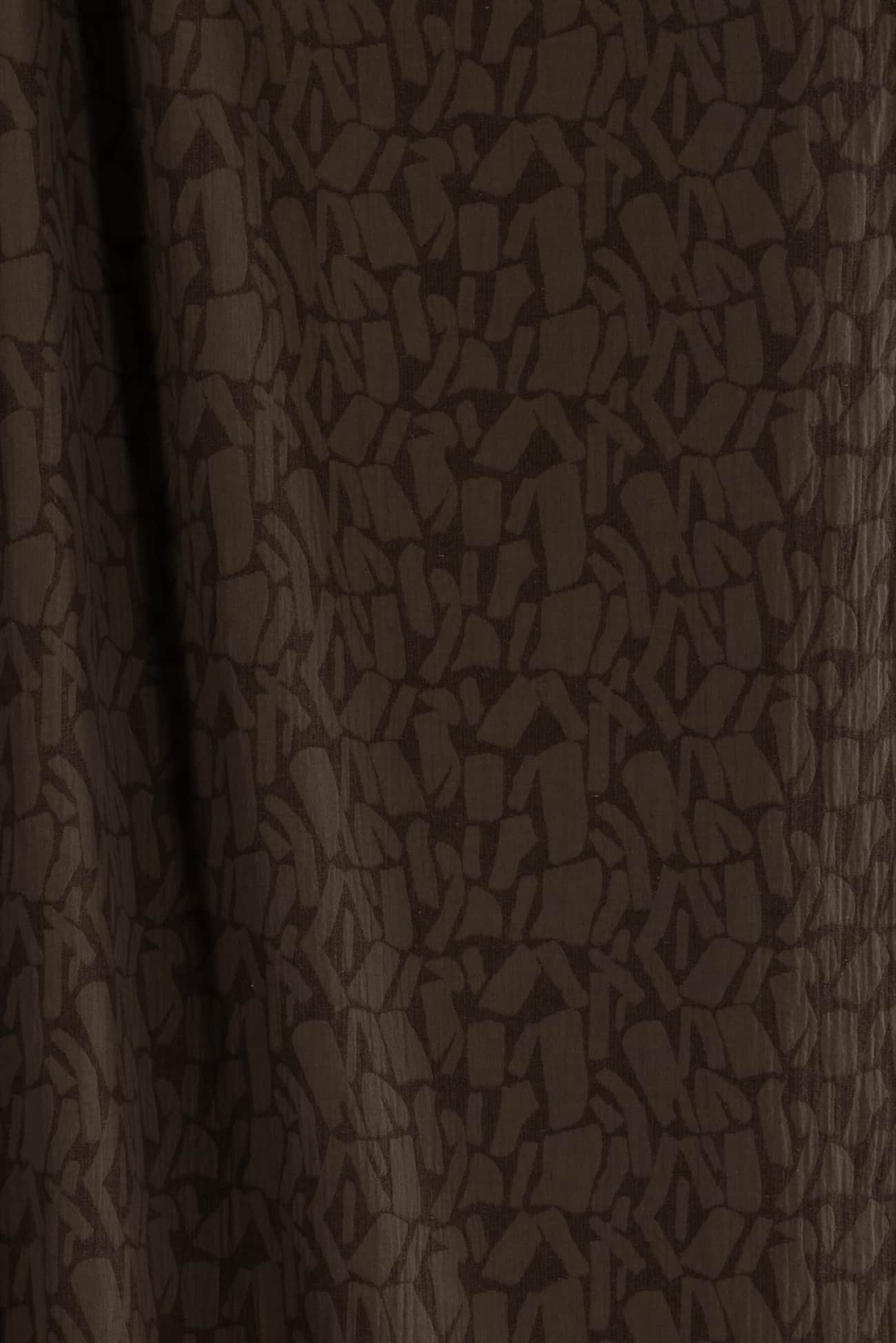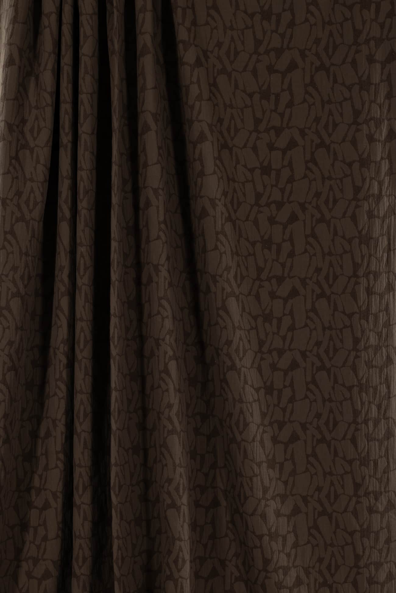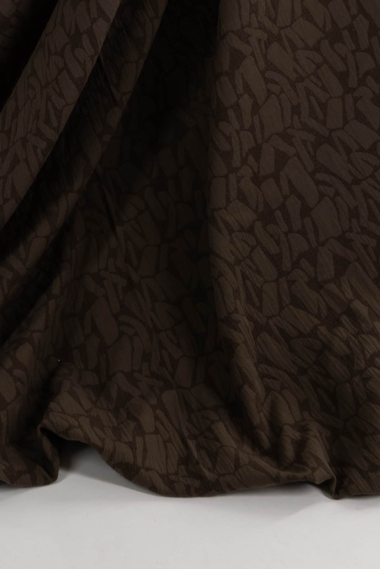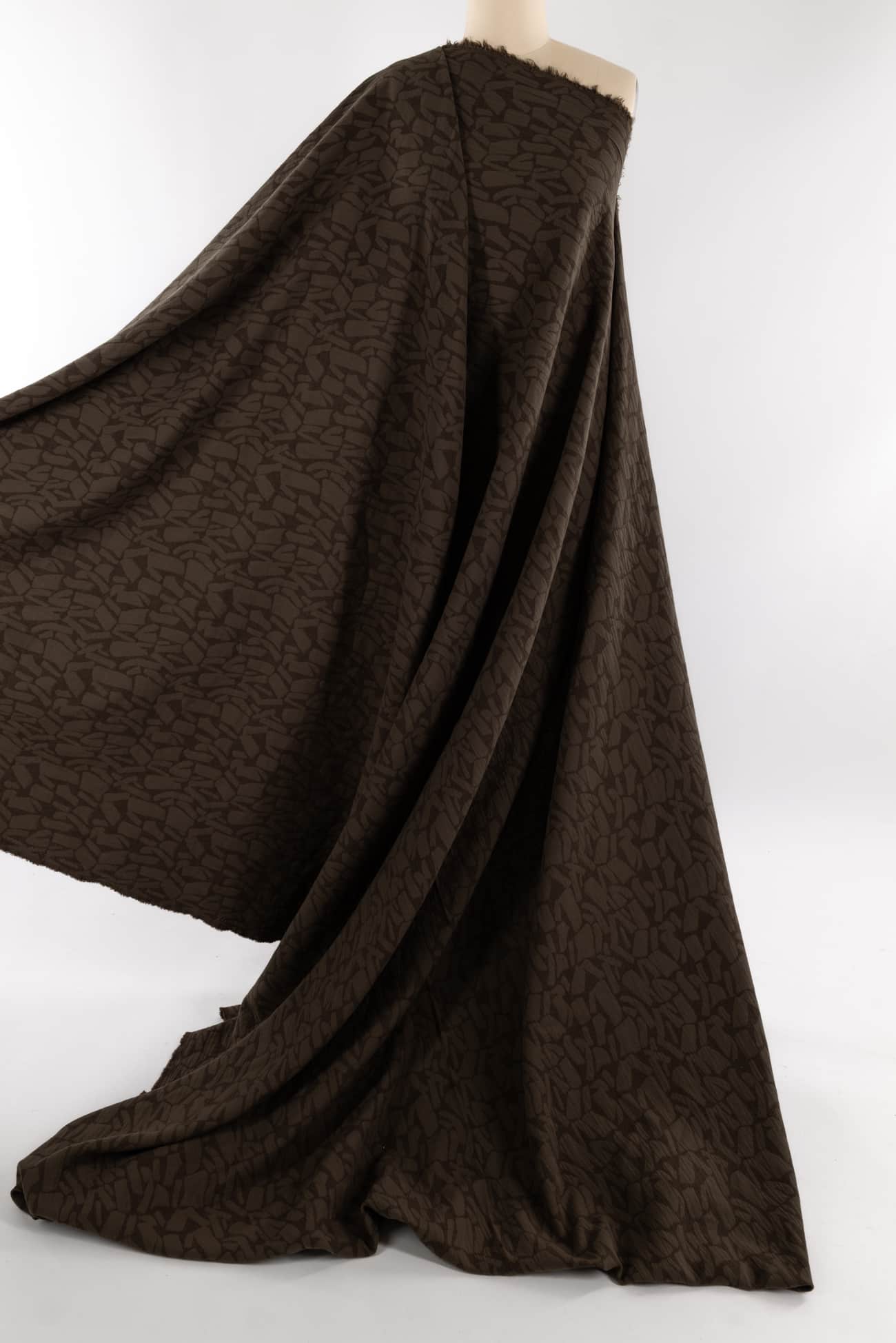 Quietly beautiful in all ways, rich olive cotton blend jacquard has a softly textured abstract/organic geometric woven in all-over design. Light suiting weight with a touch of depth, subtle texture, soft hand, and malleable drape. Use either or both sides. Feels delicious, no wrinkling, ideal for a jacket, vest, duster coat, or structured dress. Marcy says, 'Perfect for travel, ideal for a layering piece to dress up or down.'