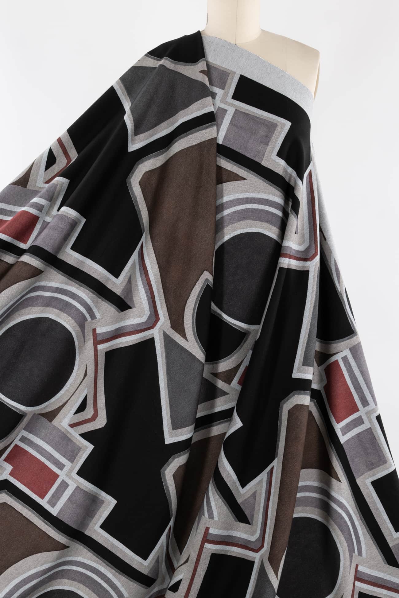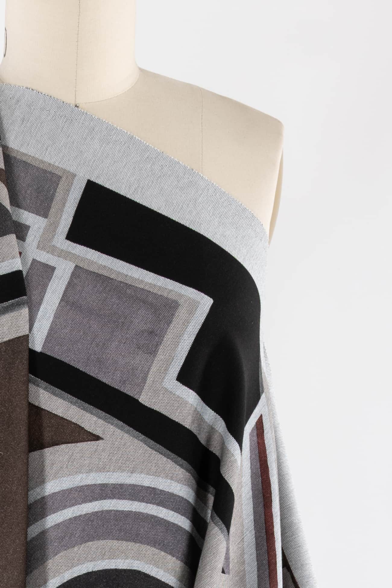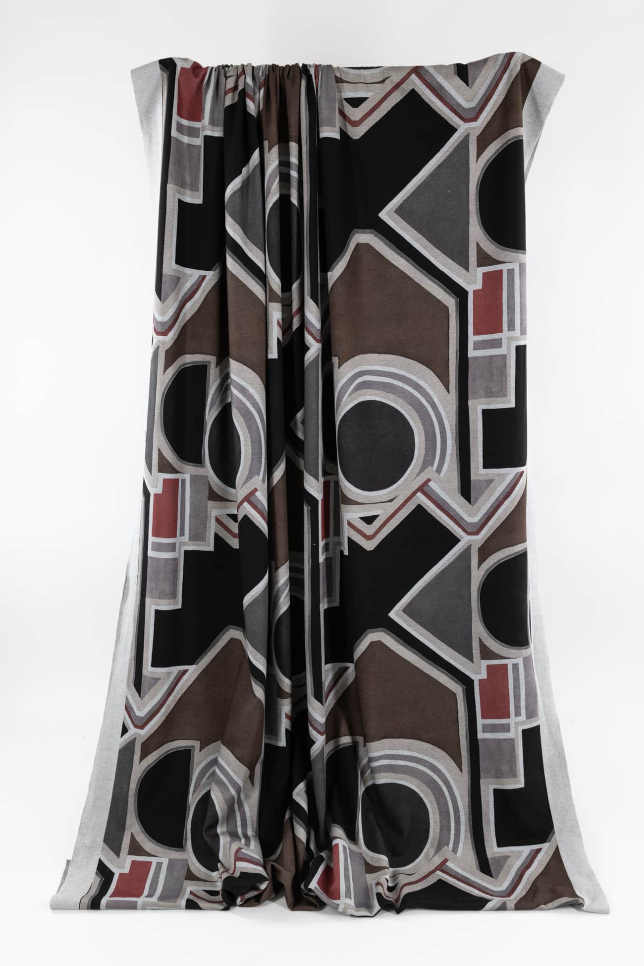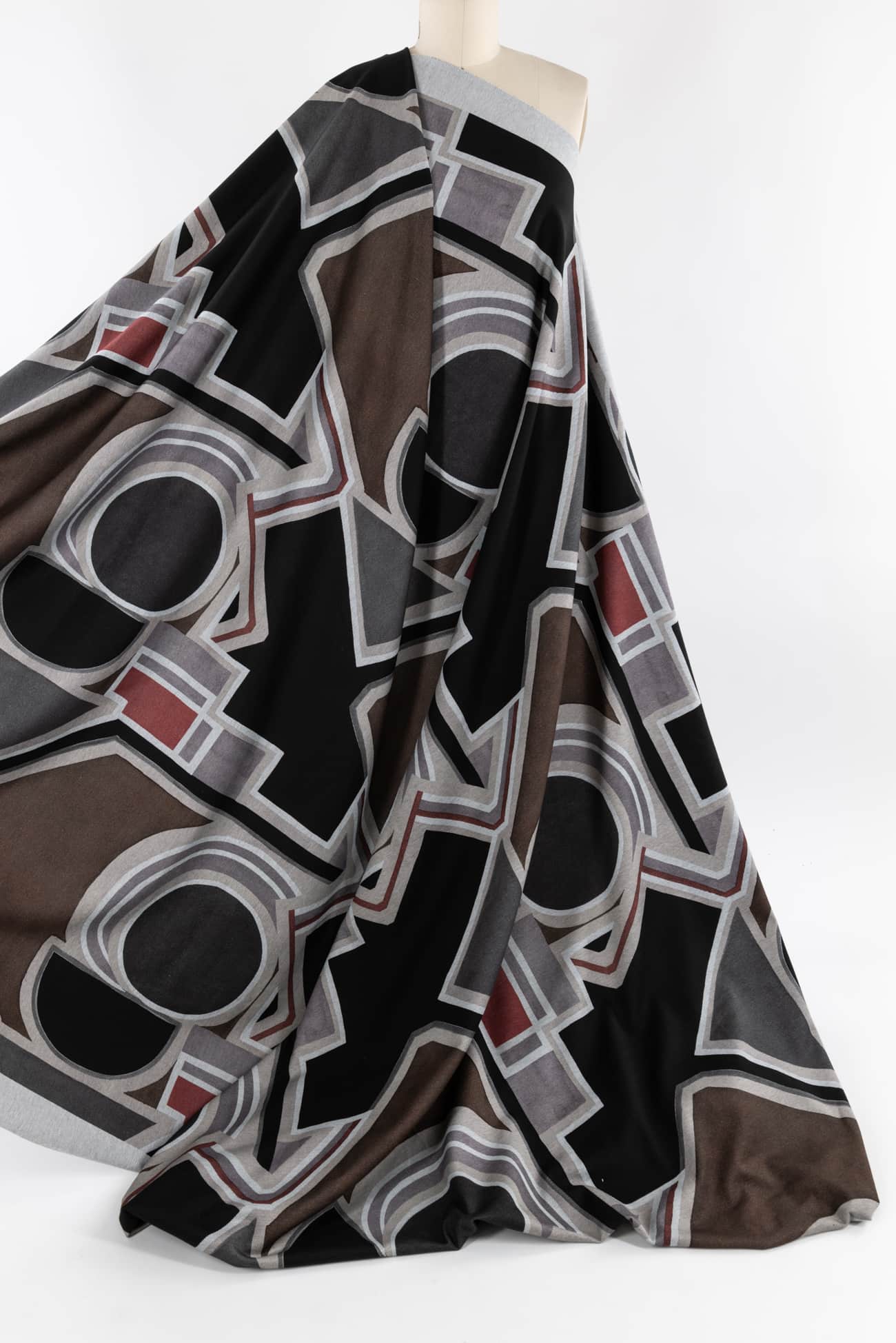 Stunning geometric design in black, brown, gray, rust-red is digitally printed on a marled gray background, produced in Italy and used by design house Marni in their 'grunge' collection. Beautiful quality ponte is midweight, stable, with a smooth hand and soft drape, reverses to gray marled, crosswise stretch. No raveling, so no seam finish required, easy to sew. One way design, 32" repeat. Right for a jacket, duster coat, vest, tunic, t-shirt, cardigan, skirt, pants.