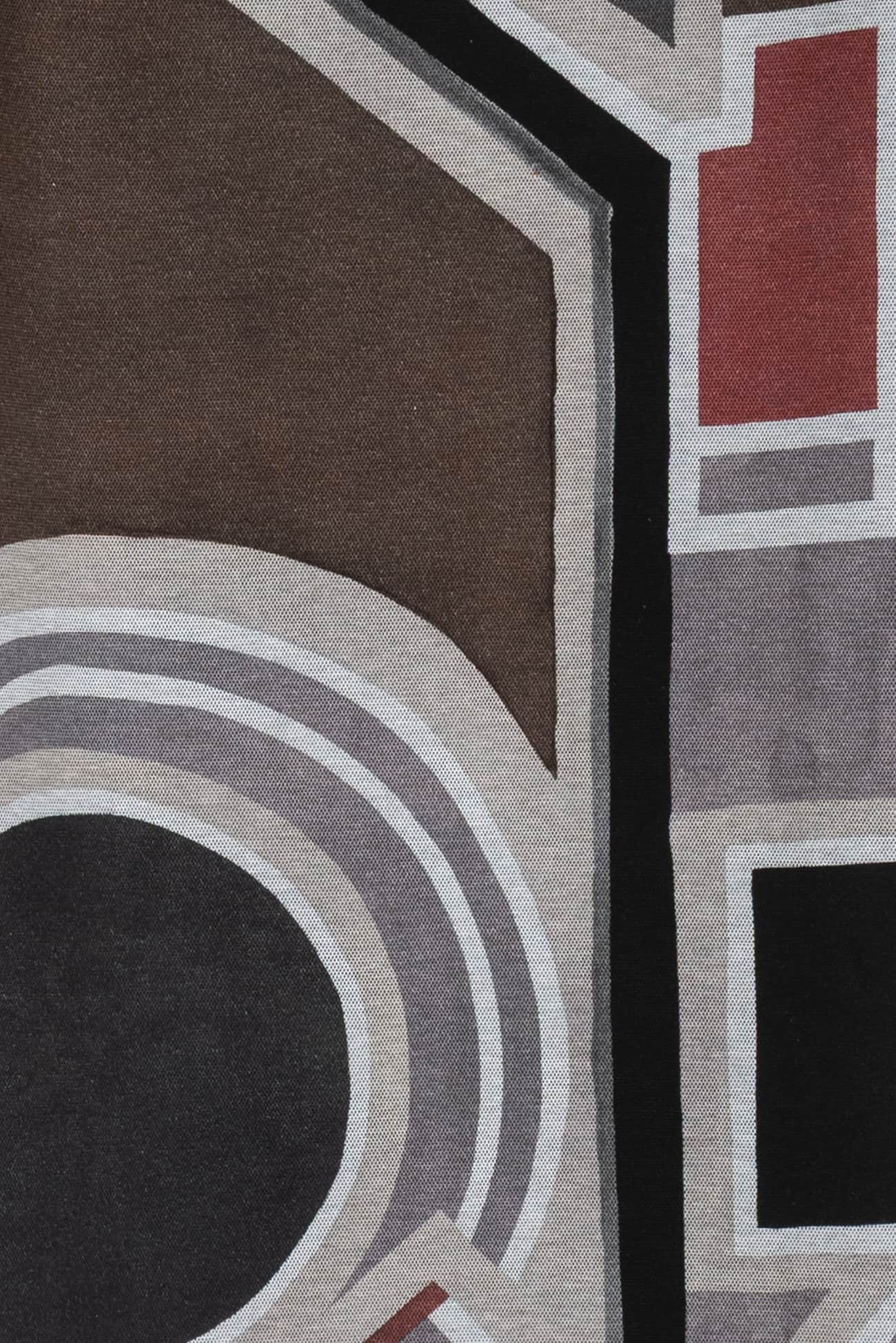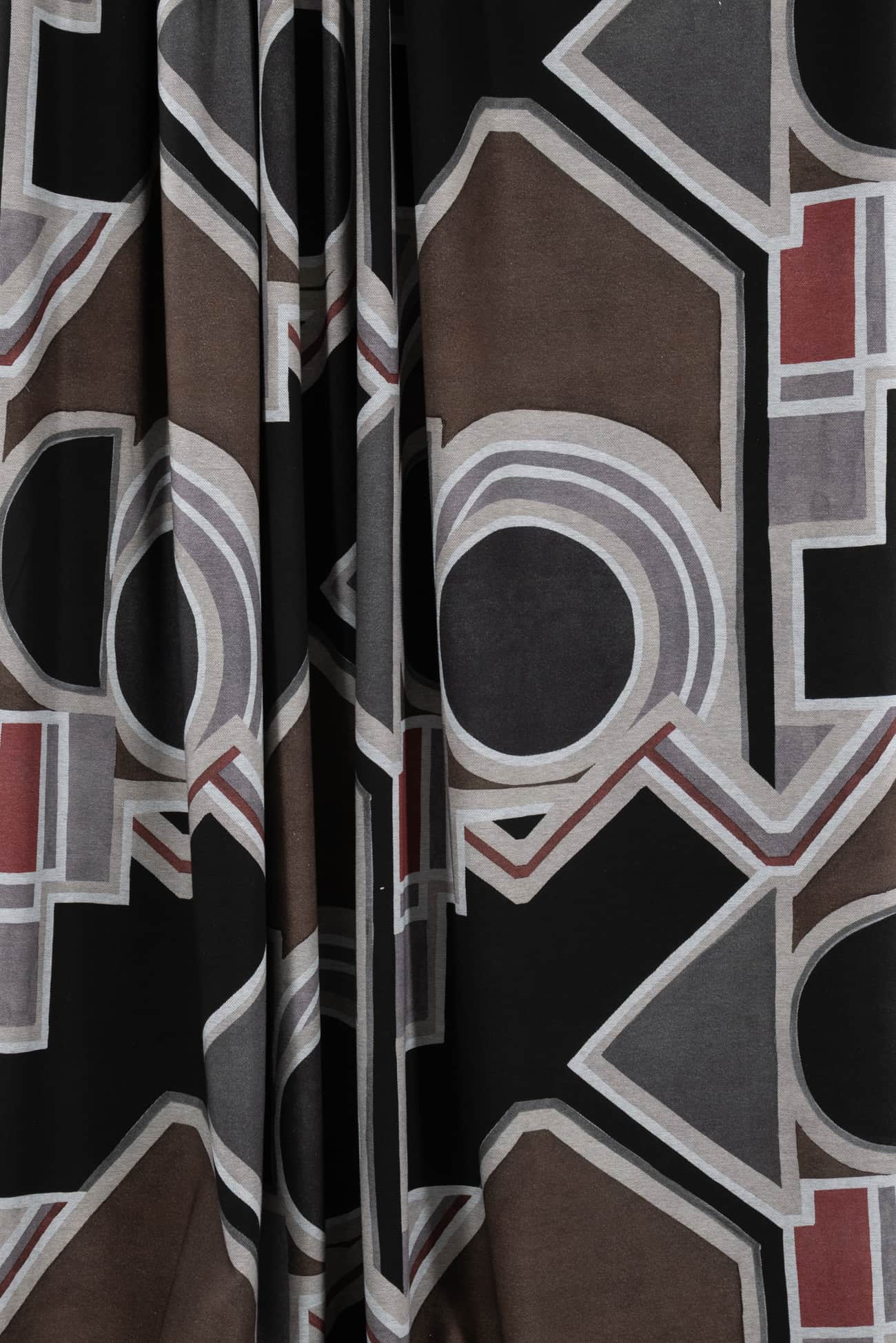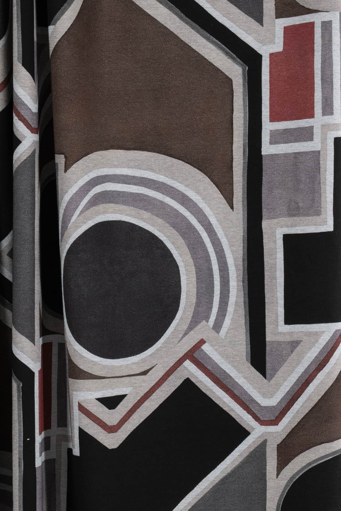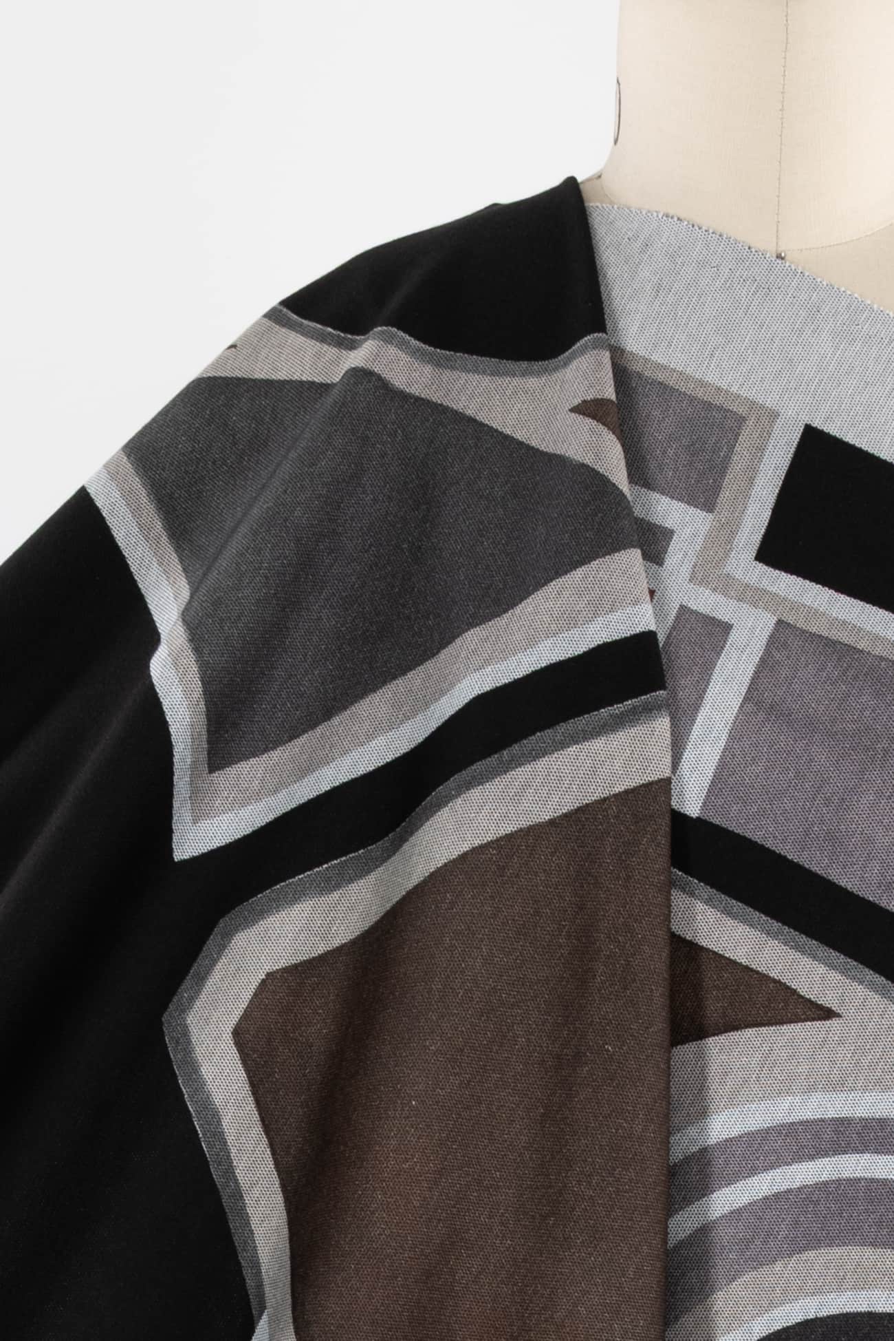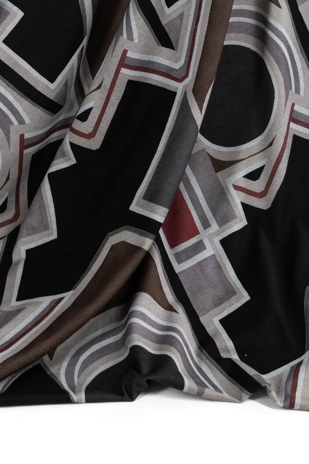 Stunning geometric design in black, brown, gray, rust-red is digitally printed on a marled gray background, produced in Italy and used by design house Marni in their 'grunge' collection. Beautiful quality ponte is midweight, stable, with a smooth hand and soft drape, reverses to gray marled, crosswise stretch. No raveling, so no seam finish required, easy to sew. One way design, 32" repeat. Right for a jacket, duster coat, vest, tunic, t-shirt, cardigan, skirt, pants.