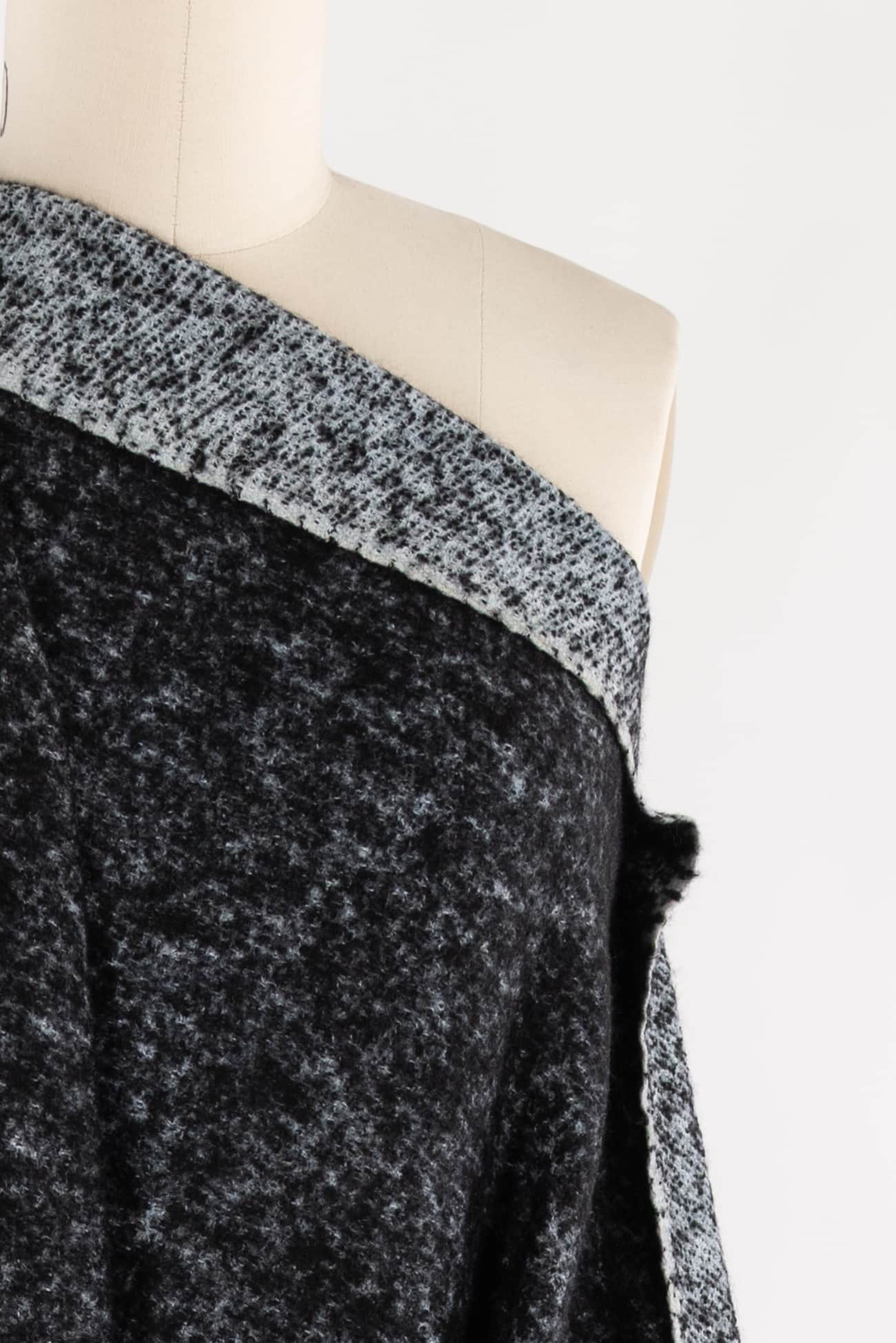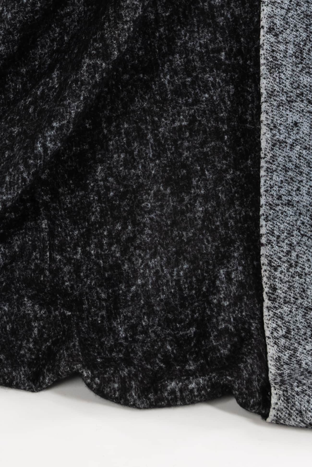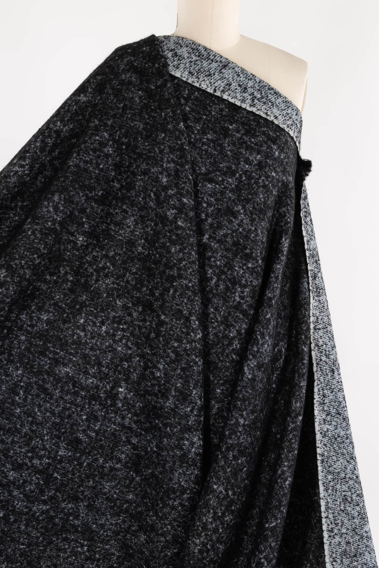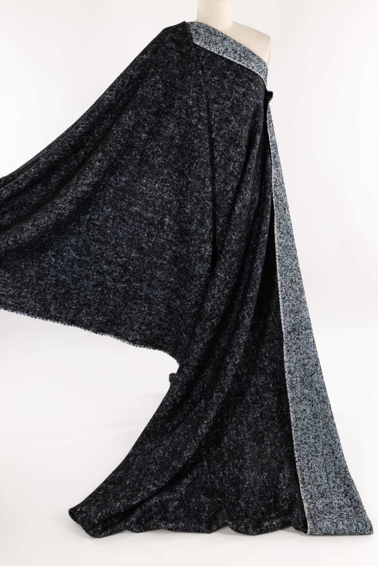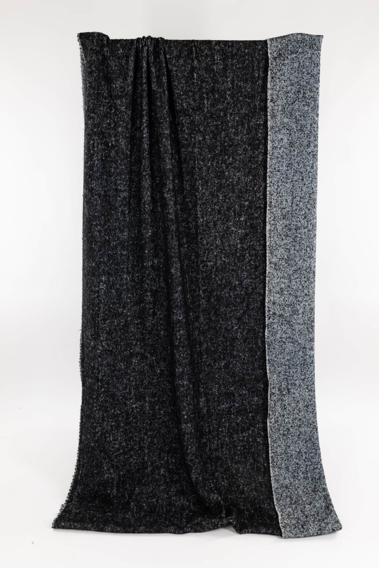 Splendid contemporary take on a classic; lusciously soft black with subtle teal brushed wool blend tweed, deadstock from an LA designer. Mid-heavyweight, stable, with a brushed cozy hand on the black dominant side, a lightly textured teal dominant hand on the reverse side and a light drape. Right for a jacket, coat, vest or accessories.