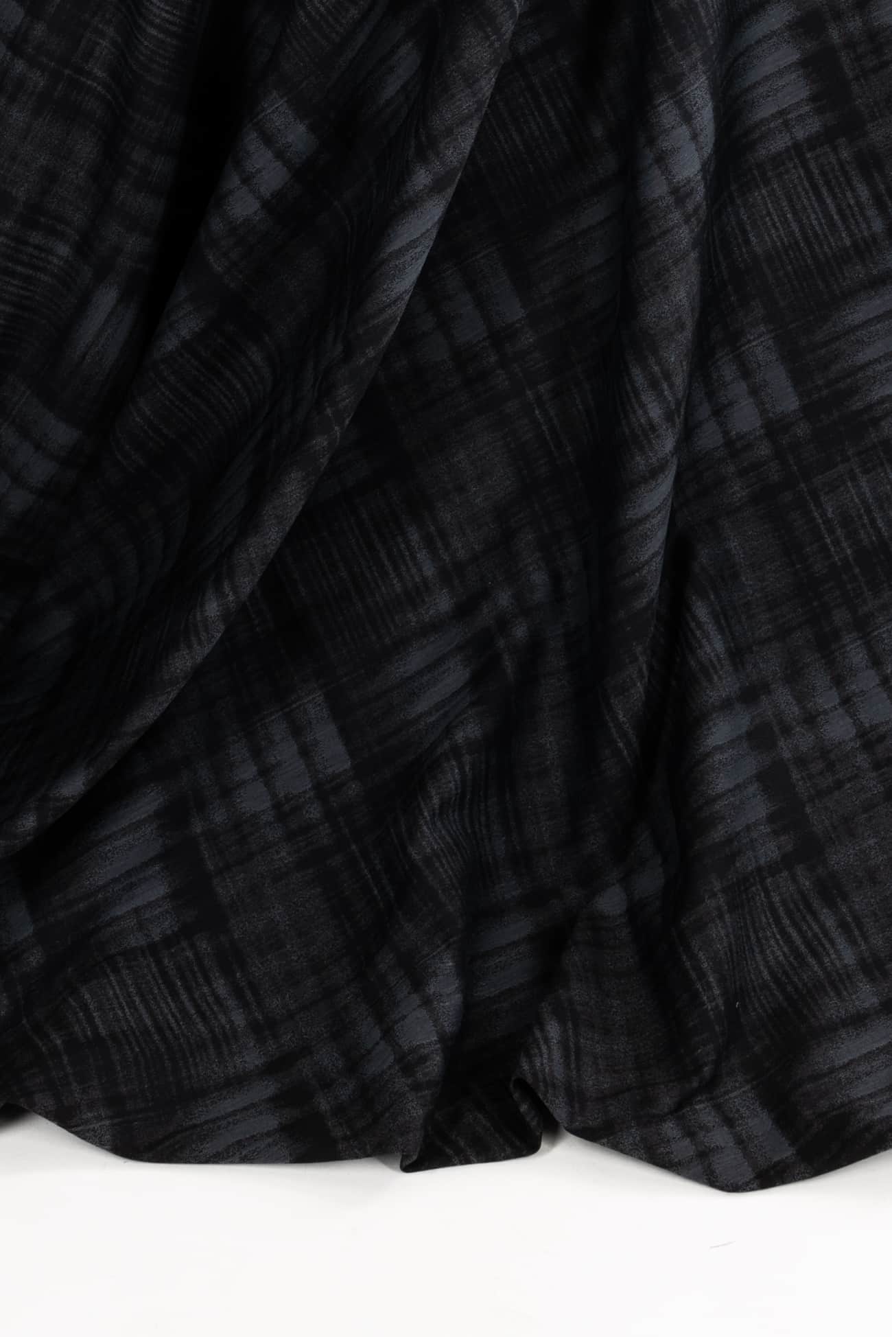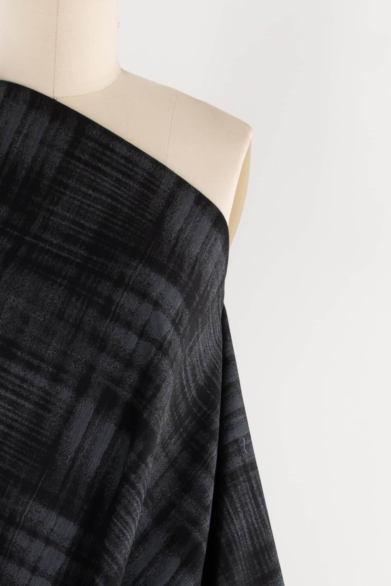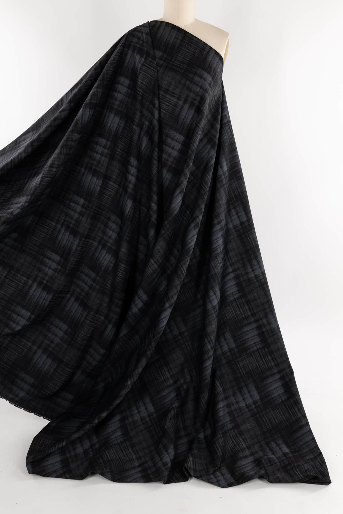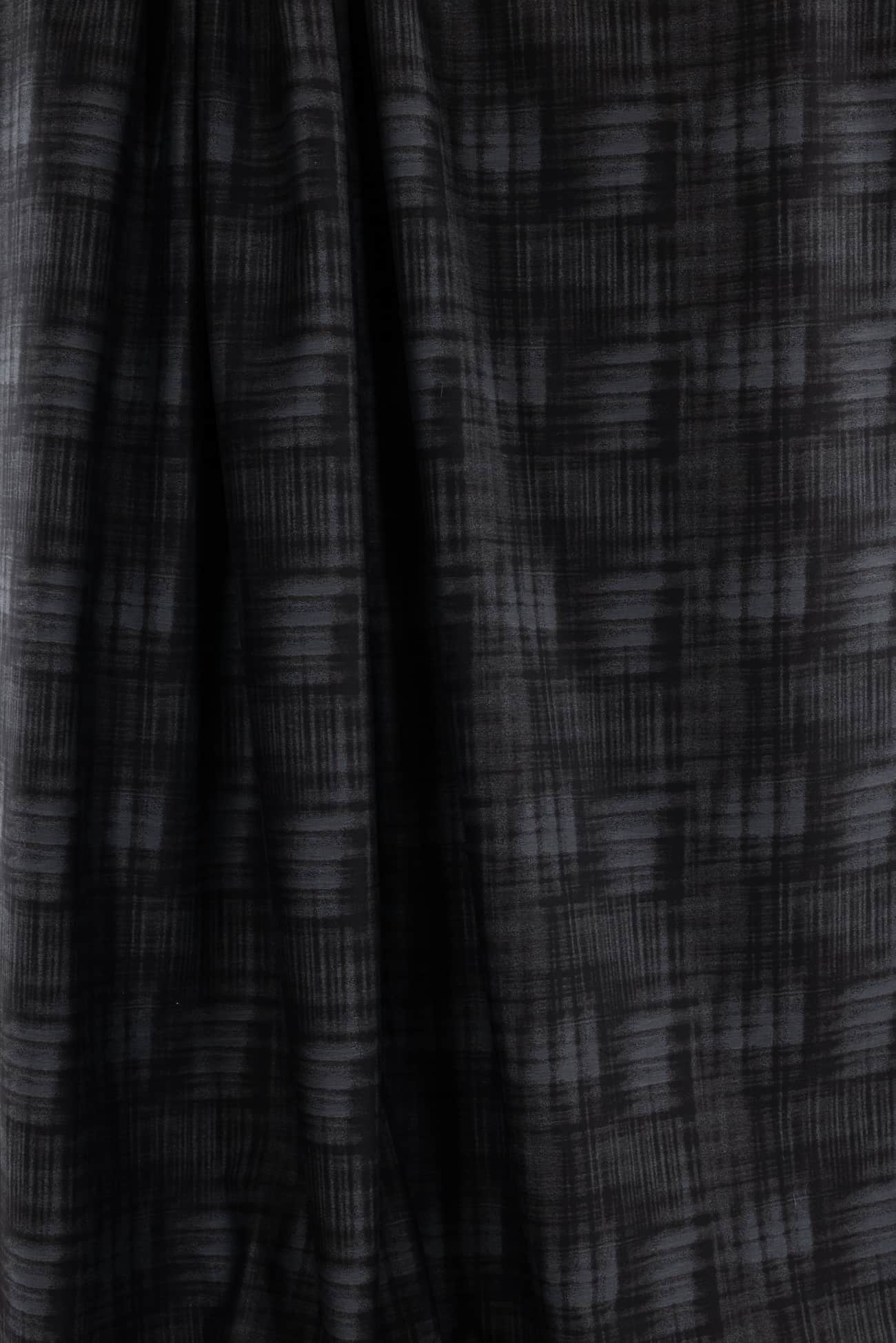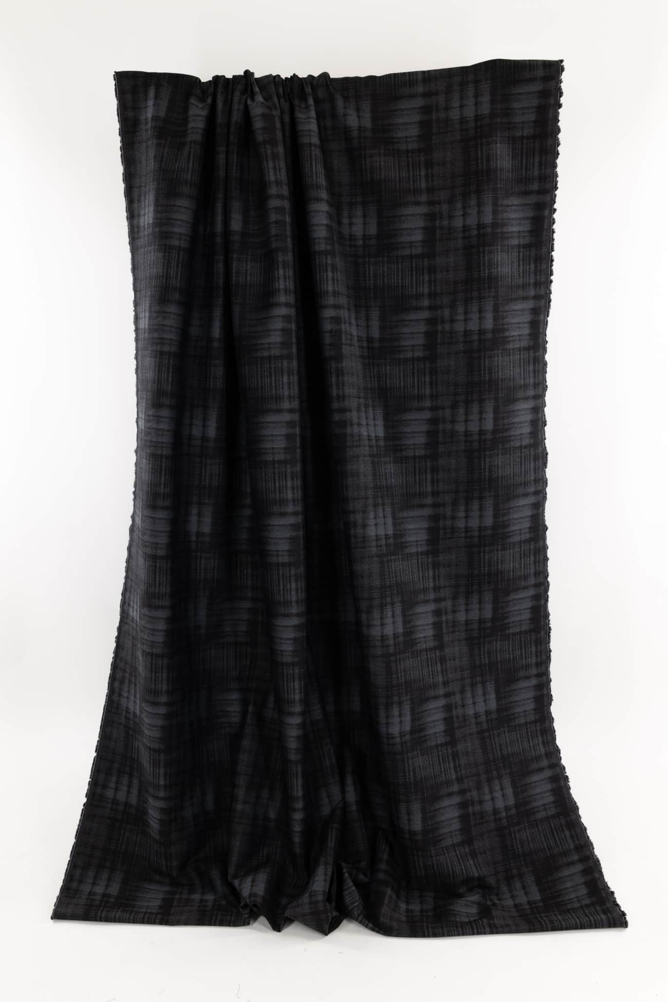 Contemporary black and gray mysterious muted jacquard in a fine wool/cotton blend, superior quality deadstock from an Italian mill. The base fabric is mid-weight, with a smooth dry hand, light drape, a 7½" repeat and reverses to more gray on the back side. Could be used for both tops and bottoms; to line or not. Right for a shirt, light jacket, vest or coat, dress, skirt, soft pant, kimono or men's.