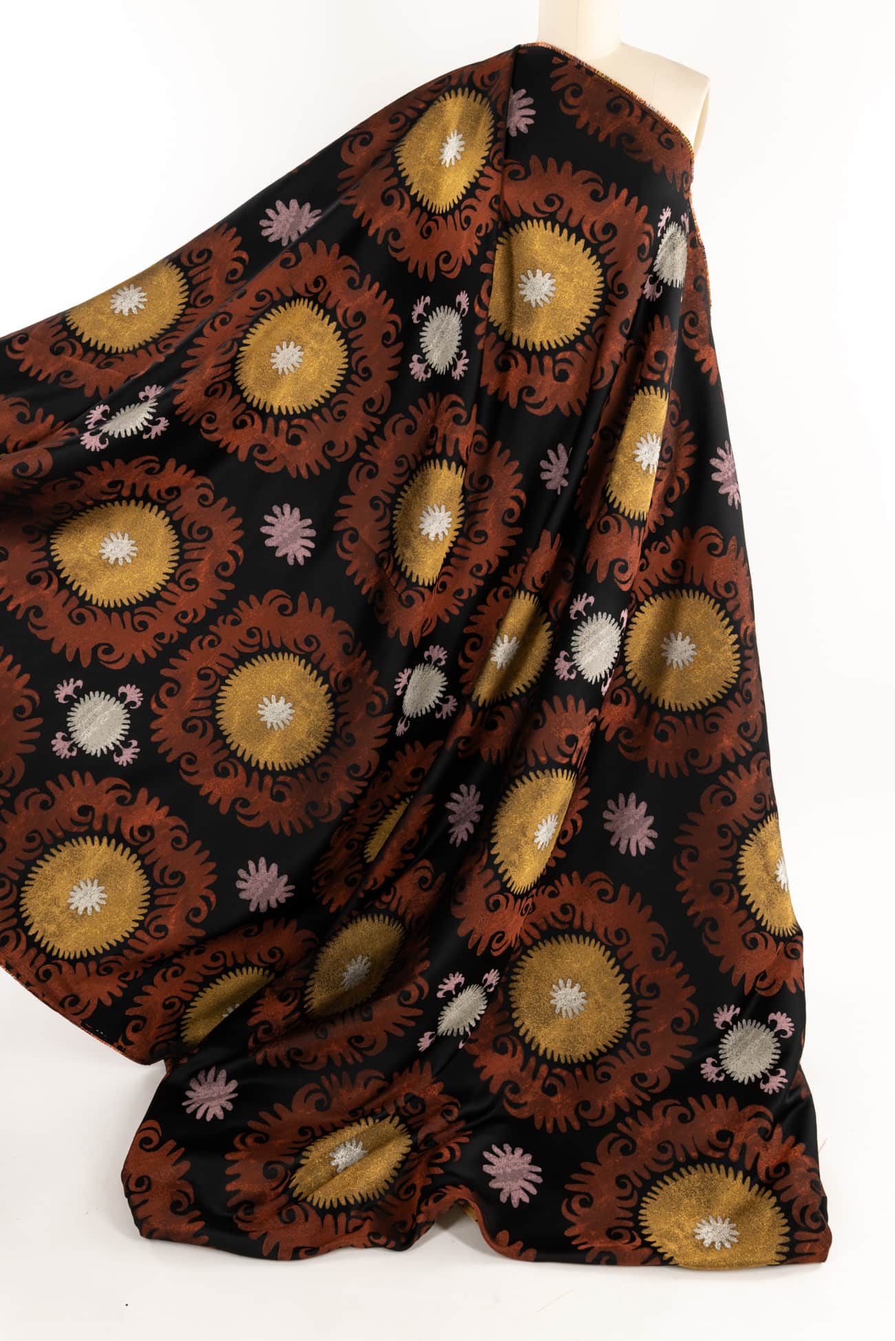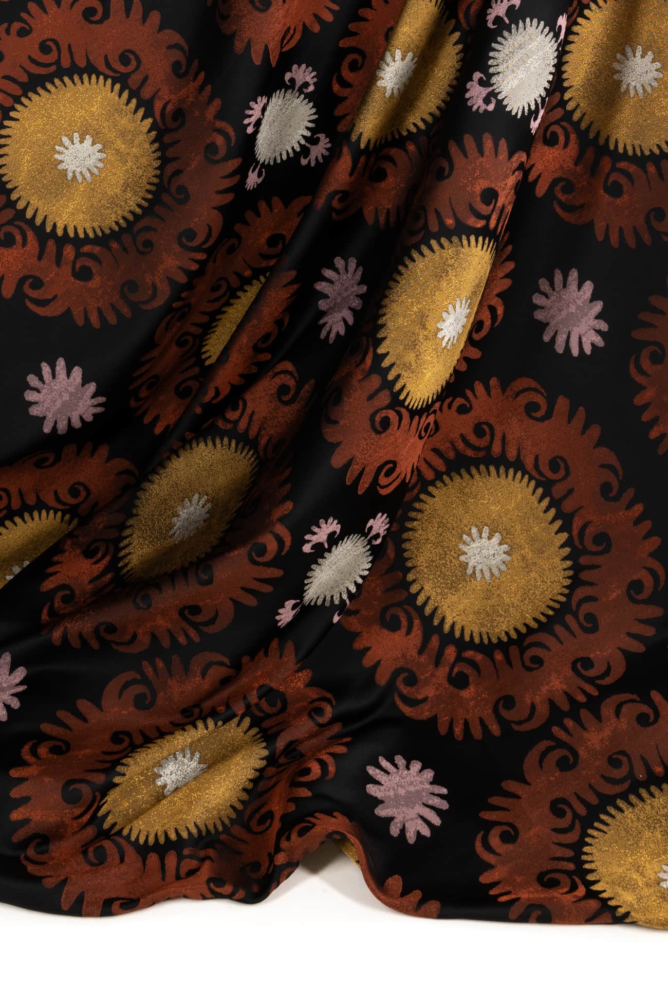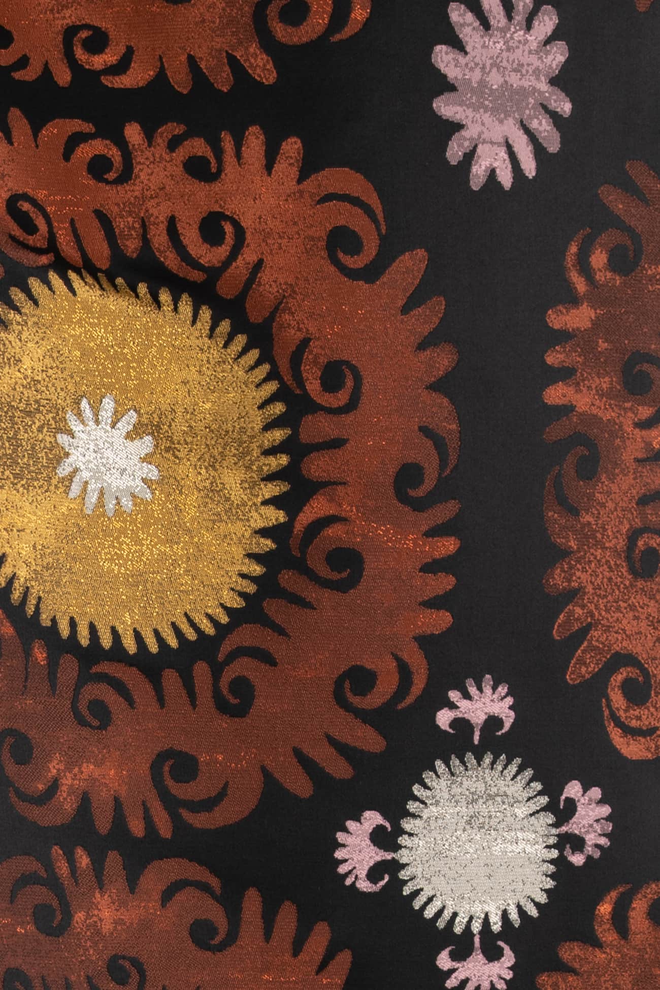 Dramatic brocade in glowing warm tones of rust, gold and silver on a black background, deadstock from a NY designer. Mid weight with a smooth hand and sculptural crisp drape. Right for a coat, jacket, vest, structured dress, skirt, accessories and home decor.