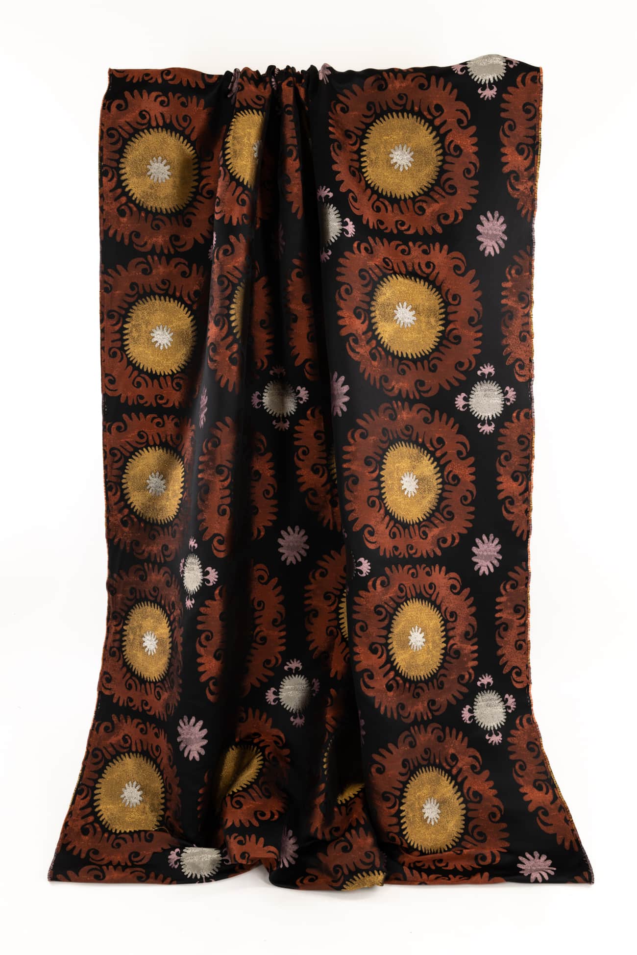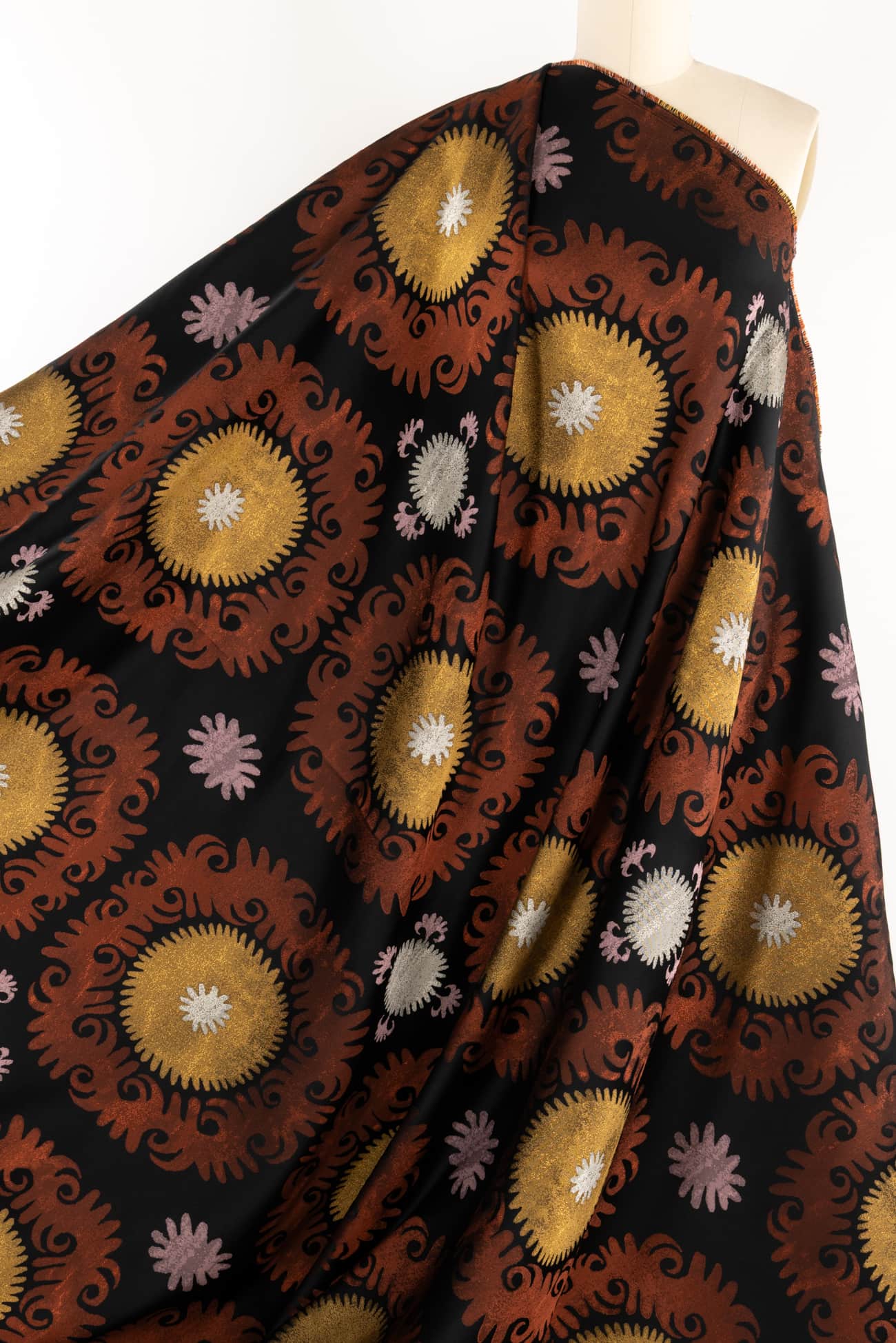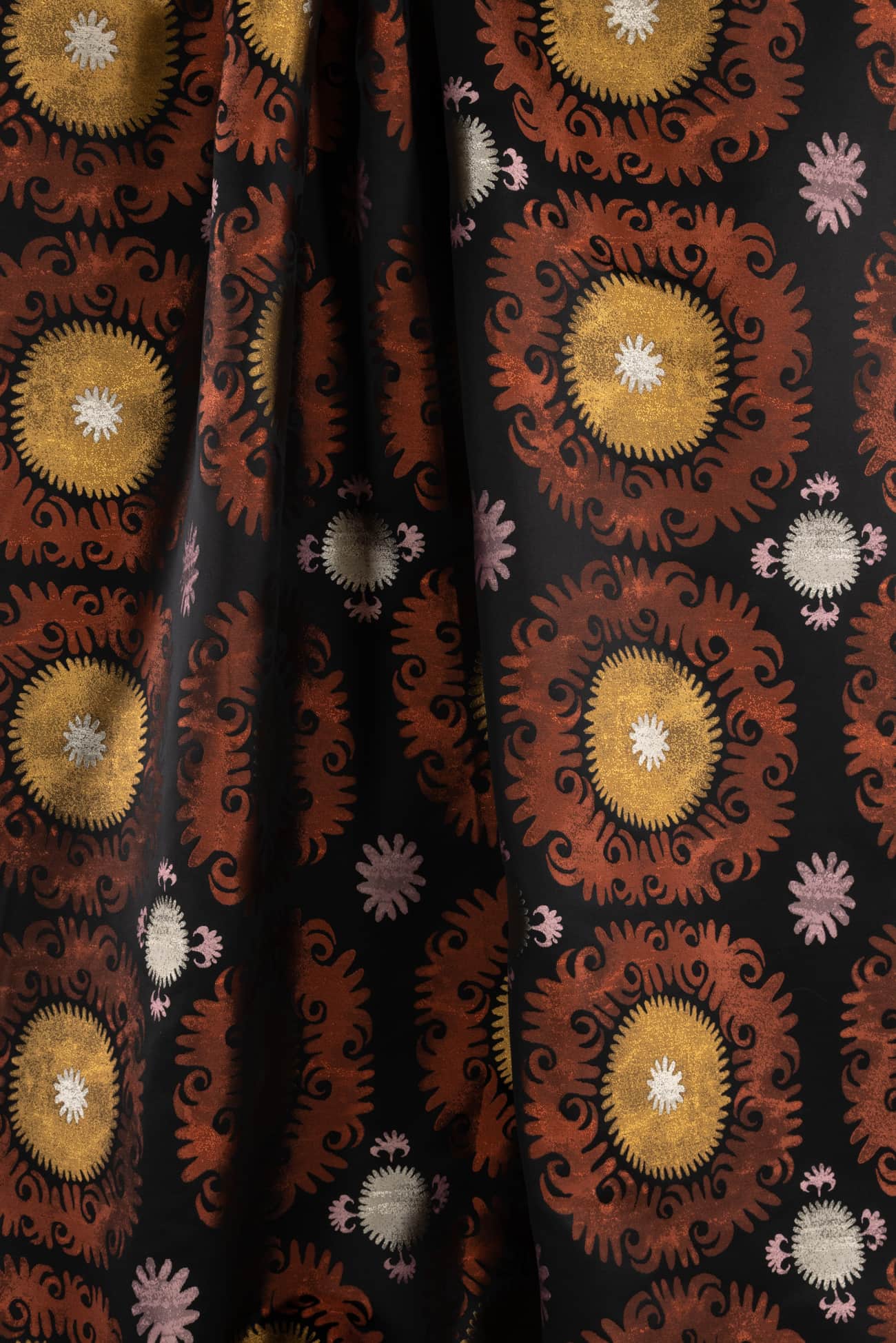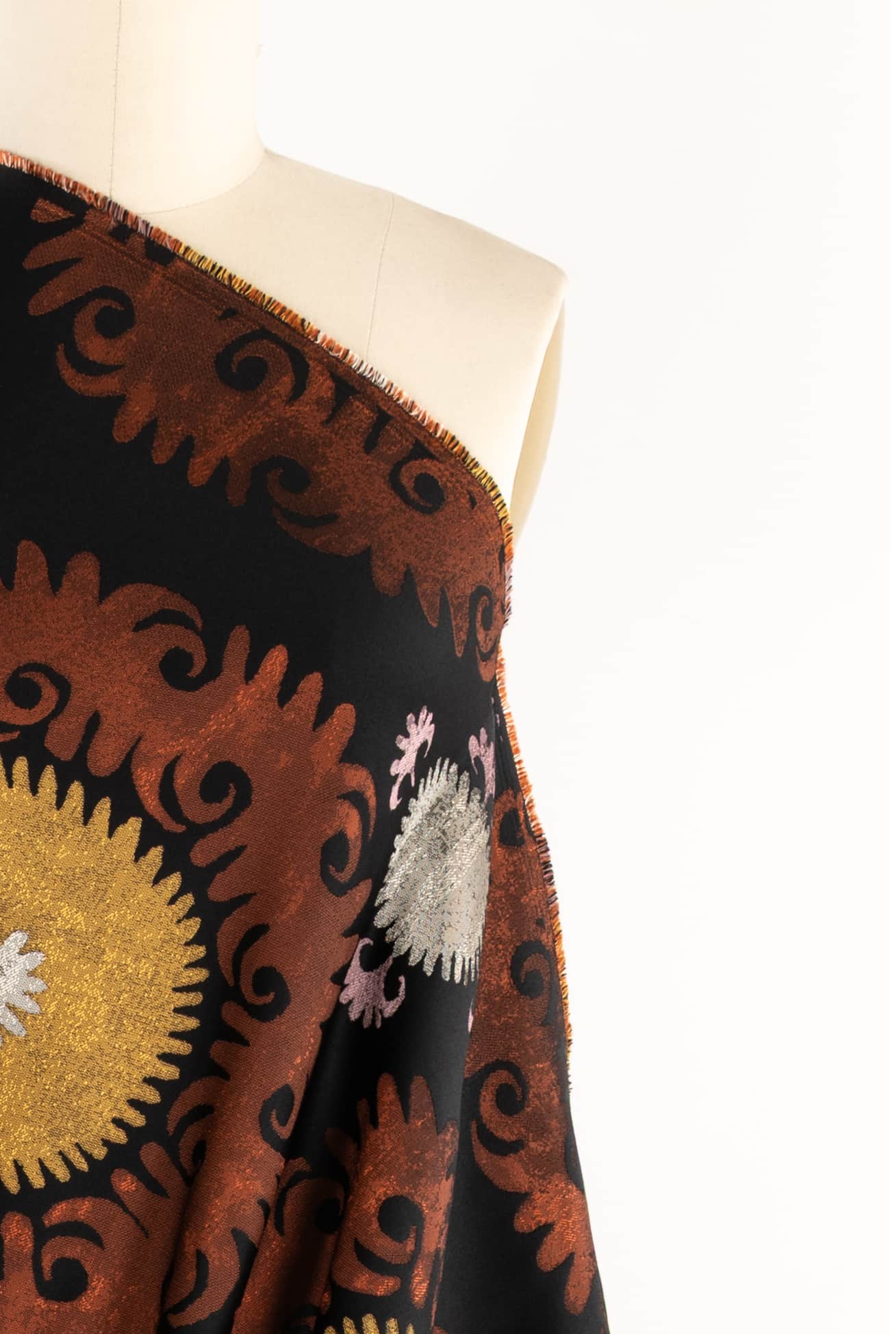 Dramatic brocade in glowing warm tones of rust, gold and silver on a black background, deadstock from a NY designer. Mid weight with a smooth hand and sculptural crisp drape. Right for a coat, jacket, vest, structured dress, skirt, accessories and home decor.
