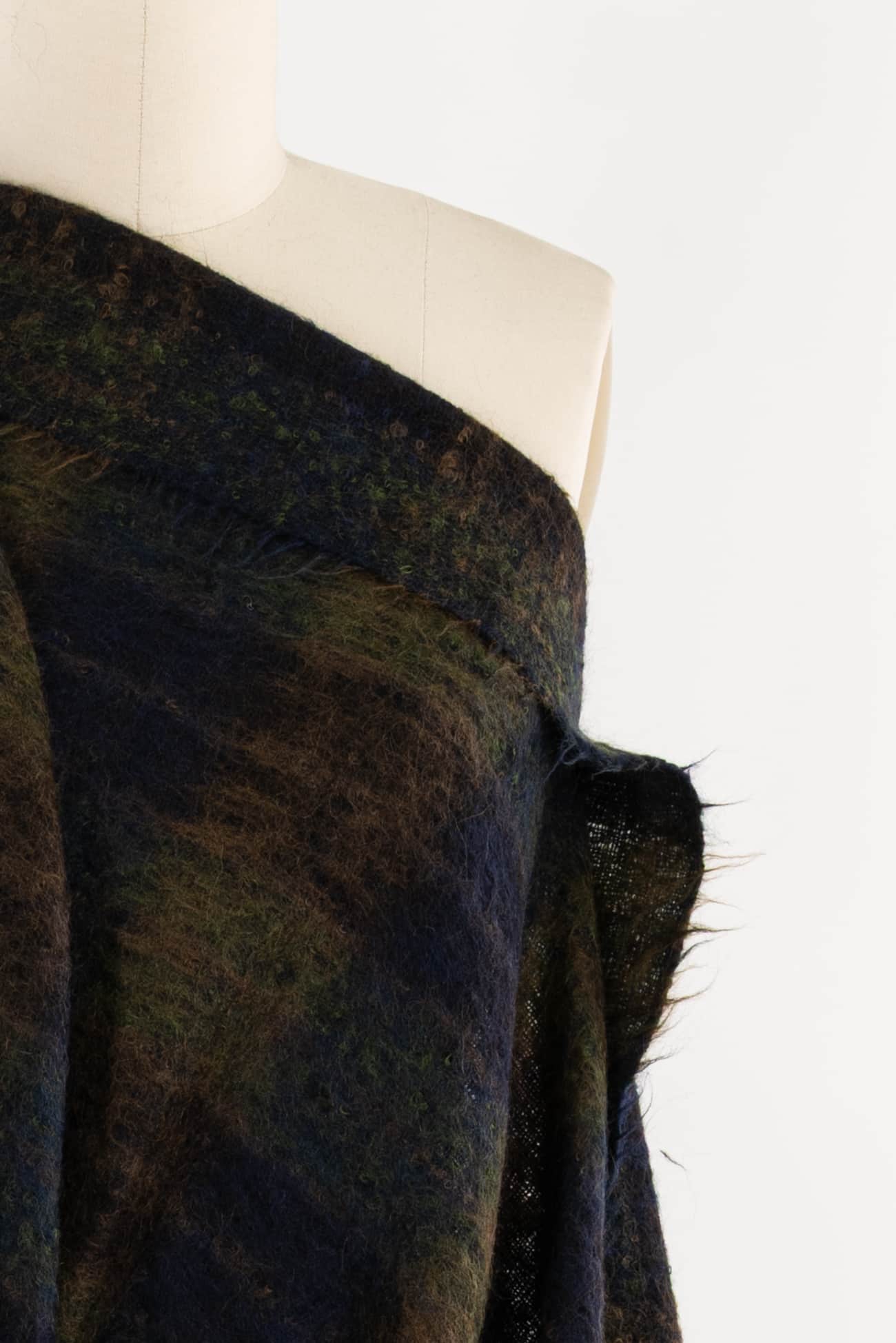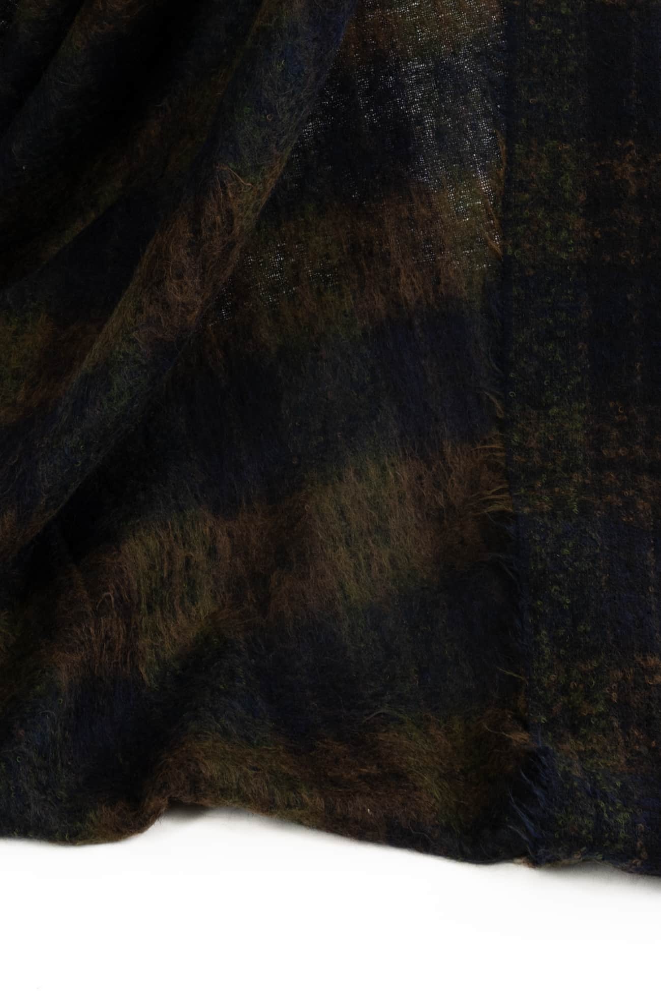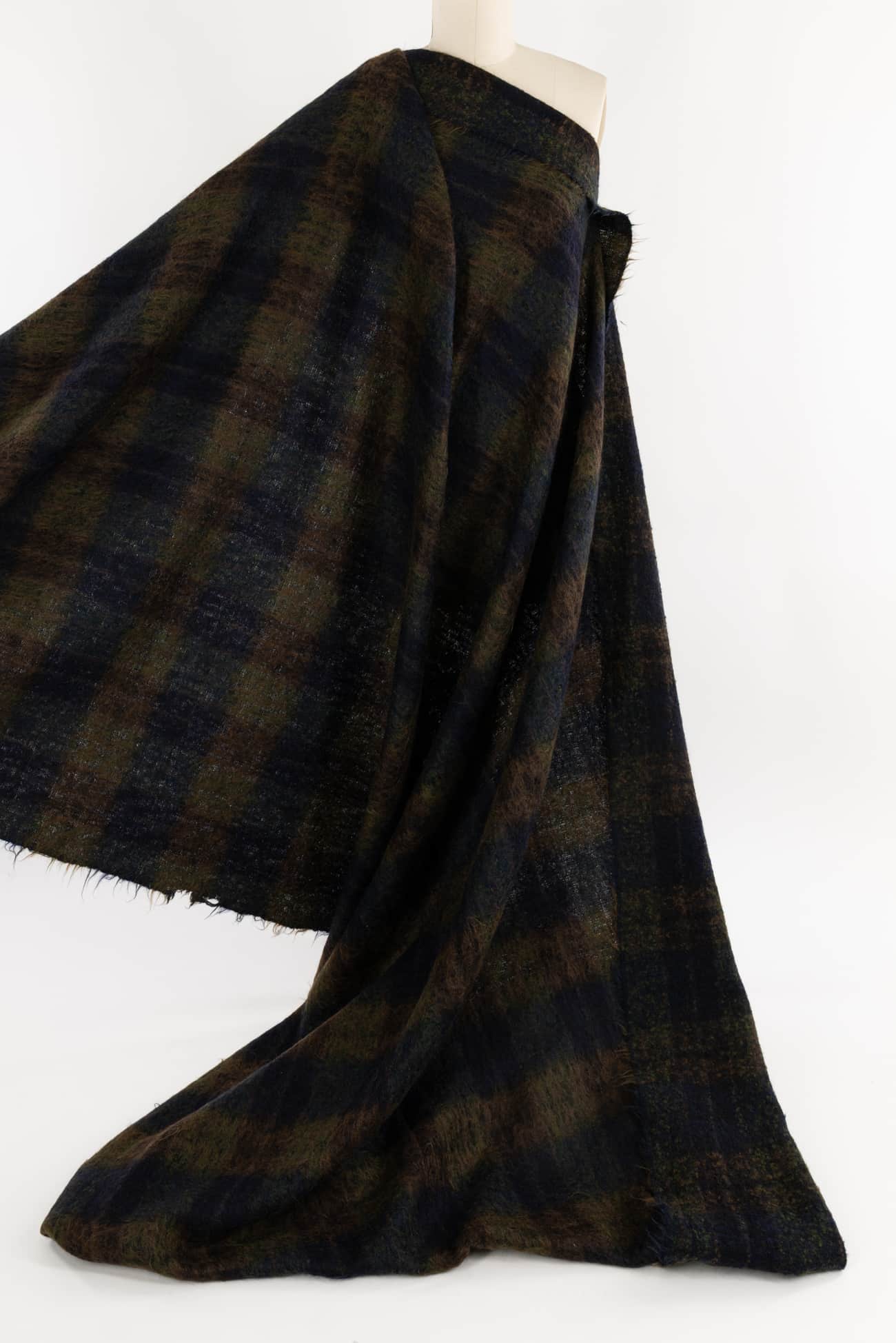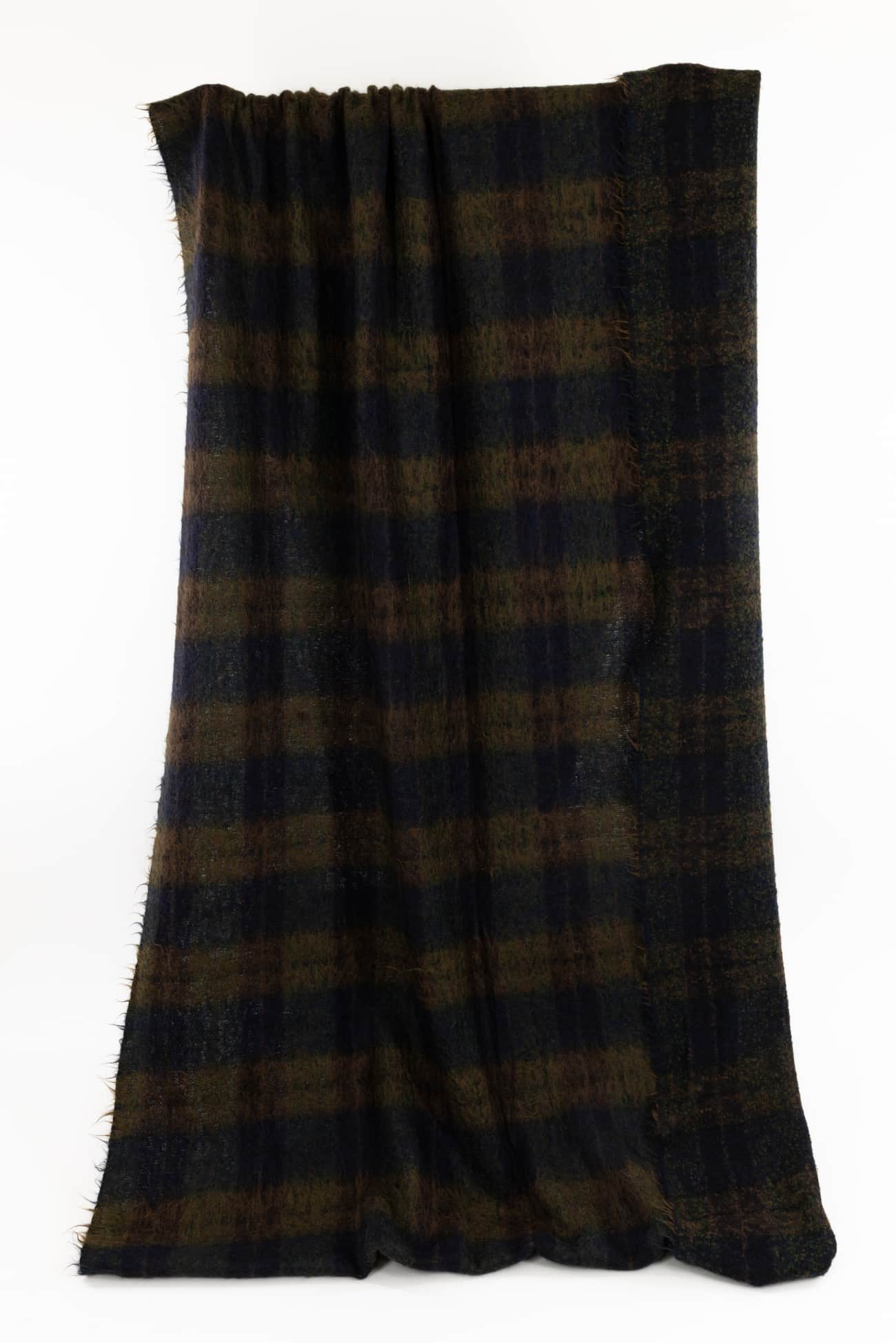 Gorgeous and elegant brushed mohair plaid in black with olive and walnut from an Italian mill. Wonderful wool mix is soft, sumptuous and cozy with a malleable drape, 7" repeat and brushed face, so cut as for a nap. Use either or both sides. Choose to line or not. Mid-coating weight, but not heavy. Right for a coat, jacket, vest, chic hoodie, shawl or cozy throw.
