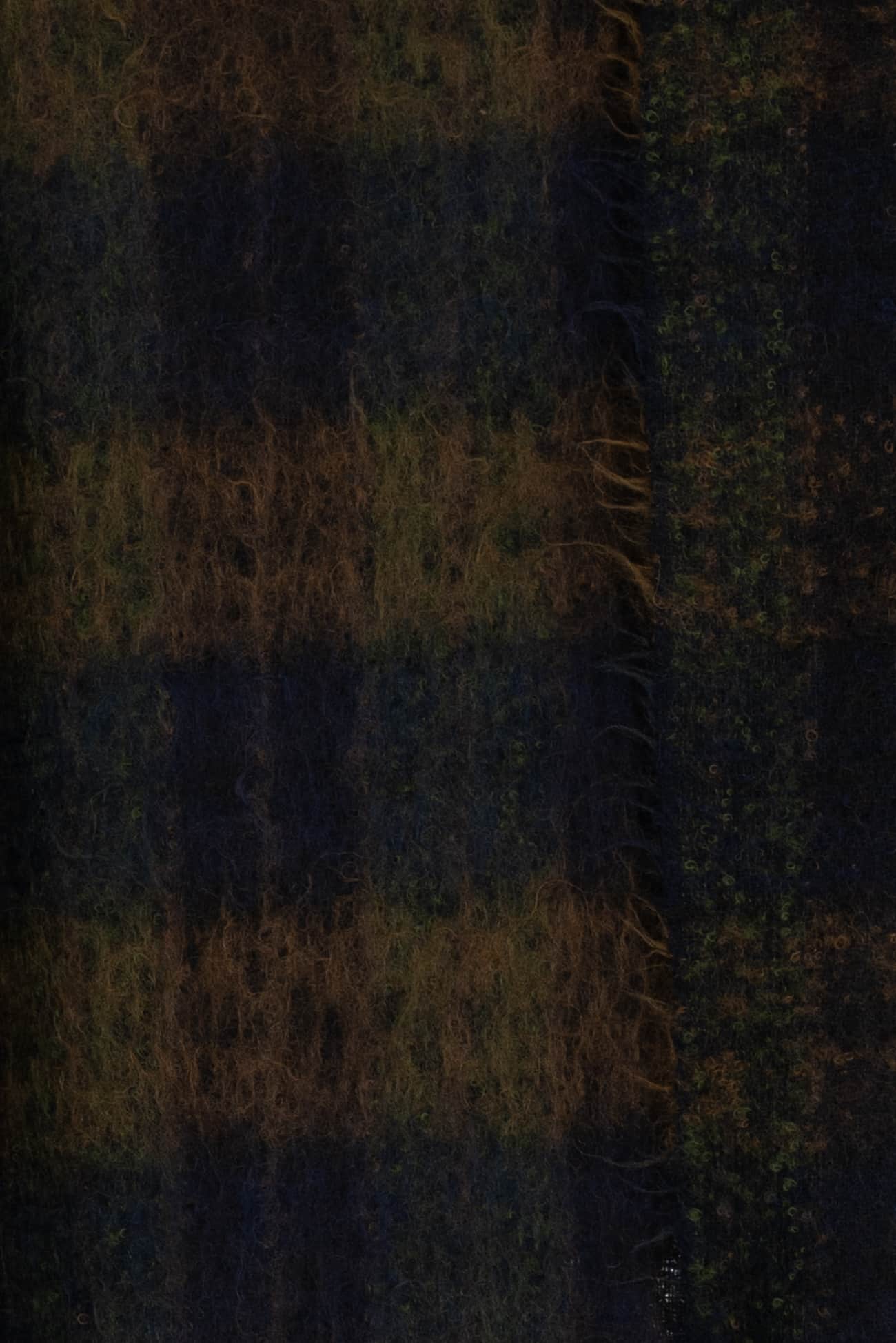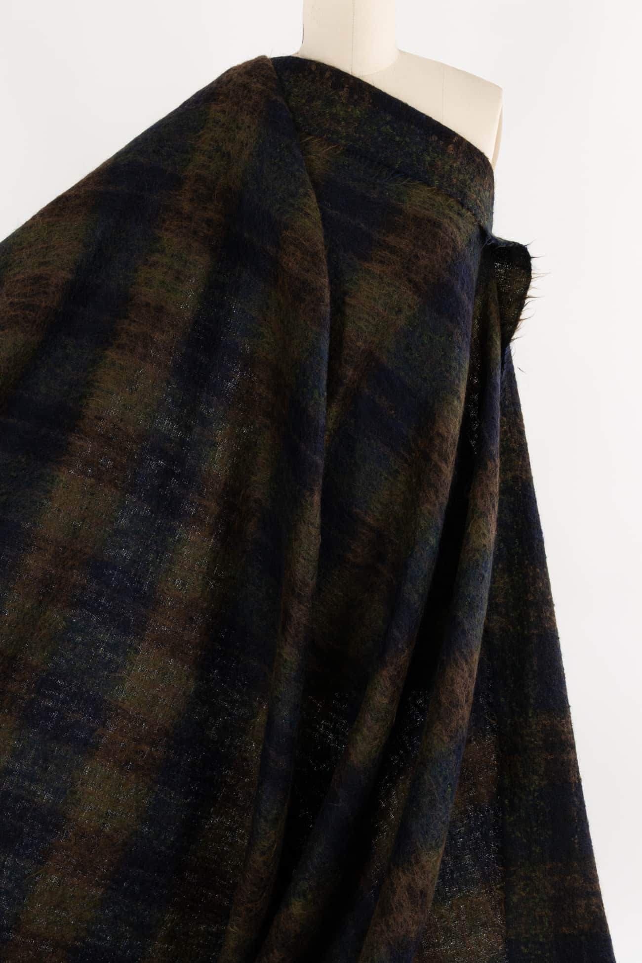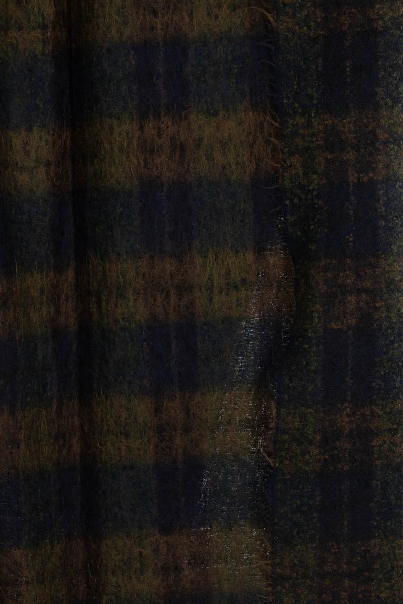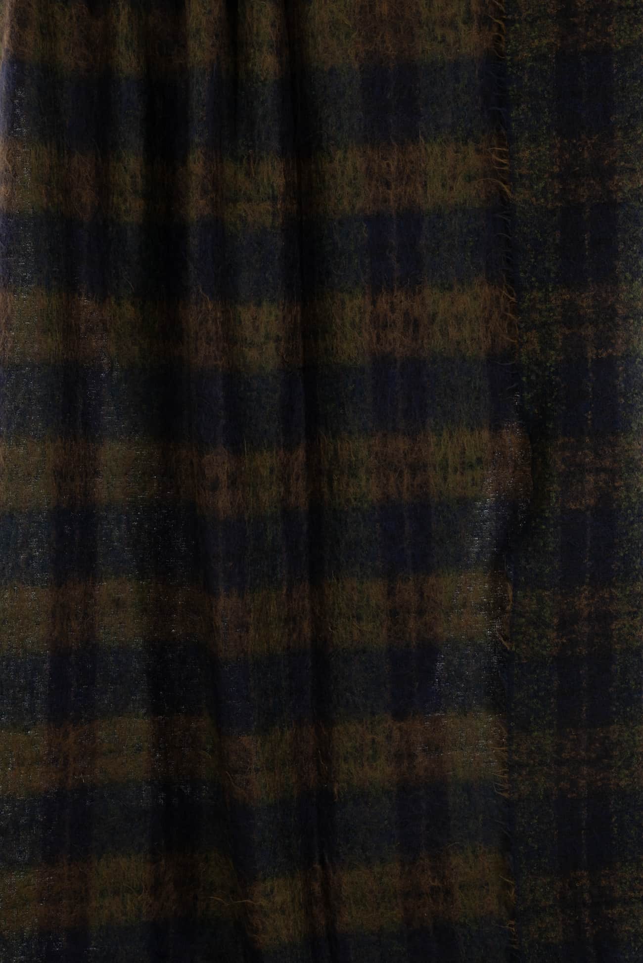 Gorgeous and elegant brushed mohair plaid in black with olive and walnut from an Italian mill. Wonderful wool mix is soft, sumptuous and cozy with a malleable drape, 7" repeat and brushed face, so cut as for a nap. Use either or both sides. Choose to line or not. Mid-coating weight, but not heavy. Right for a coat, jacket, vest, chic hoodie, shawl or cozy throw.
