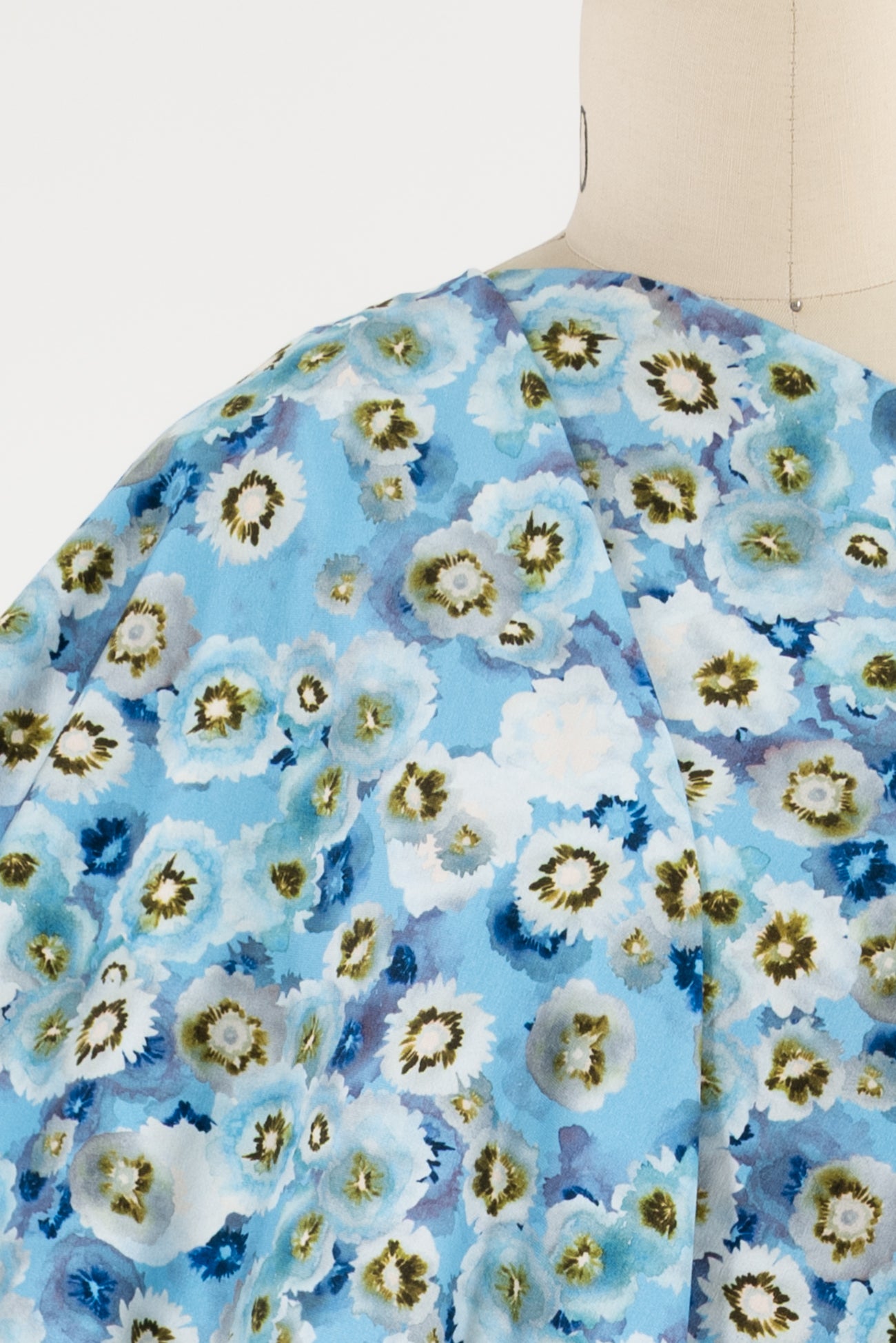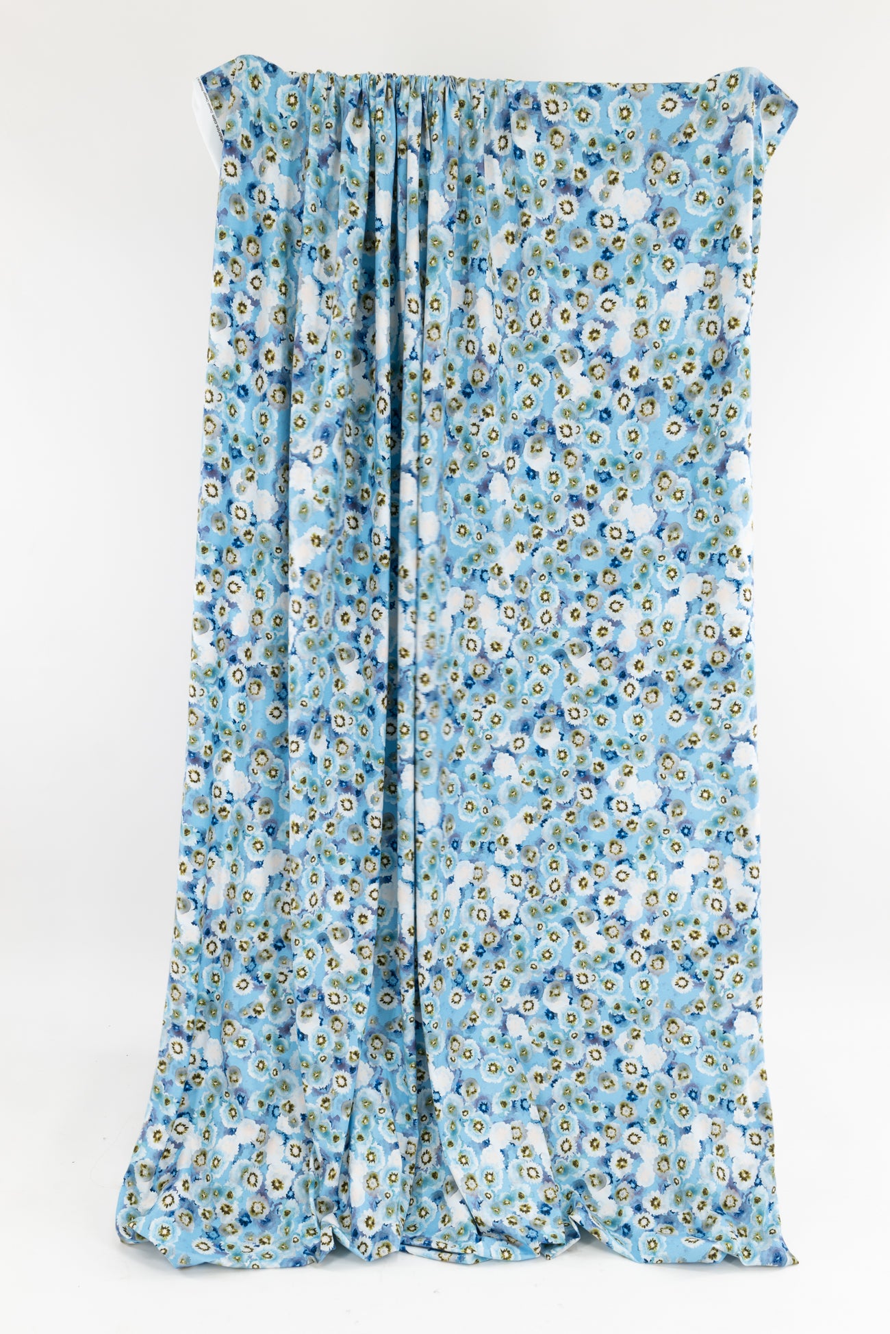 Buoyant blue and white floral with violet and green accents in a digital print on an impeccable European quality cotton/spandex jersey knit, produced in Denmark. Light/mid-weight, opaque, and will skim the body in a flattering way. It has a soft, smooth texture, fluid drape, 4-way stretch, and some rolling at the cut edge. Right for a variety of garments: t-shirt, tunic, dress, soft pants, leggings, cardigan, skirt, or loungewear, as well as children's or men's clothing. Oeko-Tex® certified. One-way design, 16" repeat.