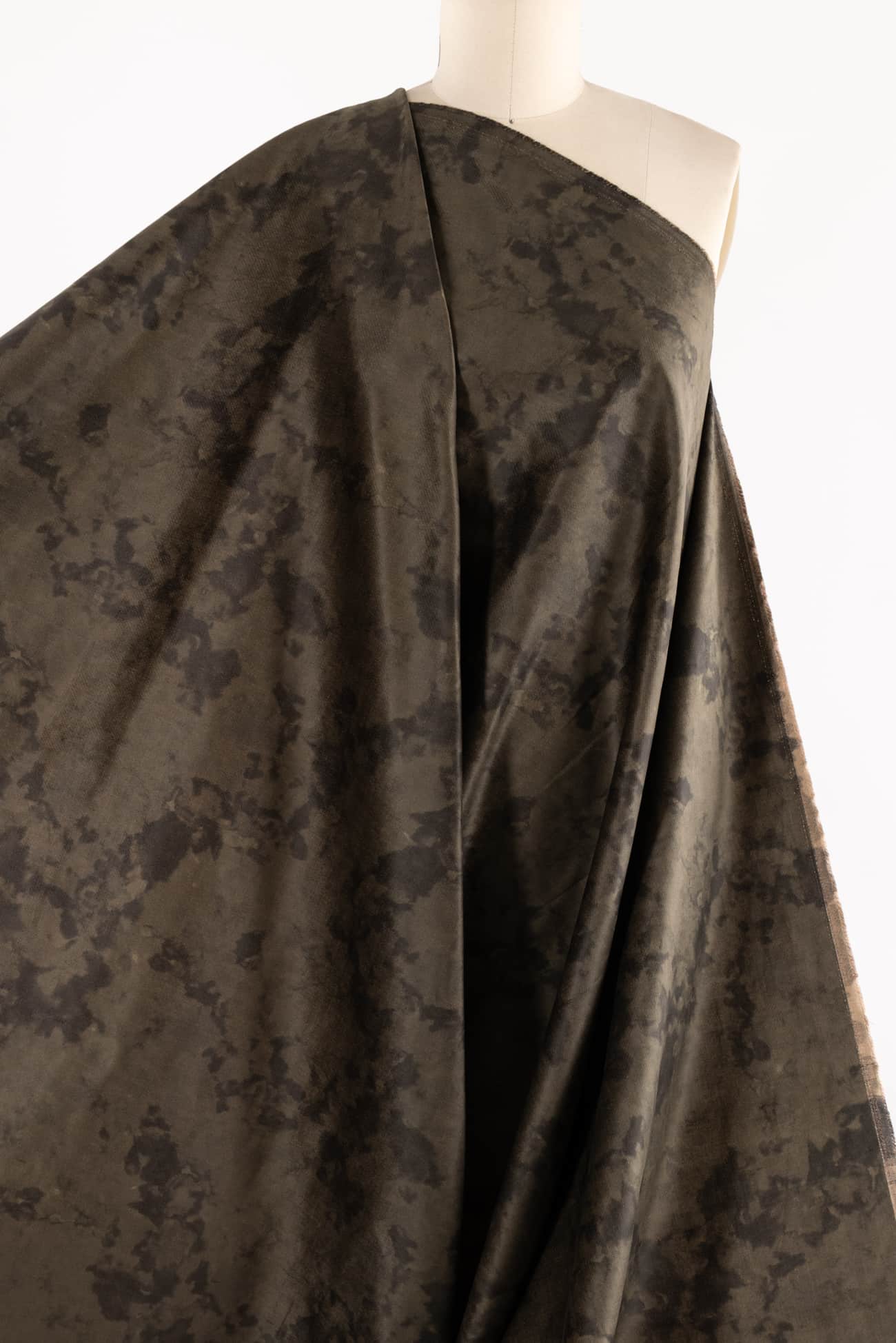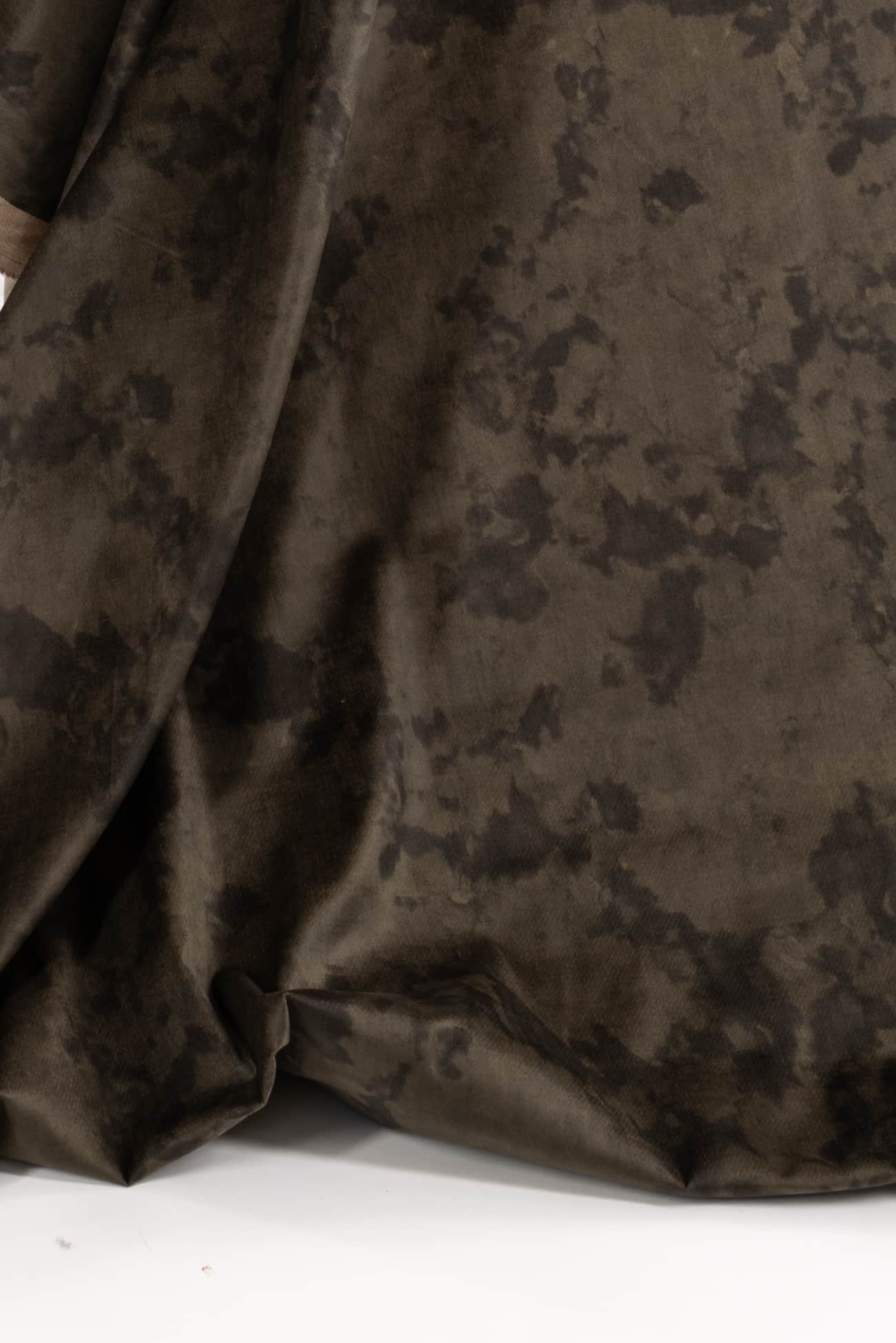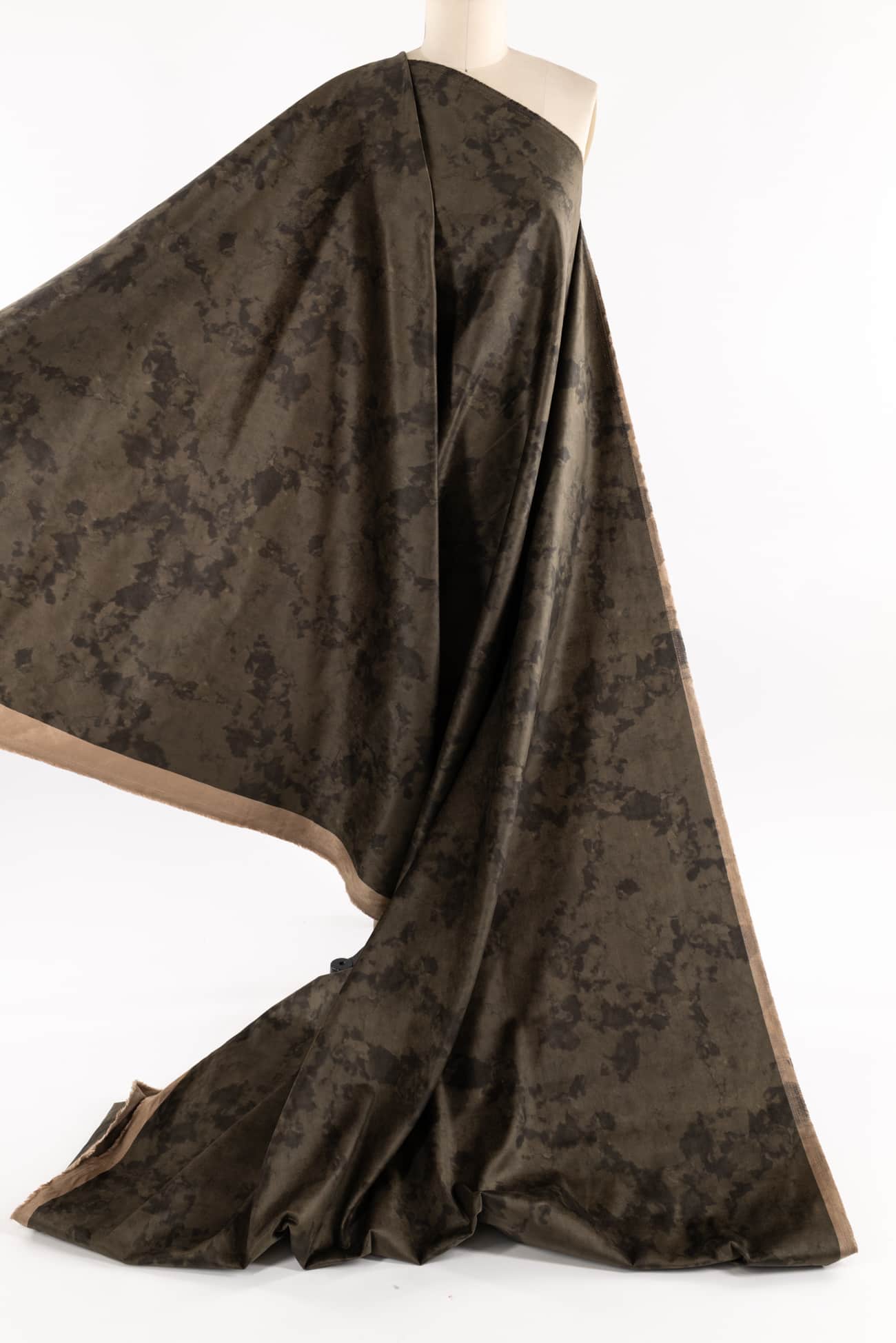 Elegant stylized abstract botanical in muted brown and olive in an exquisite quality stretch velveteen, deadstock produced in a Japanese mill for a NYC designer. On trend, soft and cozy, in a supple mid-weight, not at all thick or heavy, with a sumptuous hand, lightly structured drape and crosswise stretch. Right for a coat, jacket, vest, dress, skirt, pants, men's or children's clothes. One way design, cut for nap, 24" repeat.