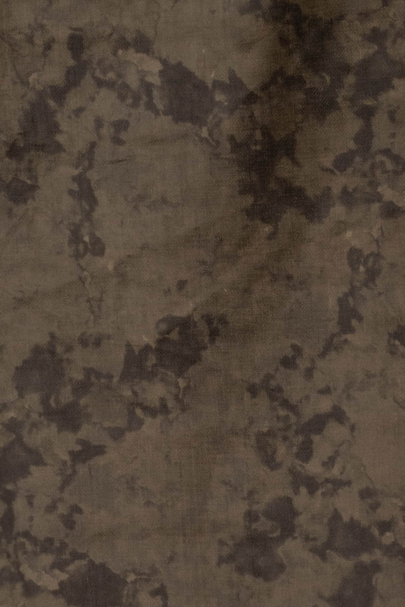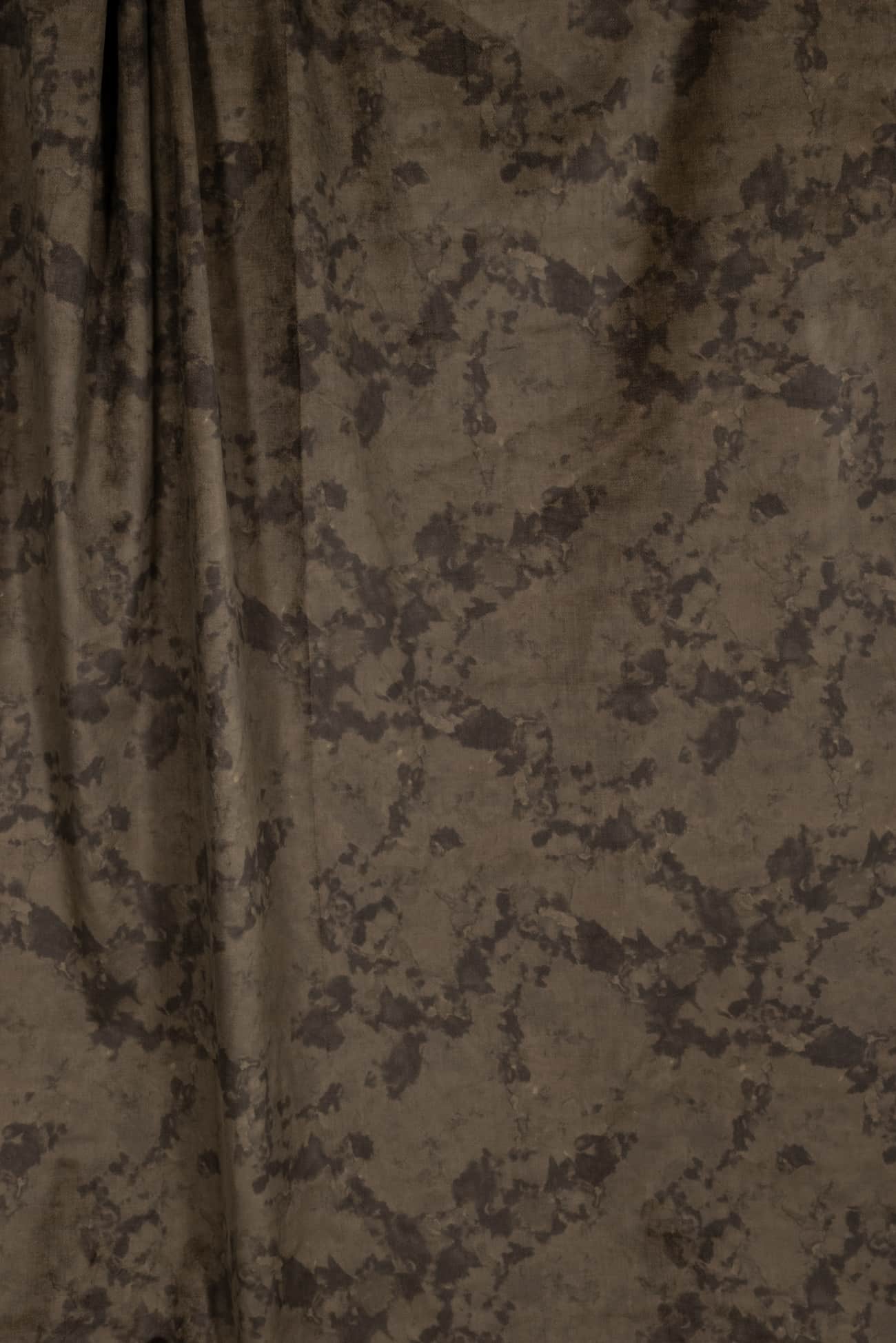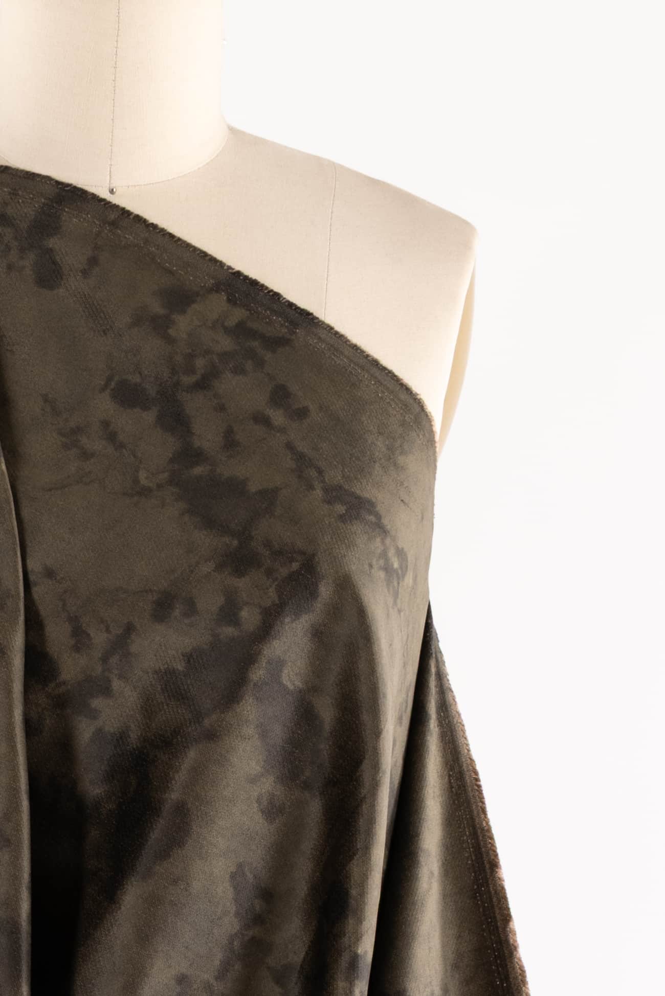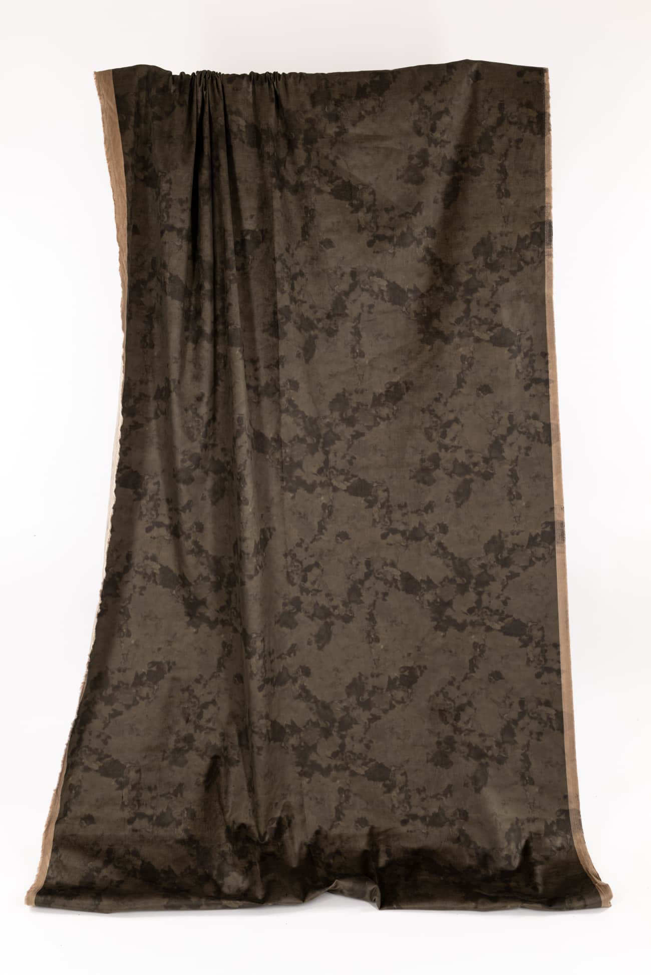 Elegant stylized abstract botanical in muted brown and olive in an exquisite quality stretch velveteen, deadstock produced in a Japanese mill for a NYC designer. On trend, soft and cozy, in a supple mid-weight, not at all thick or heavy, with a sumptuous hand, lightly structured drape and crosswise stretch. Right for a coat, jacket, vest, dress, skirt, pants, men's or children's clothes. One way design, cut for nap, 24" repeat.