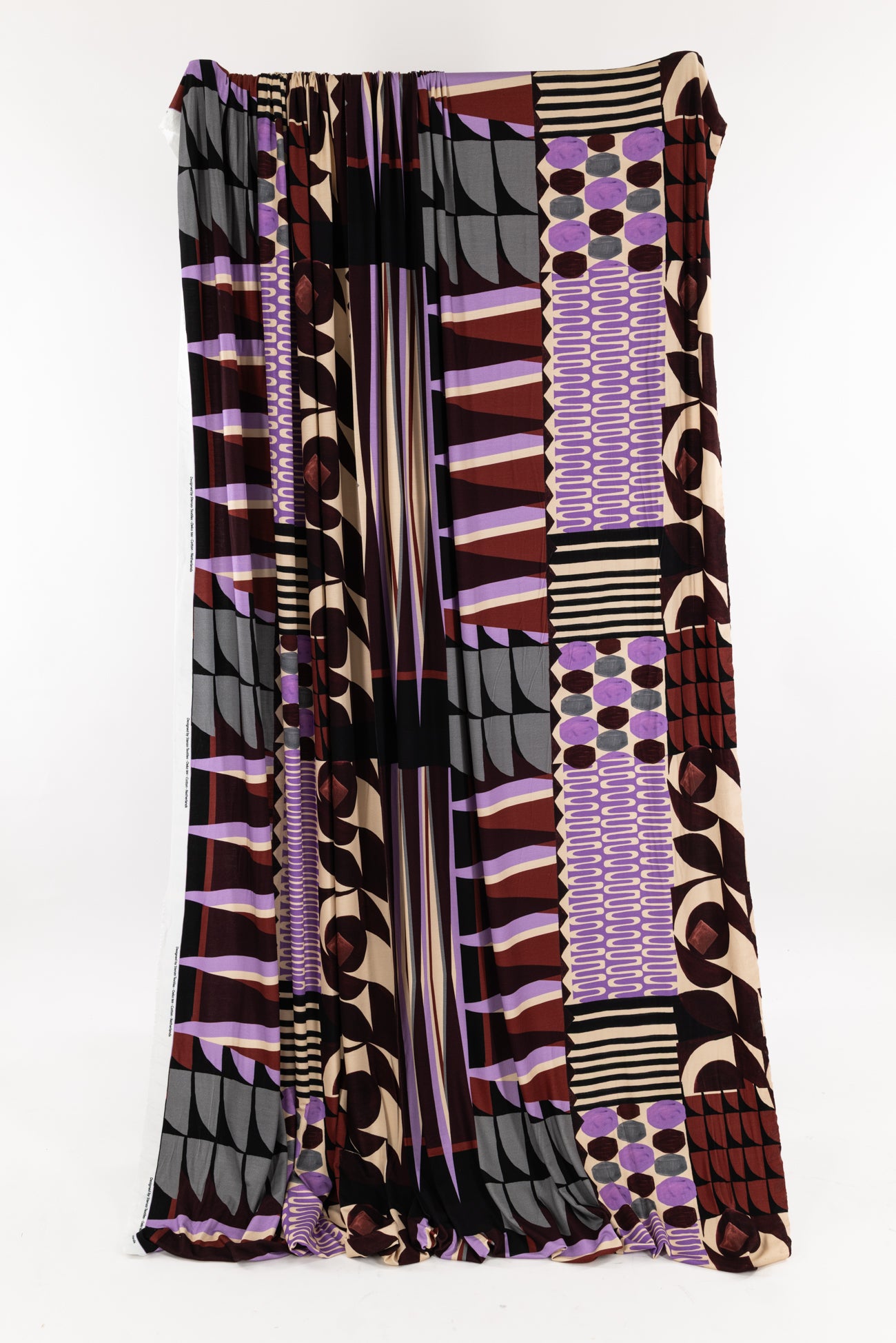 Rich aubergine, purple, mahogany, sand, gray, and black design beautifully blends striking geometric elements. Luxurious viscose knit jersey, digitally printed in the Netherlands. Impeccable quality, light/mid-weight, opaque, with a flattering body-skimming flow, appealing soft hand, fluid drape, crosswise stretch, some lengthwise stretch, a 28" repeat, and some rolling at the cut edge. Ideal for a wide range of garments, t-shirt, tunic, dress, skirt, soft pants, loungewear, caftan, kimono, or children's. Oeko-Tex® certified.