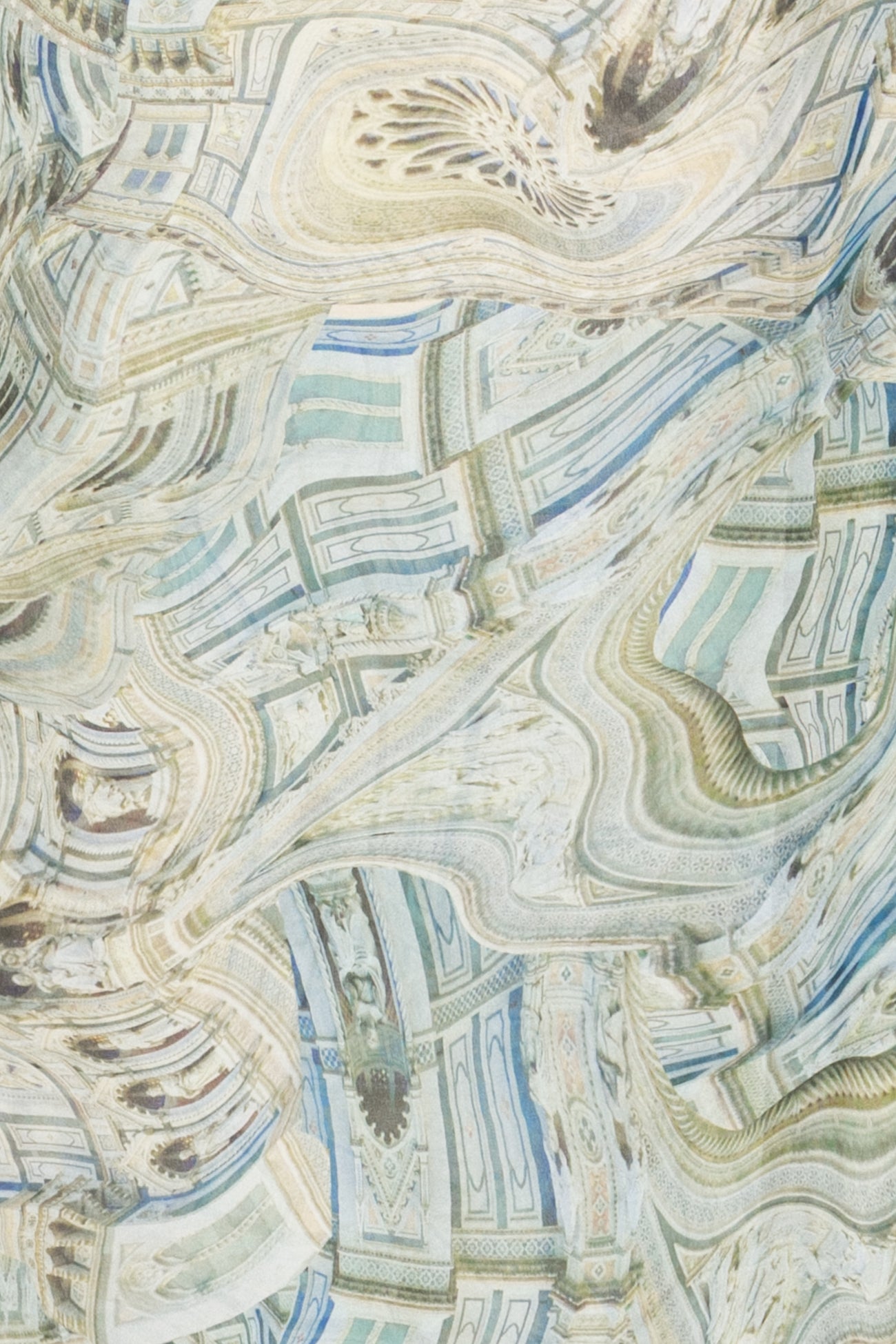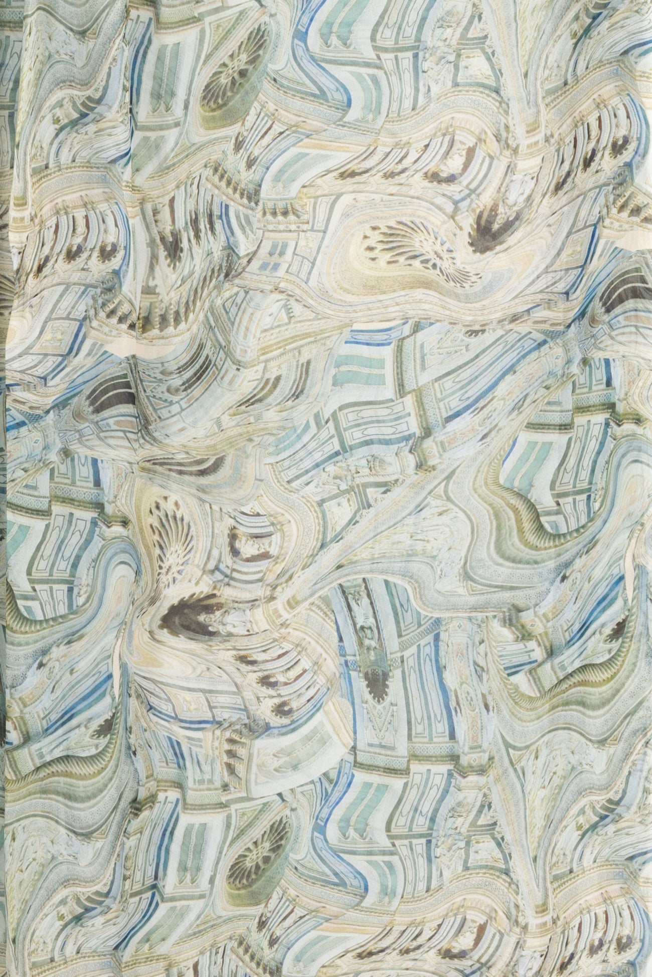 Architectural abstractions in subtle blues and greens with black accents enhance a fine quality viscose georgette woven. Fun deadstock from Dolce & Gabbana, milled in Italy. Lightweight, semi-opaque with a cool soft matte hand and airy drape. One-way design with a 21¼" repeat. Right for a dress, tunic, top, shirt, skirt, soft pant, caftan, loungewear, kimono, men's or children's.