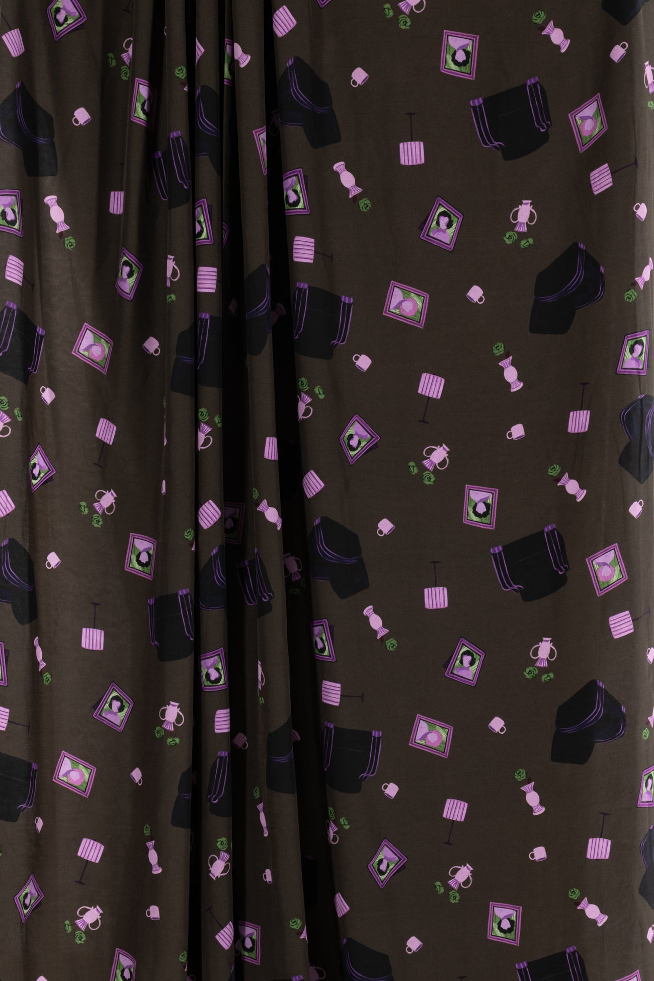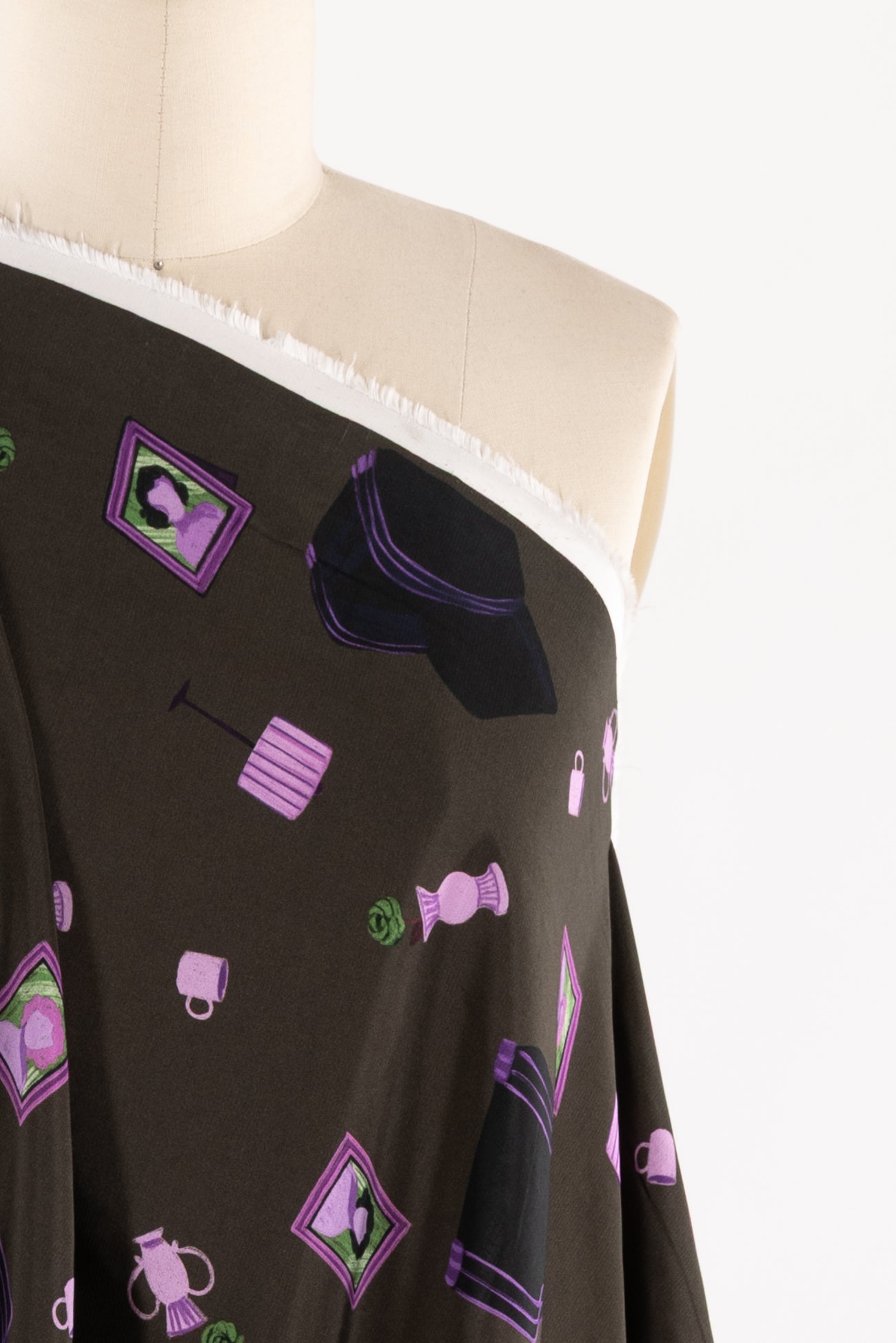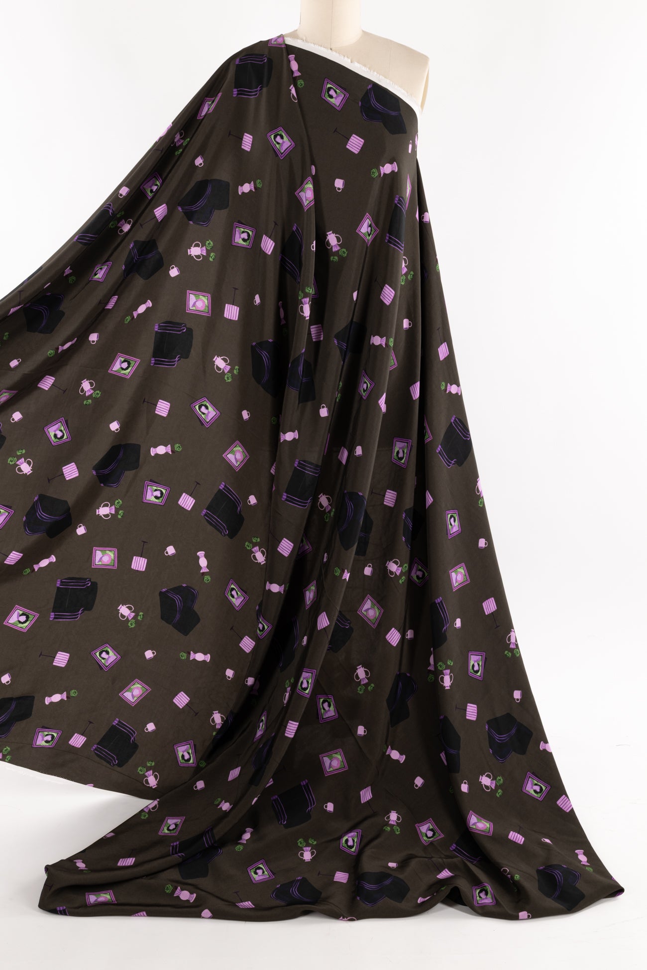Nostalgia beckons in shades of purple and violet with green and black accents on deepest olive in a fine quality viscose woven. Fun striking deadstock from Dolce & Gabbana, milled in Italy. Lightweight, with a cool soft matte hand and airy drape. One-way design with a 19¼" repeat. Right for a dress, tunic, top, shirt, skirt, soft pant, caftan, loungewear, kimono, men's or children's.