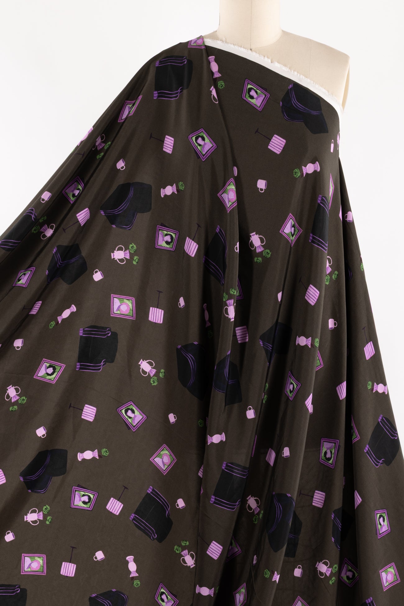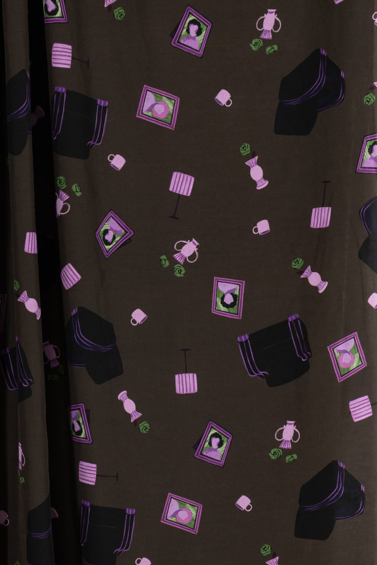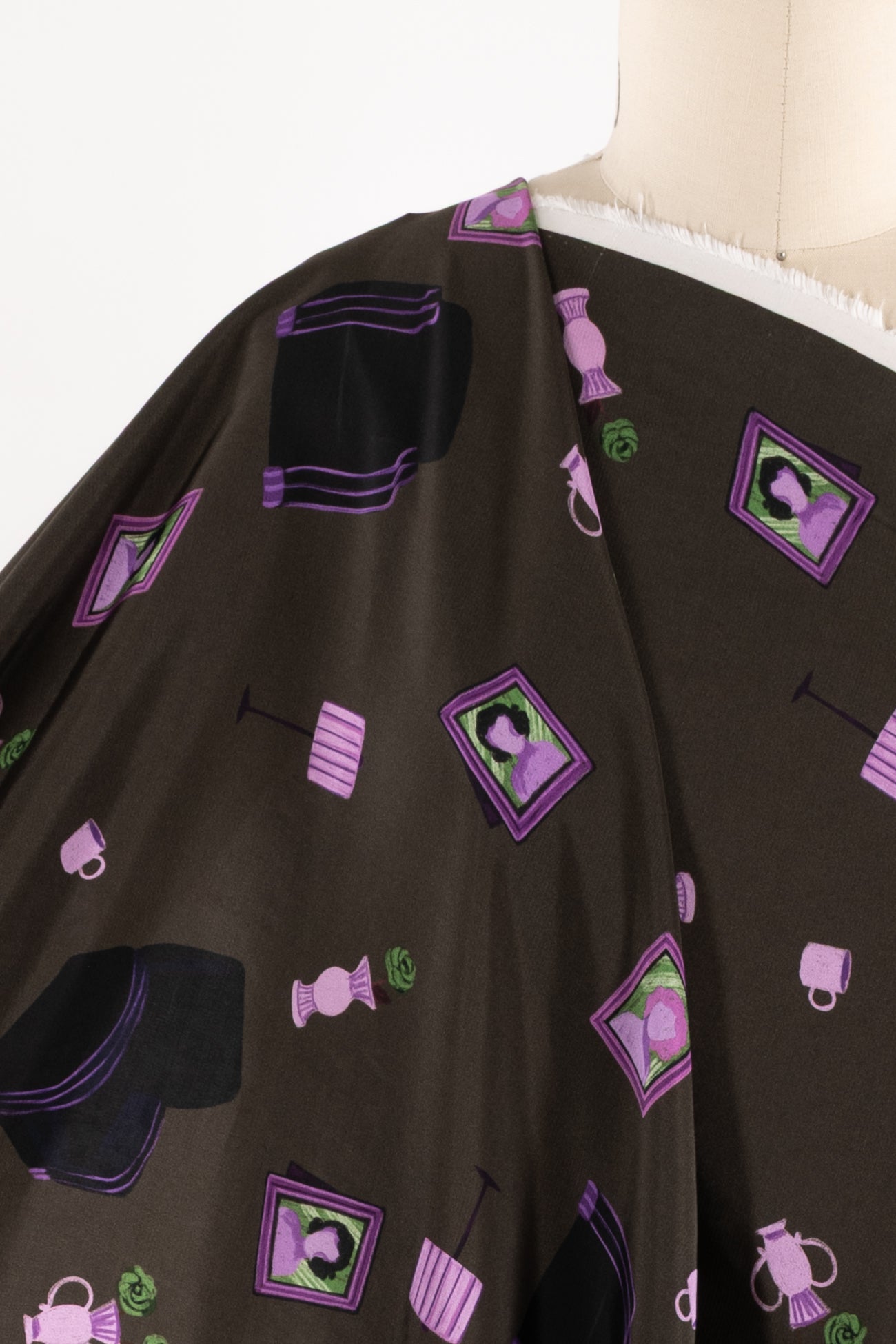 Nostalgia beckons in shades of purple and violet with green and black accents on deepest olive in a fine quality viscose woven. Fun striking deadstock from Dolce & Gabbana, milled in Italy. Lightweight, with a cool soft matte hand and airy drape. One-way design with a 19¼" repeat. Right for a dress, tunic, top, shirt, skirt, soft pant, caftan, loungewear, kimono, men's or children's.