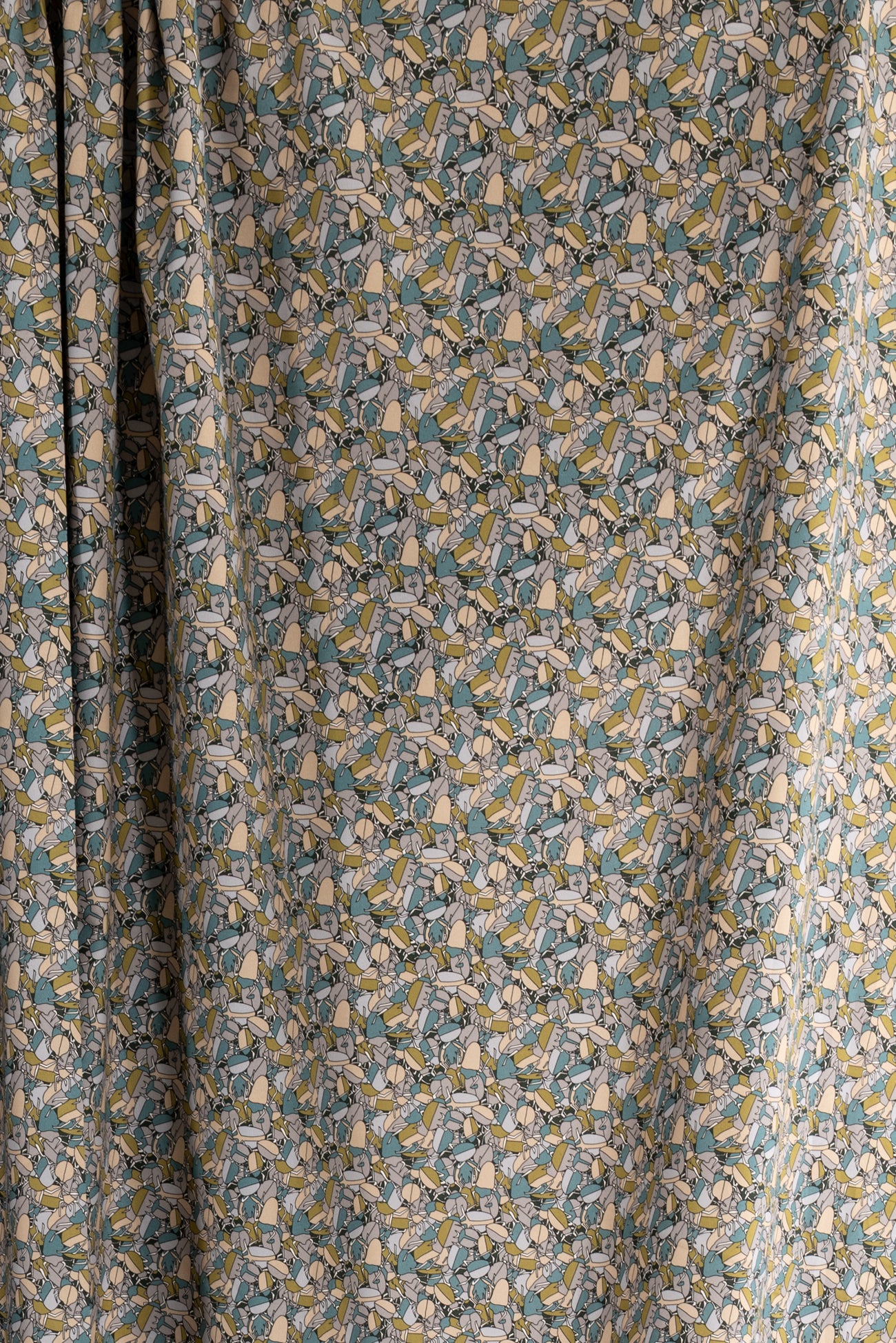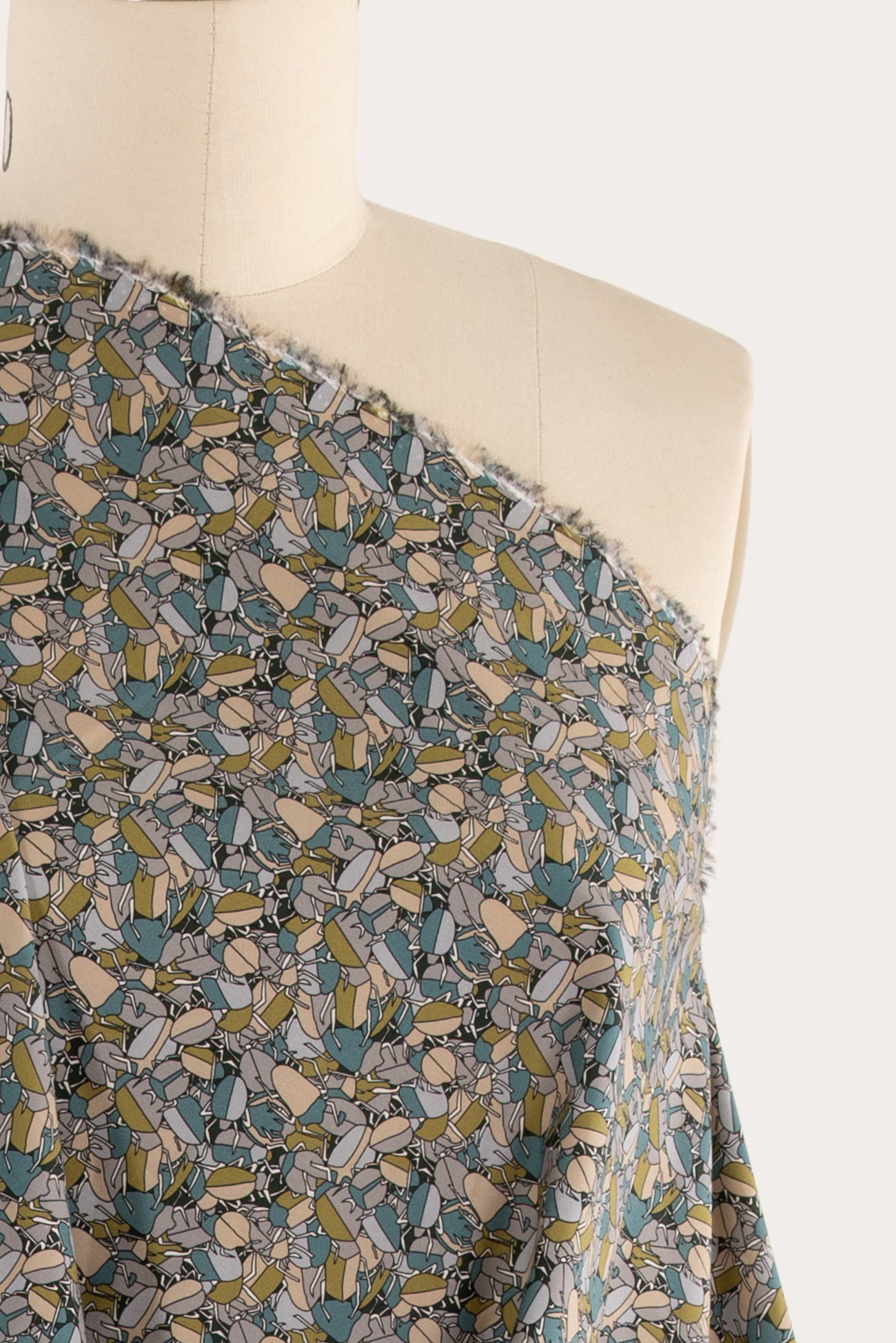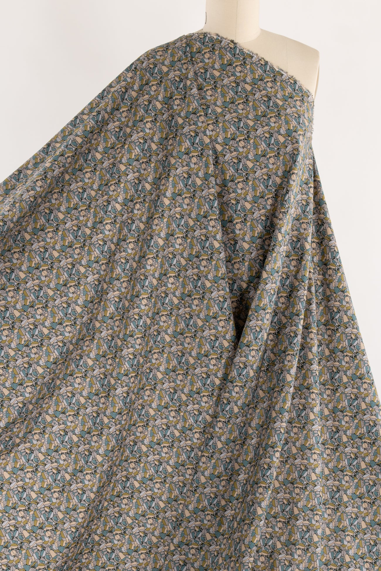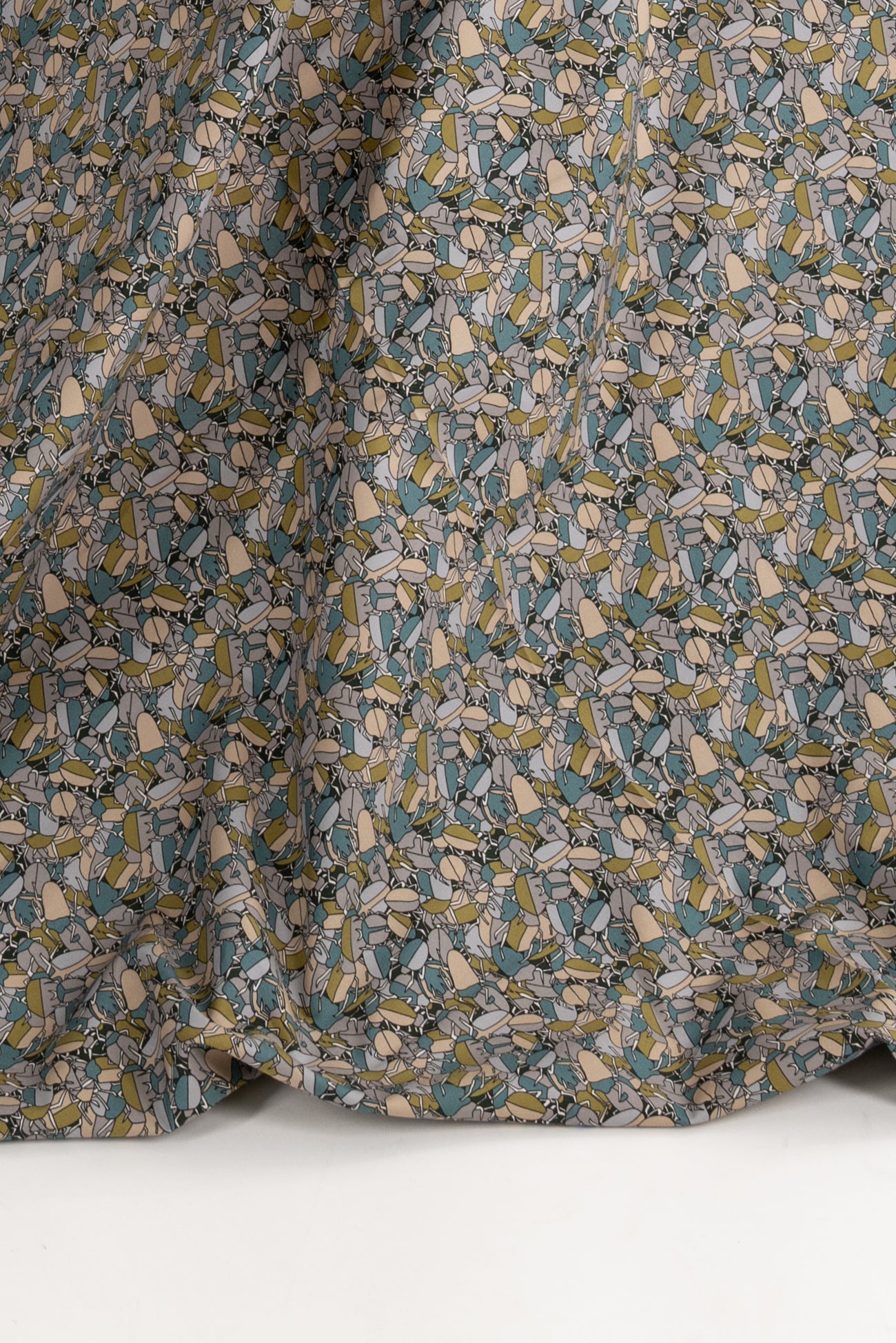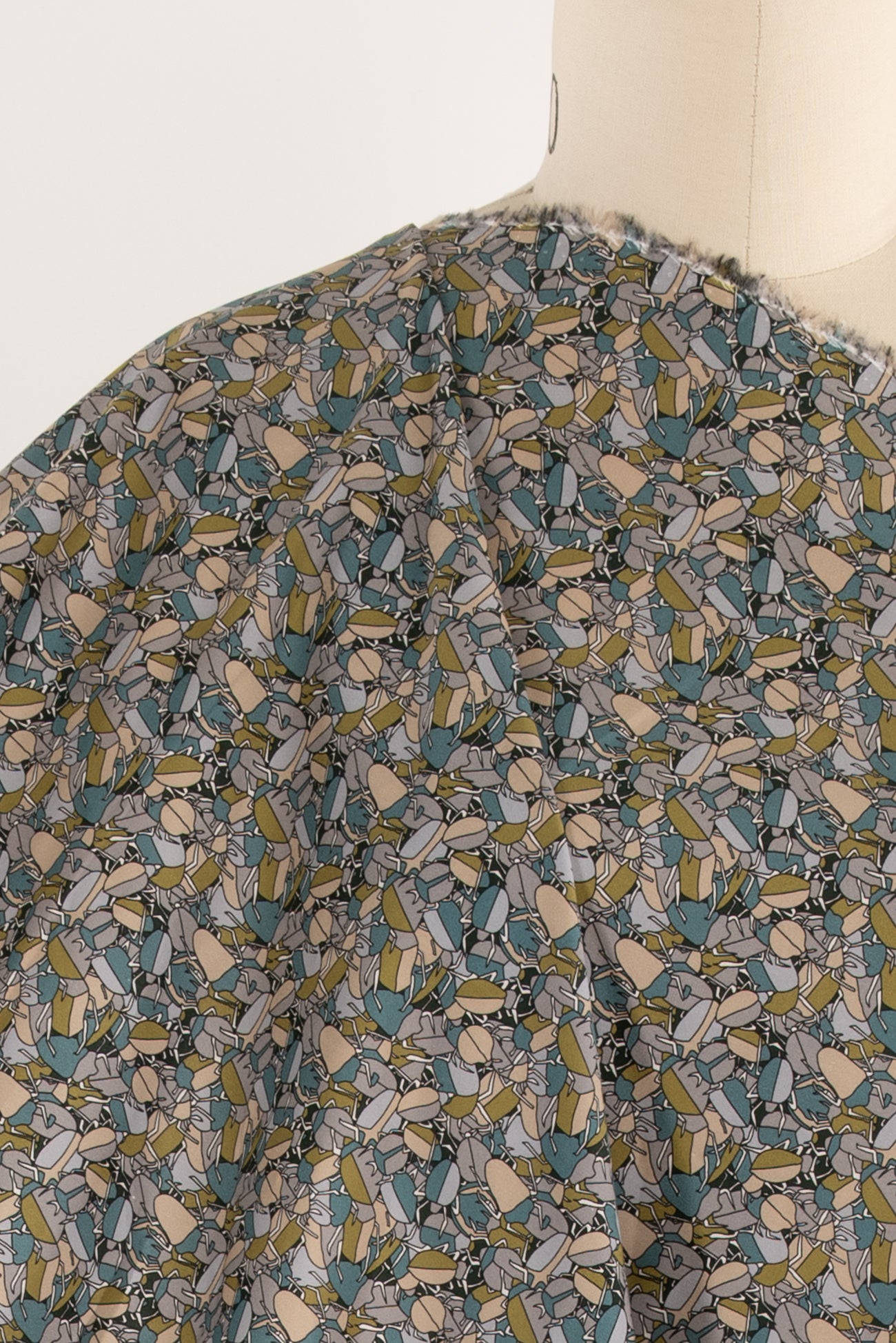 Soft shades of mossy green, slate blue and gray, etched with black in a modern geometric design produced in Northern Italy for Liberty of London, printed on an exquisite quality cotton poplin. Shirting weight, fine-grained, with a cool, smooth hand and lightly crisp drape.Right for a shirt, dress, skirt, tunic, soft pant, caftan, loungewear, children's or men's, accessories or home decor. Right to wear everyday or for statement pieces. OEKO-TEX® certified. Liberty of London poplin is a crisp, denser, more structured, slightly heavier-weight cotton compared to the lightweight, silky, and fine-woven Tana Lawn.