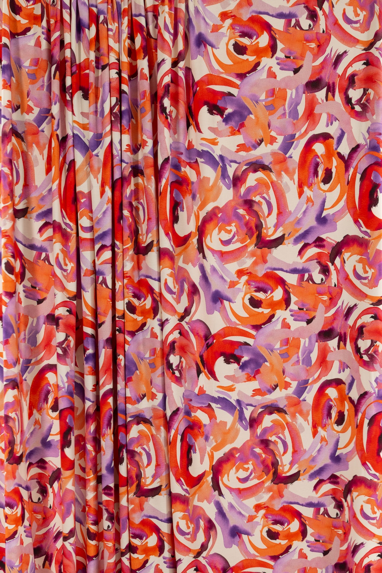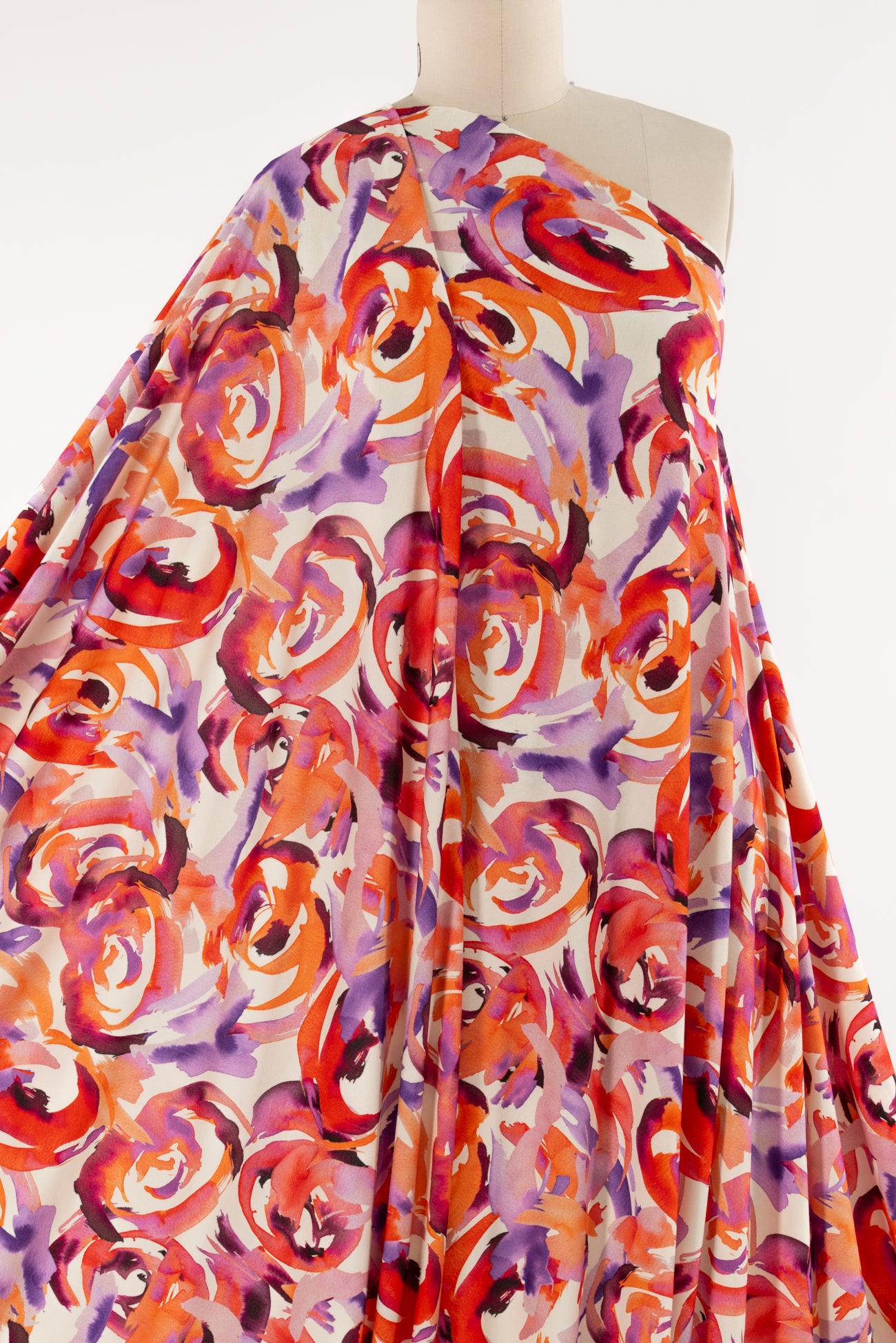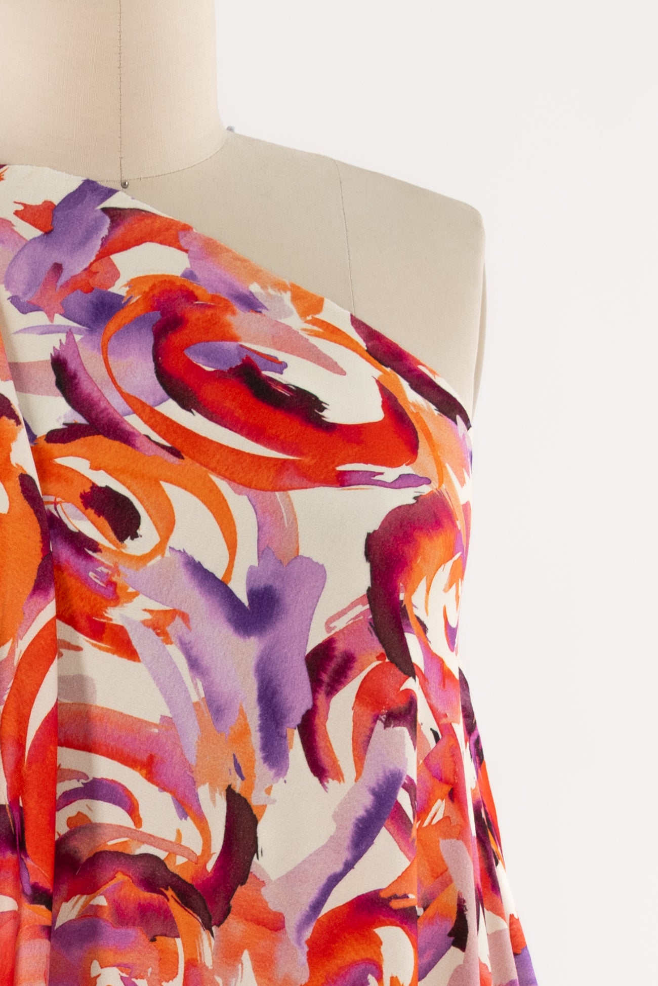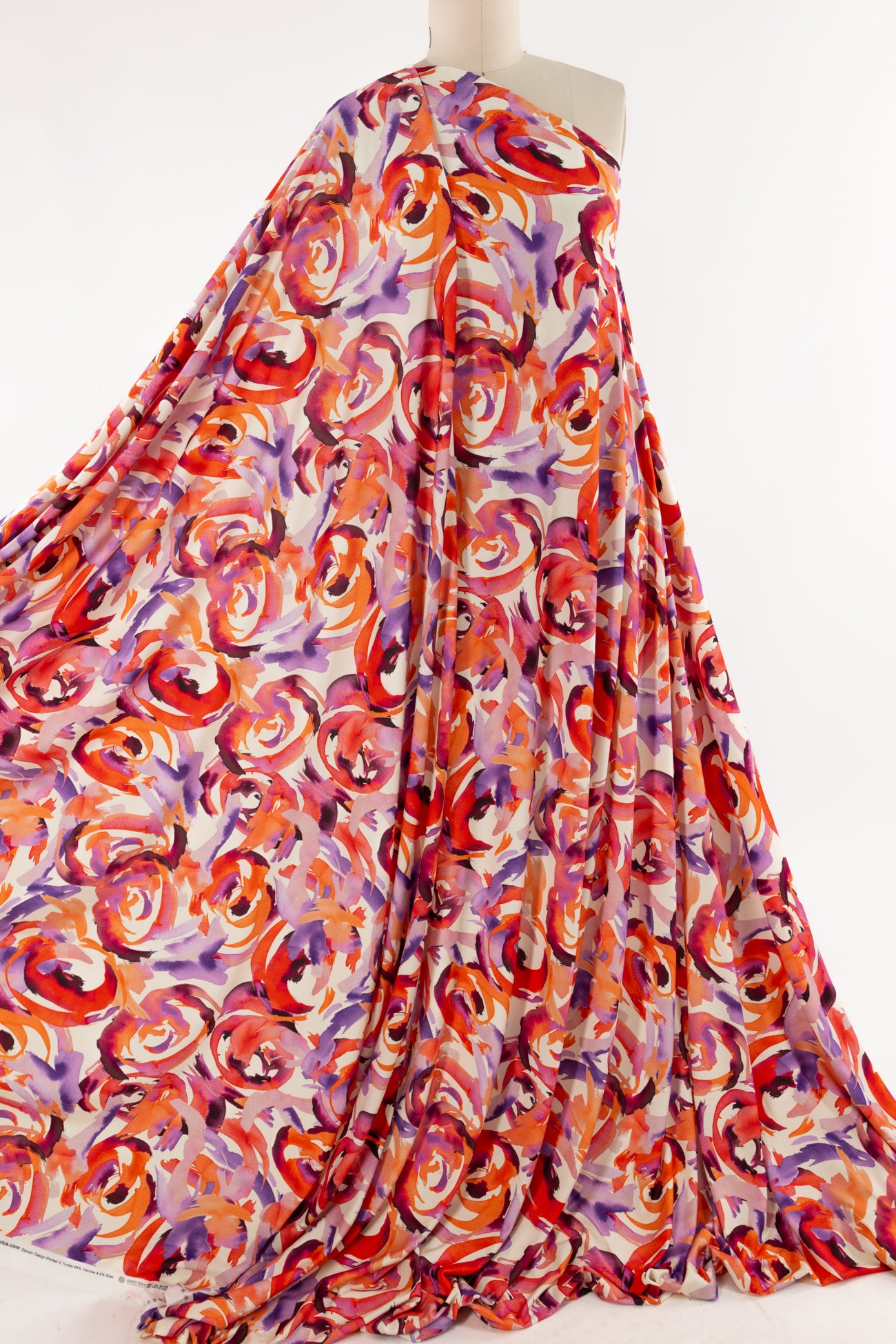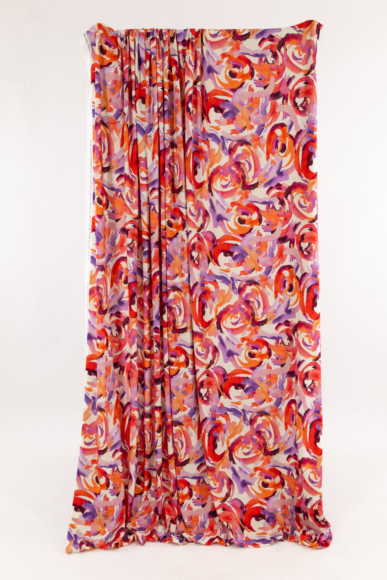 Artful abstract in watercolor brushstrokes in shades of red, tangerine, and purple, in a gorgeous digital print on an impeccable European quality viscose/spandex jersey knit, produced in Denmark. Light/mid-weight, opaque, and will skim the body in a flattering way. It has a soft smooth hand, fluid drape, 4-way stretch, and some rolling at the cut edge. Right for a variety of garments; t-shirt, tunic, dress, soft pants, leggings, cardigan, skirt, loungewear, or children's. Oeko-Tex® certified. One-way design, 17½ inch repeat.