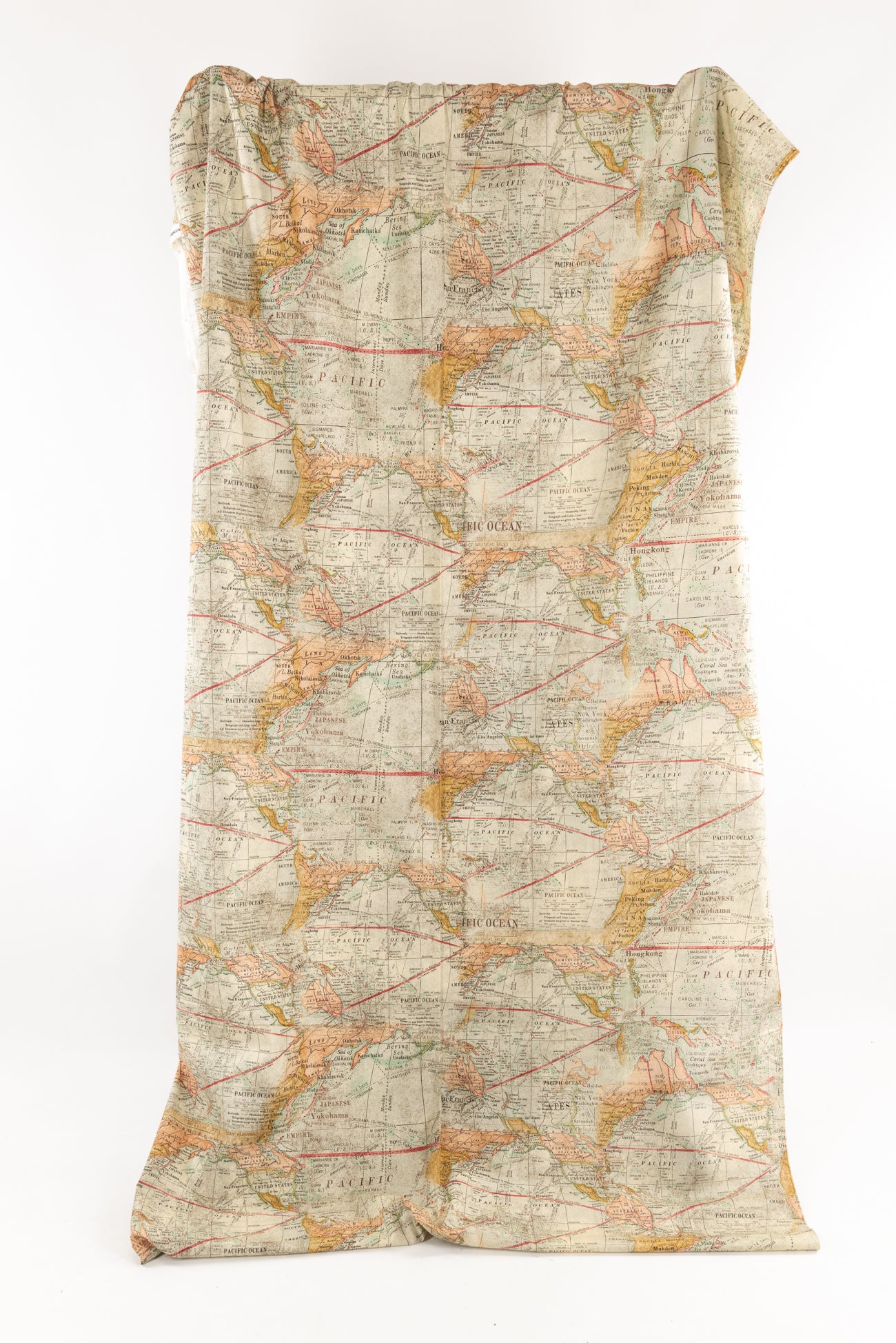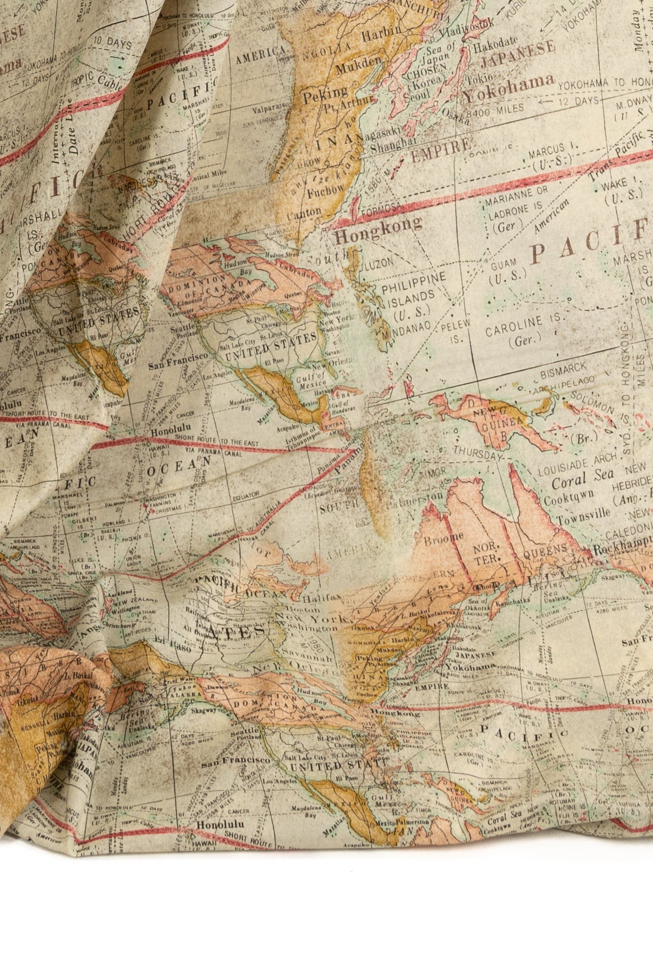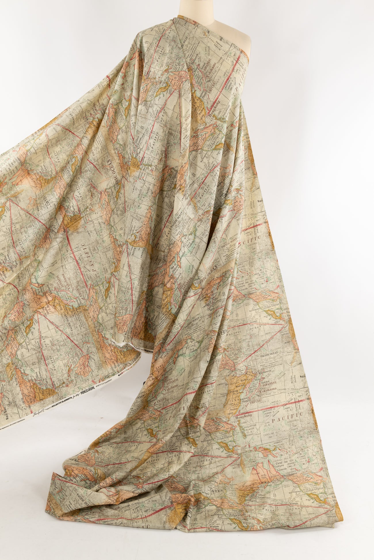 Charming bits of vintage world maps overlap in faded colors accented with black, on a fine-grained cotton woven. Lightweight, opaque with a smooth matte hand, a 24¼" repeat and light drape. Right for a dress, shirt, skirt, tunic, top, soft pant, caftan, kimono, loungewear, men's or children's.