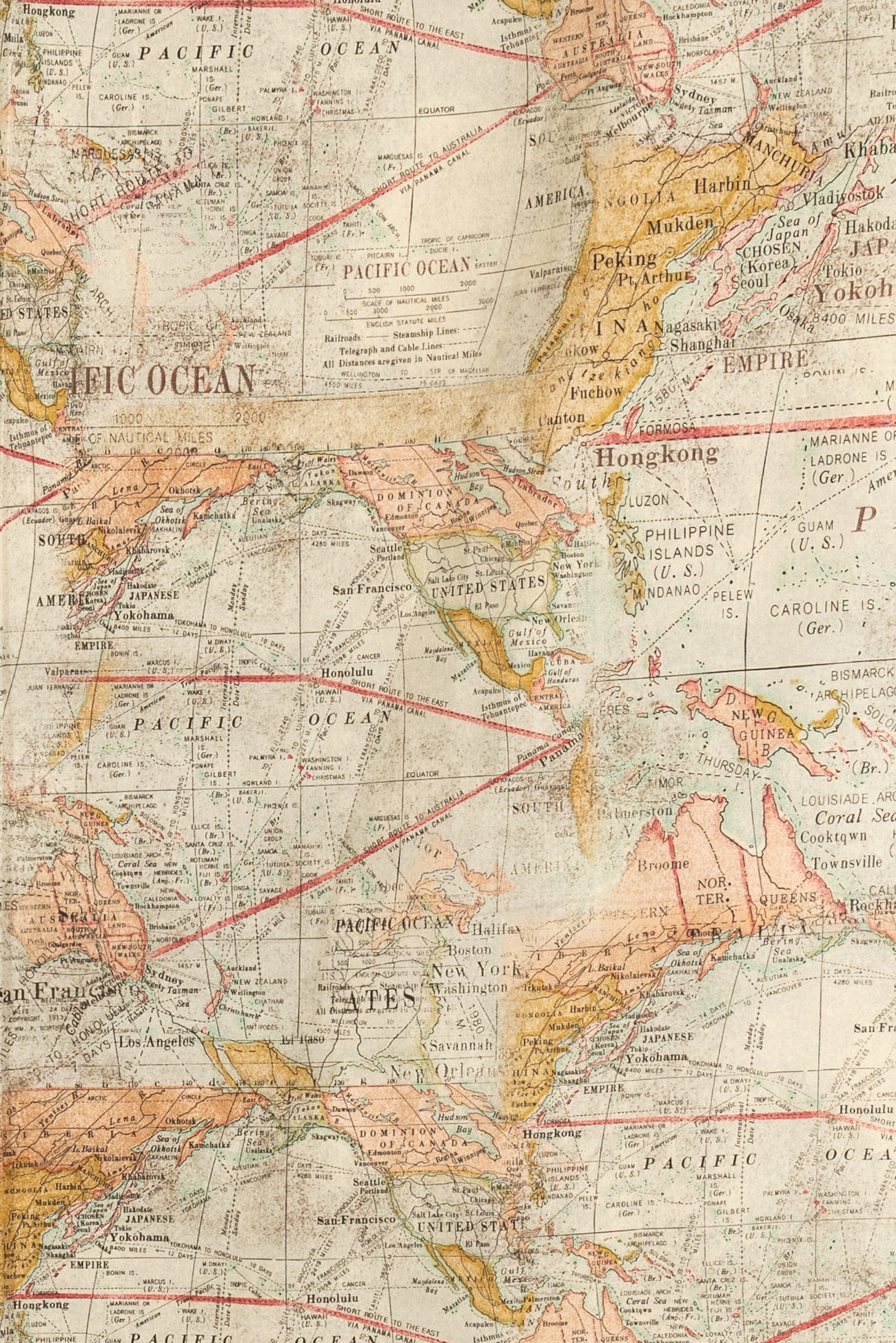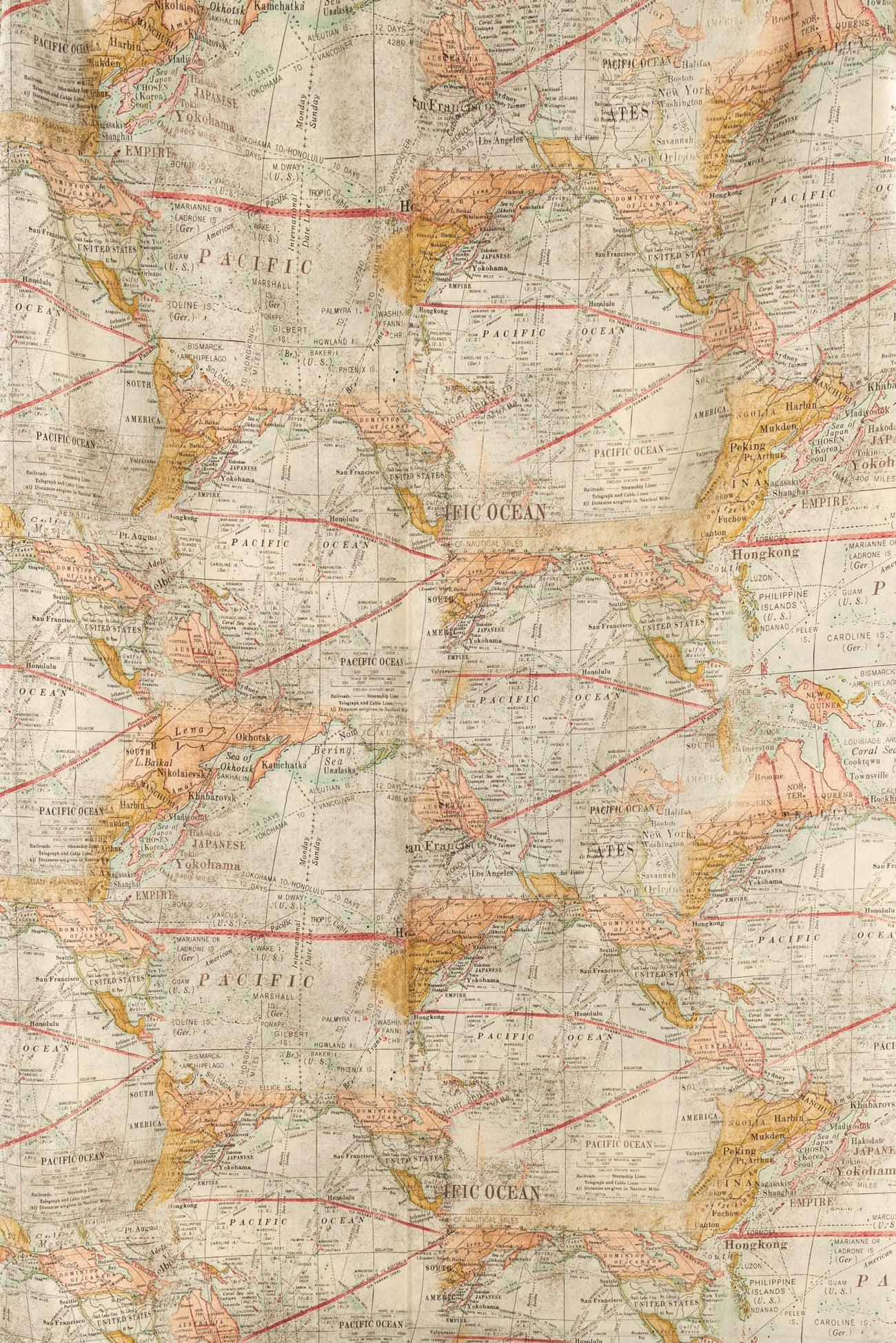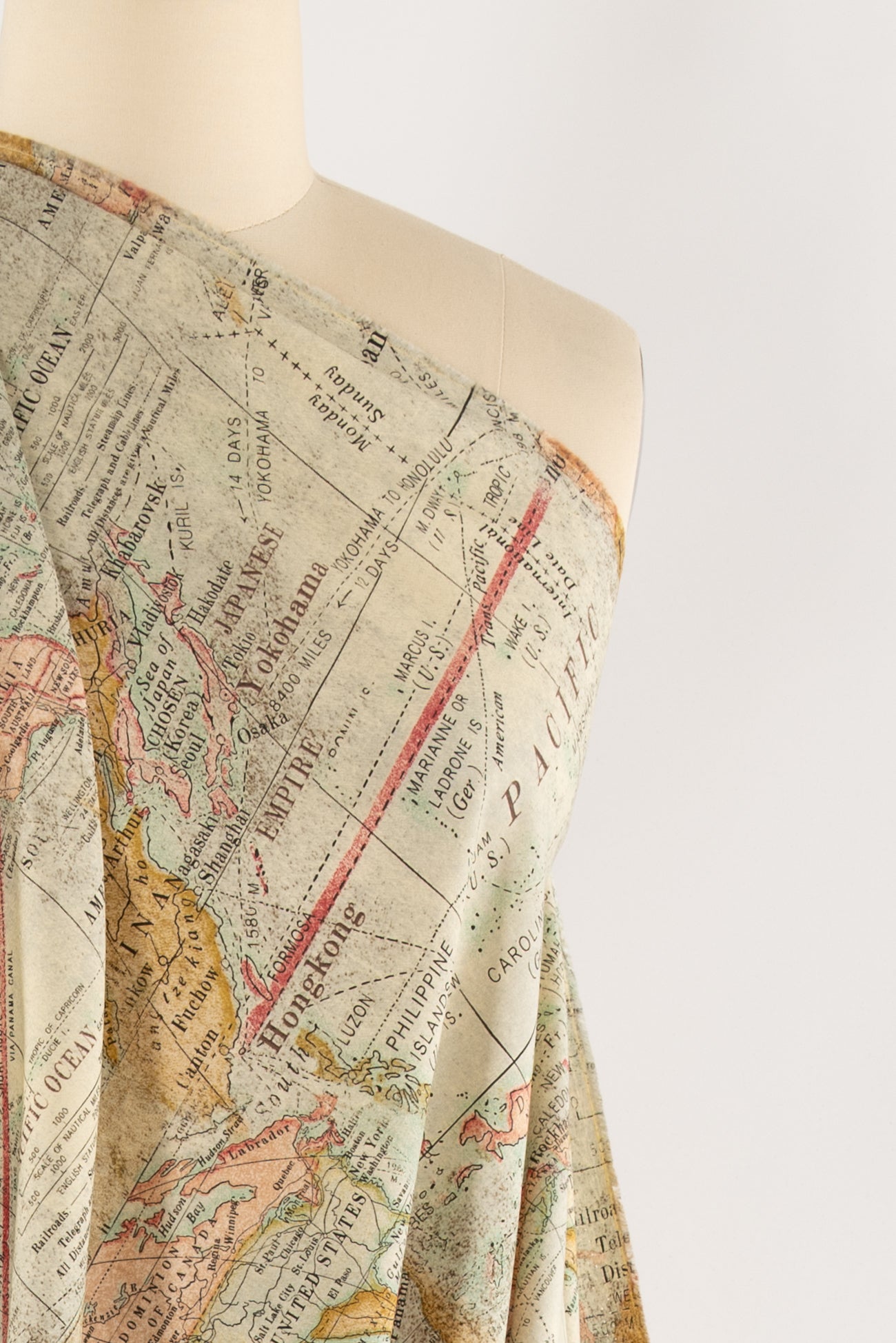 Charming bits of vintage world maps overlap in faded colors accented with black, on a fine-grained cotton woven. Lightweight, opaque with a smooth matte hand, a 24¼" repeat and light drape. Right for a dress, shirt, skirt, tunic, top, soft pant, caftan, kimono, loungewear, men's or children's.
