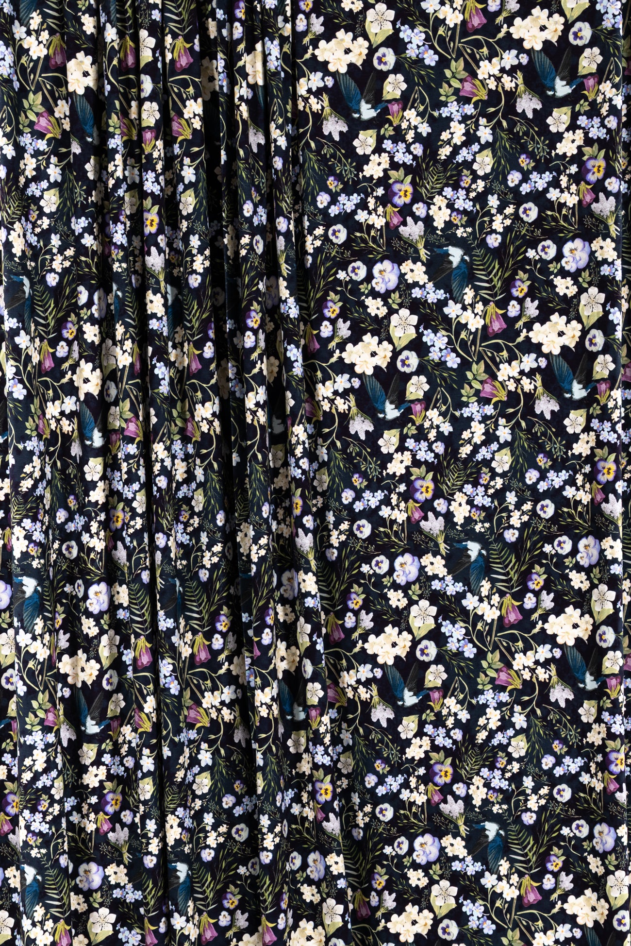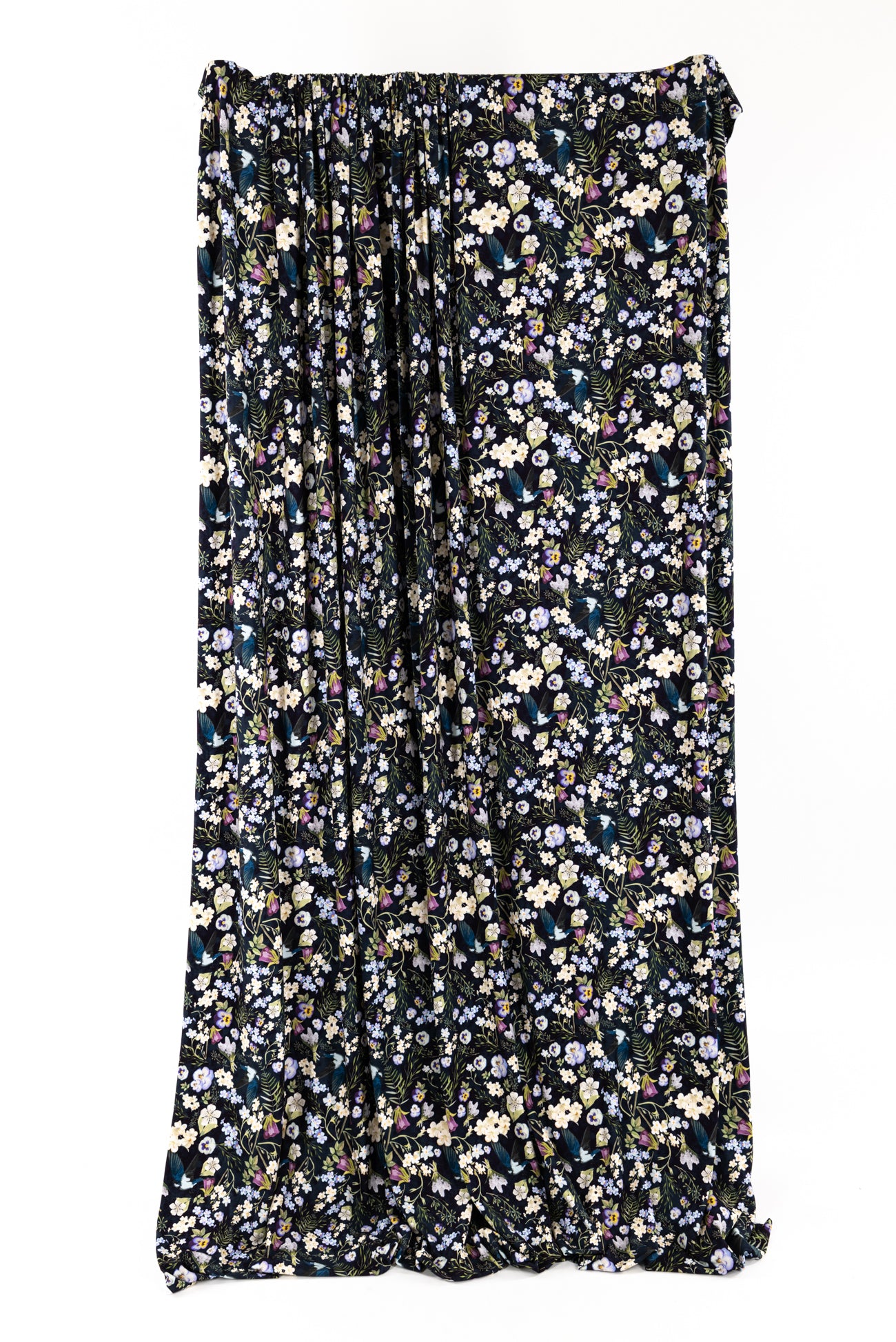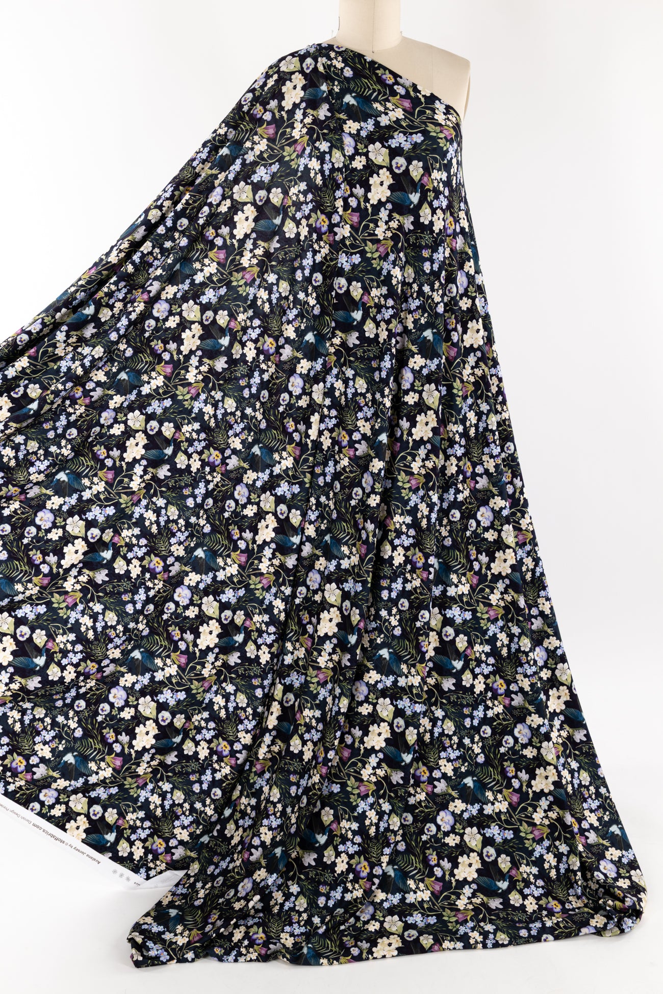 Charming floral in shades of white, yellow, purple and green with blue birds on black, in a gorgeous digital print on an impeccable European quality viscose/spandex knit, produced in Denmark. Light/mid-weight, opaque, with 4-way stretch, some rolling at the cut edge and will skim the body in a flattering way. It has a soft smooth hand, 12" repeat and fluid drape. Right for a dress, t-shirt, soft pants, tunic, skirt, cardi, soft pants, loungewear or children's. Oeko-Tex® and ECOVERO™ certified.