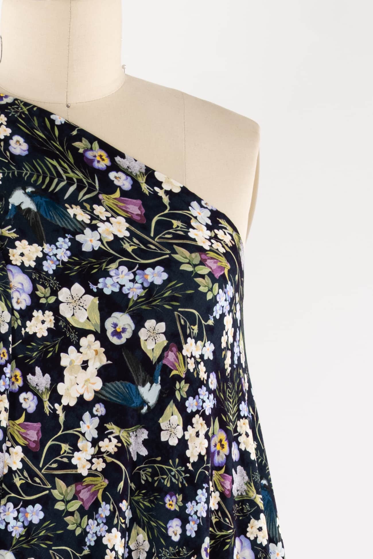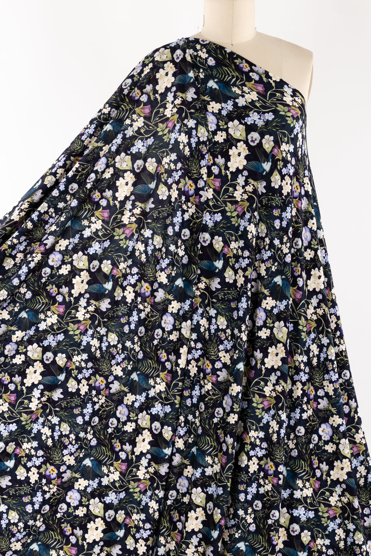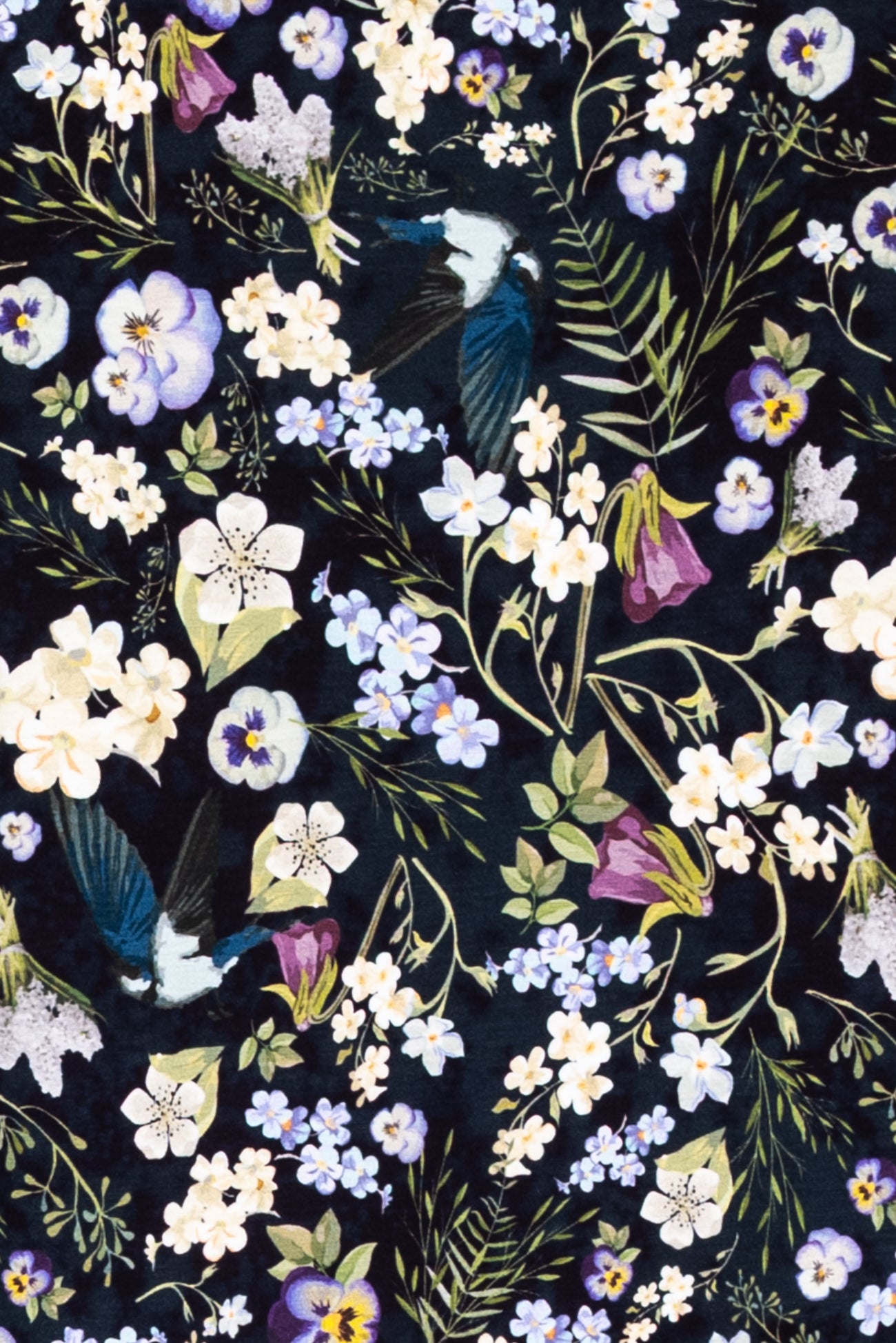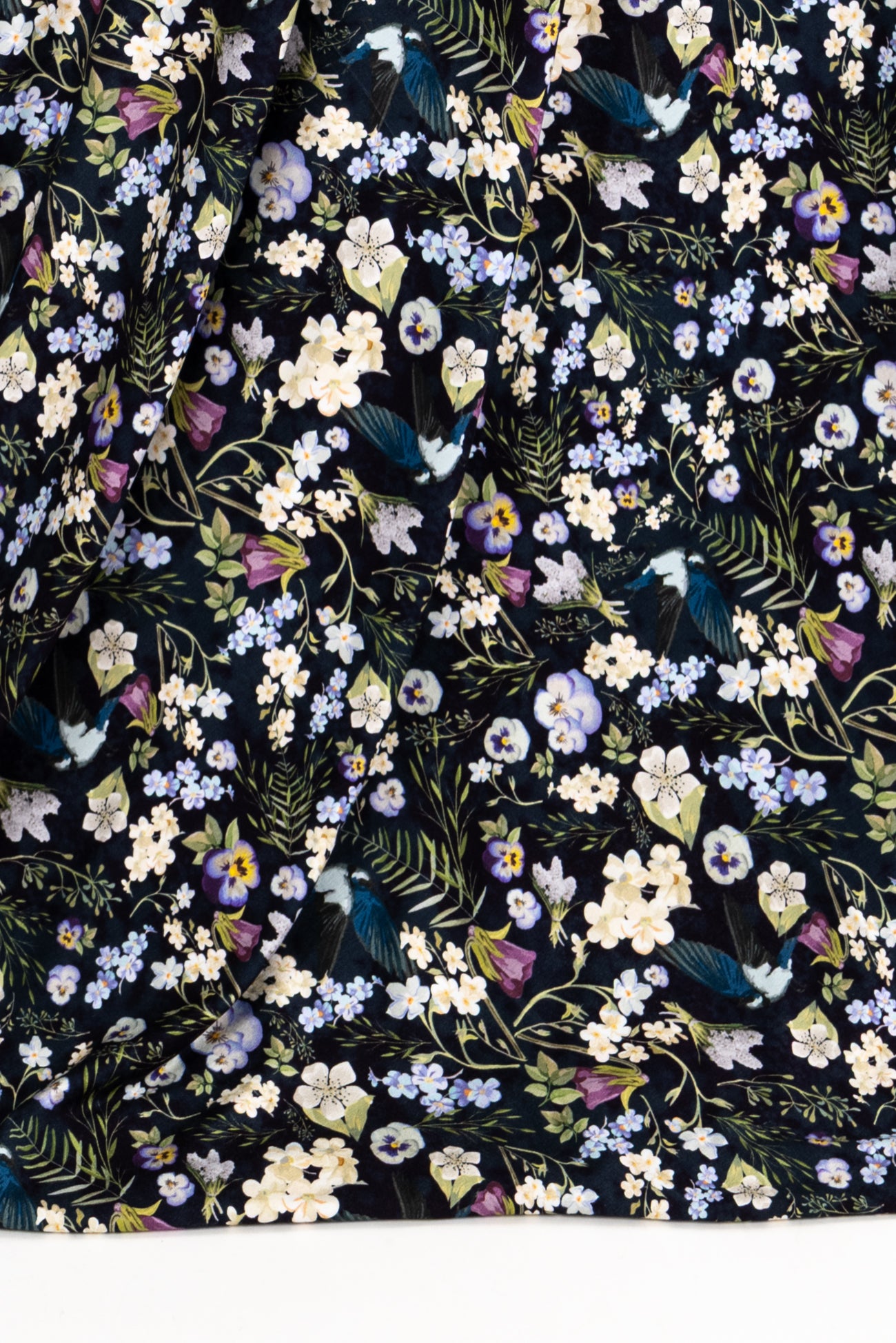 Charming floral in shades of white, yellow, purple and green with blue birds on black, in a gorgeous digital print on an impeccable European quality viscose/spandex knit, produced in Denmark. Light/mid-weight, opaque, with 4-way stretch, some rolling at the cut edge and will skim the body in a flattering way. It has a soft smooth hand, 12" repeat and fluid drape. Right for a dress, t-shirt, soft pants, tunic, skirt, cardi, soft pants, loungewear or children's. Oeko-Tex® and ECOVERO™ certified.