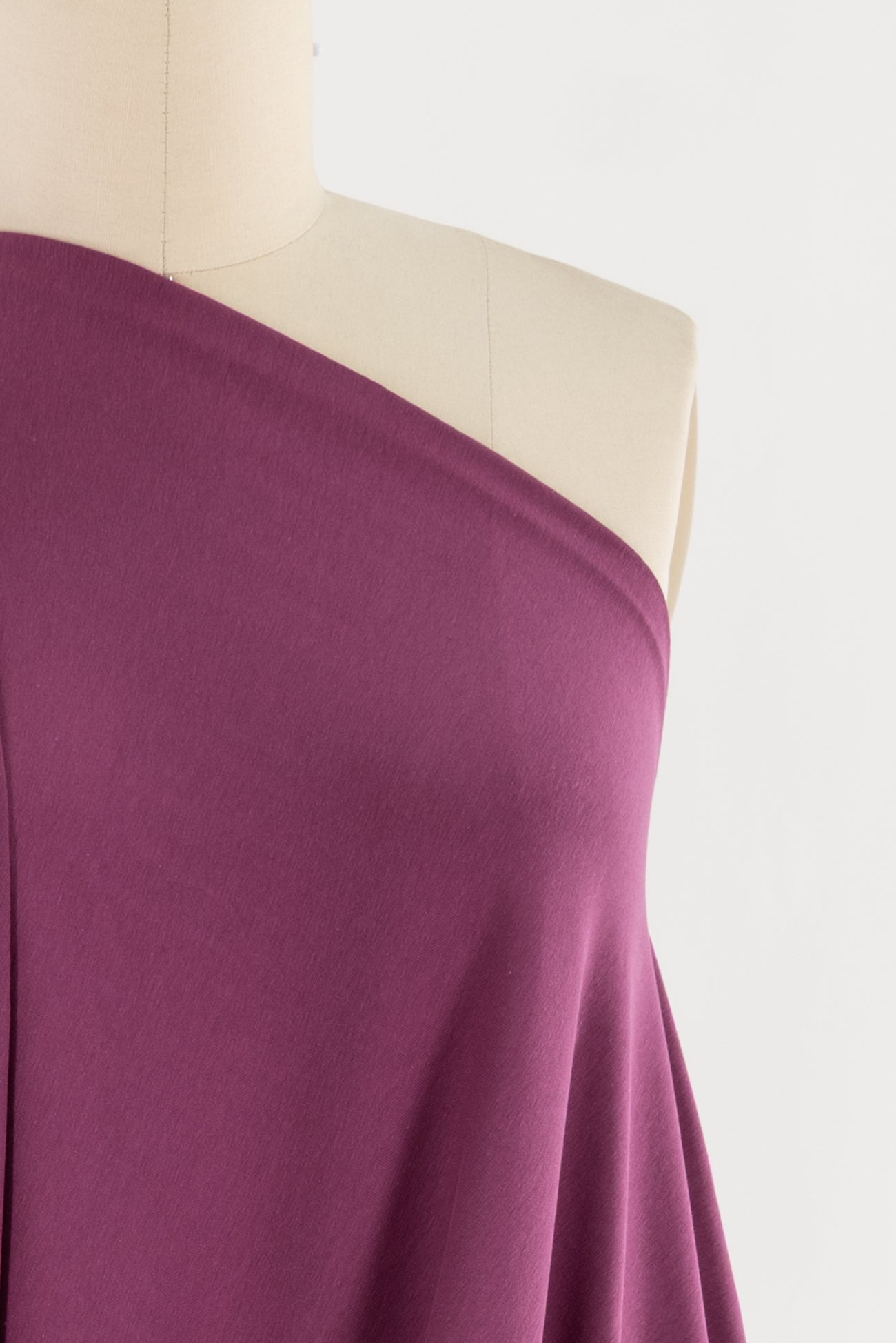 Elegant muted plum on an impeccable European quality cotton/spandex jersey knit, produced in Denmark. Light/mid-weight, opaque, and will skim the body in a flattering way. It has a soft, smooth texture, fluid drape, 4-way stretch, and some rolling at the cut edge. Right for a variety of garments: t-shirt, tunic, dress, soft pants, leggings, cardigan, skirt, or lounge-wear, as well as children's and men's clothing. Oeko-Tex® certified.