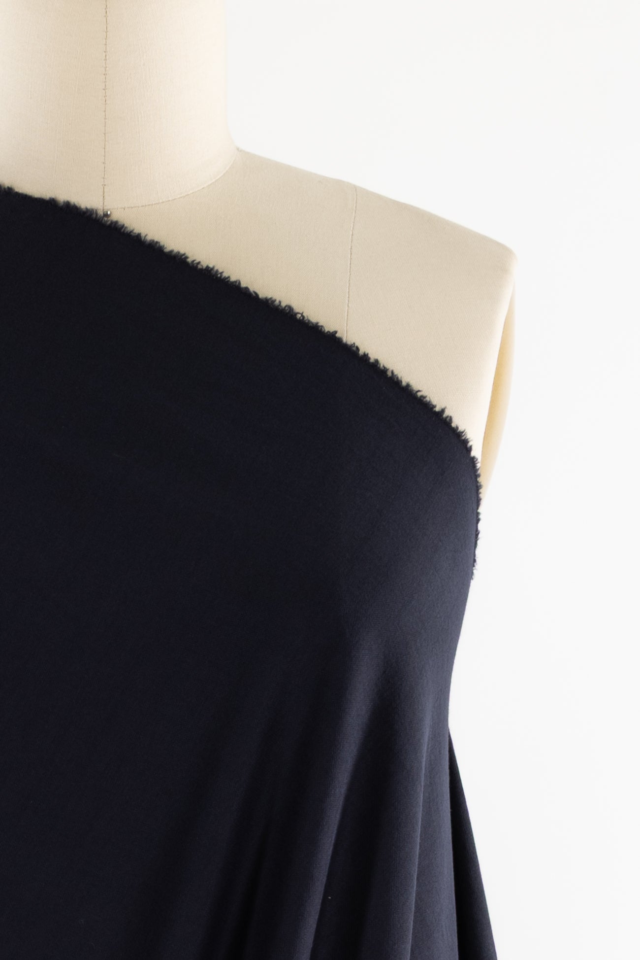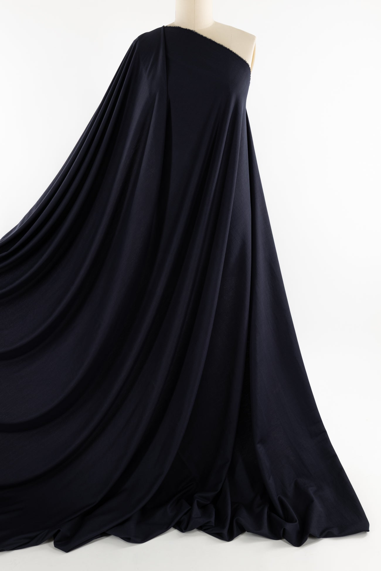 I am thrilled to offer this new beautiful basic, in navy, similar in fiber content, hand, and drape to those used by Eileen Fisher; a fine-grained knit with a unique combination of sophistication, comfort, and stretch. Unique - this is a knit that looks like a woven, mid/light weight, opaque (no lingerie show through on this color), stable, with crosswise stretch and a beautiful fluid drape. Right for both tops and bottoms. Perfect for pants, right for a light jacket, shirt, tunic, dress, skirt, jumpsuit. Marcy says, 'The rayon adds softness and drape, while the nylon adds smoothness and stretch, an ideal blend, perfect for travel and wardrobing.'