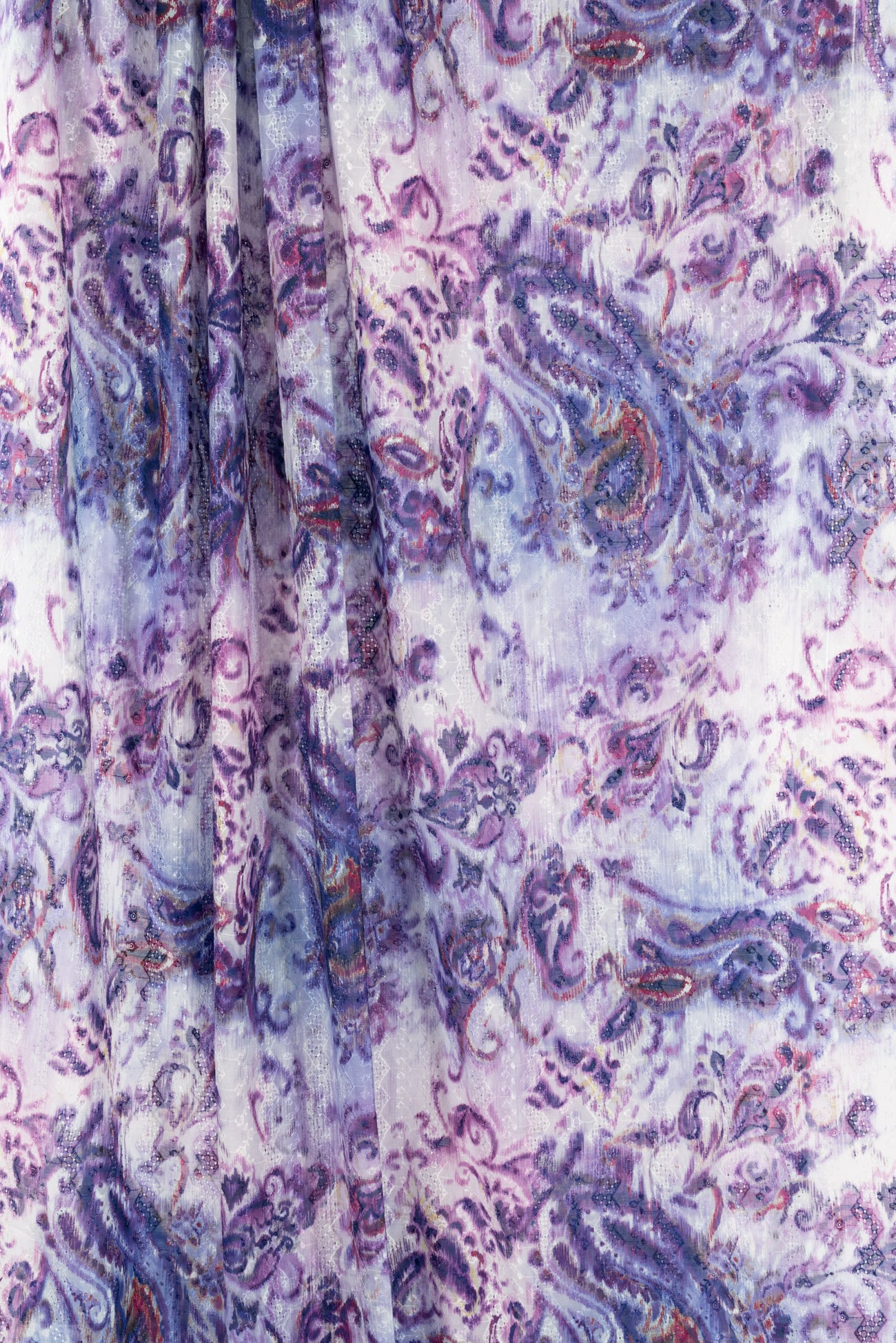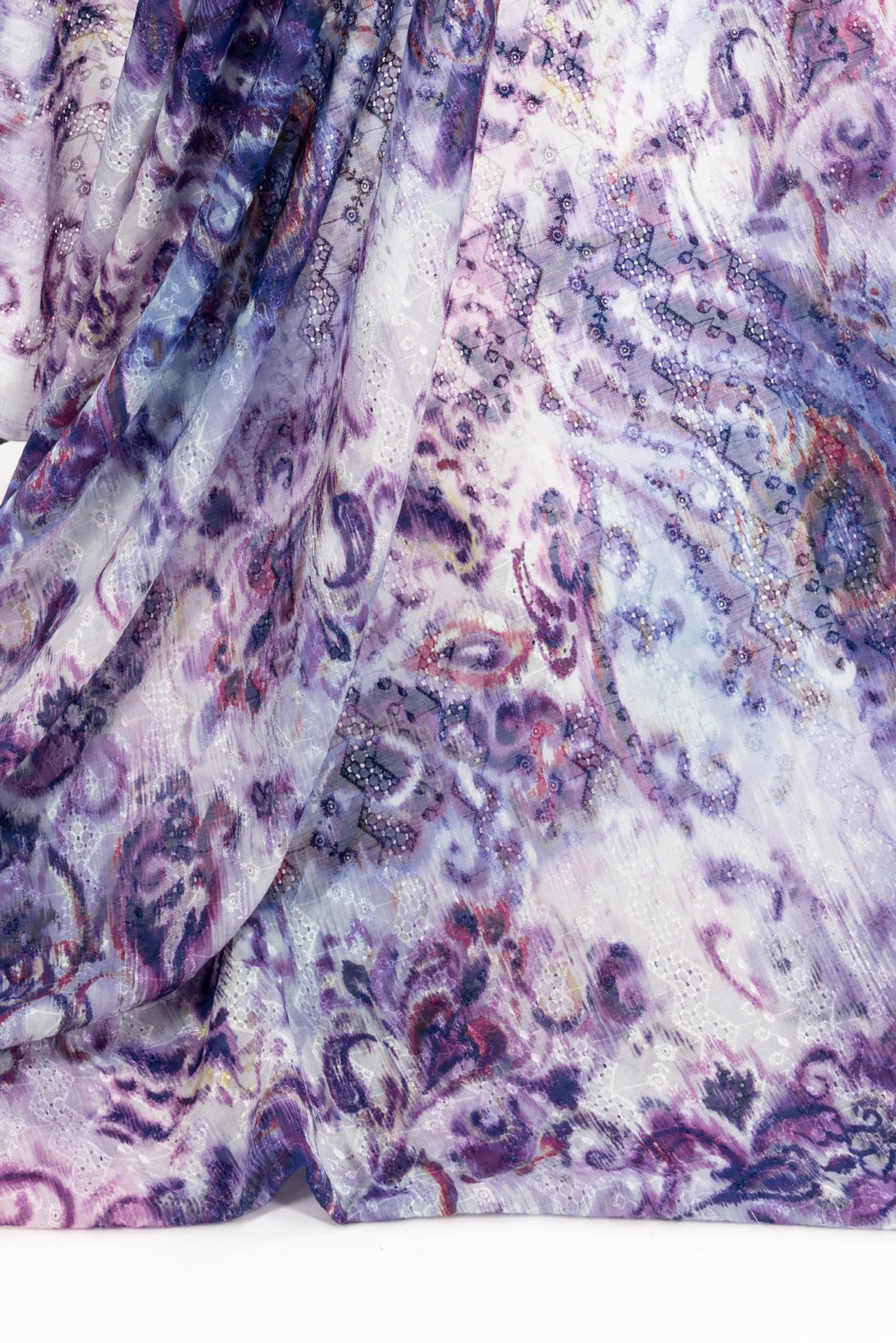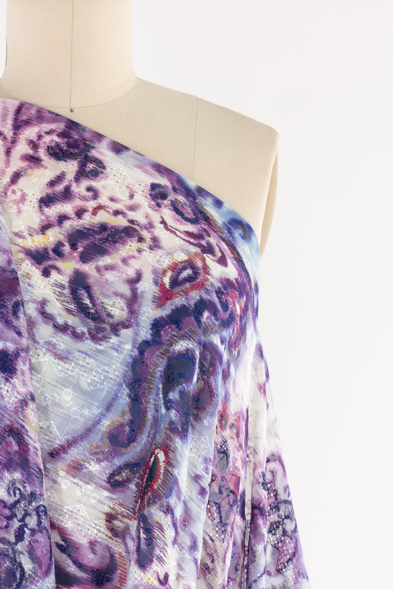 Stunning purple paisley and floral is printed on a fine white silk/cotton eyelet lawn. Lightweight, semi-sheer, with a softly textured silky hand, 31¼" repeat and supple airy drape - the embroidery adds a bit of weight to the drape. Right for a dress, shirt, blouse, tunic, caftan, kimono, caftan or children's. Limited quantity available.