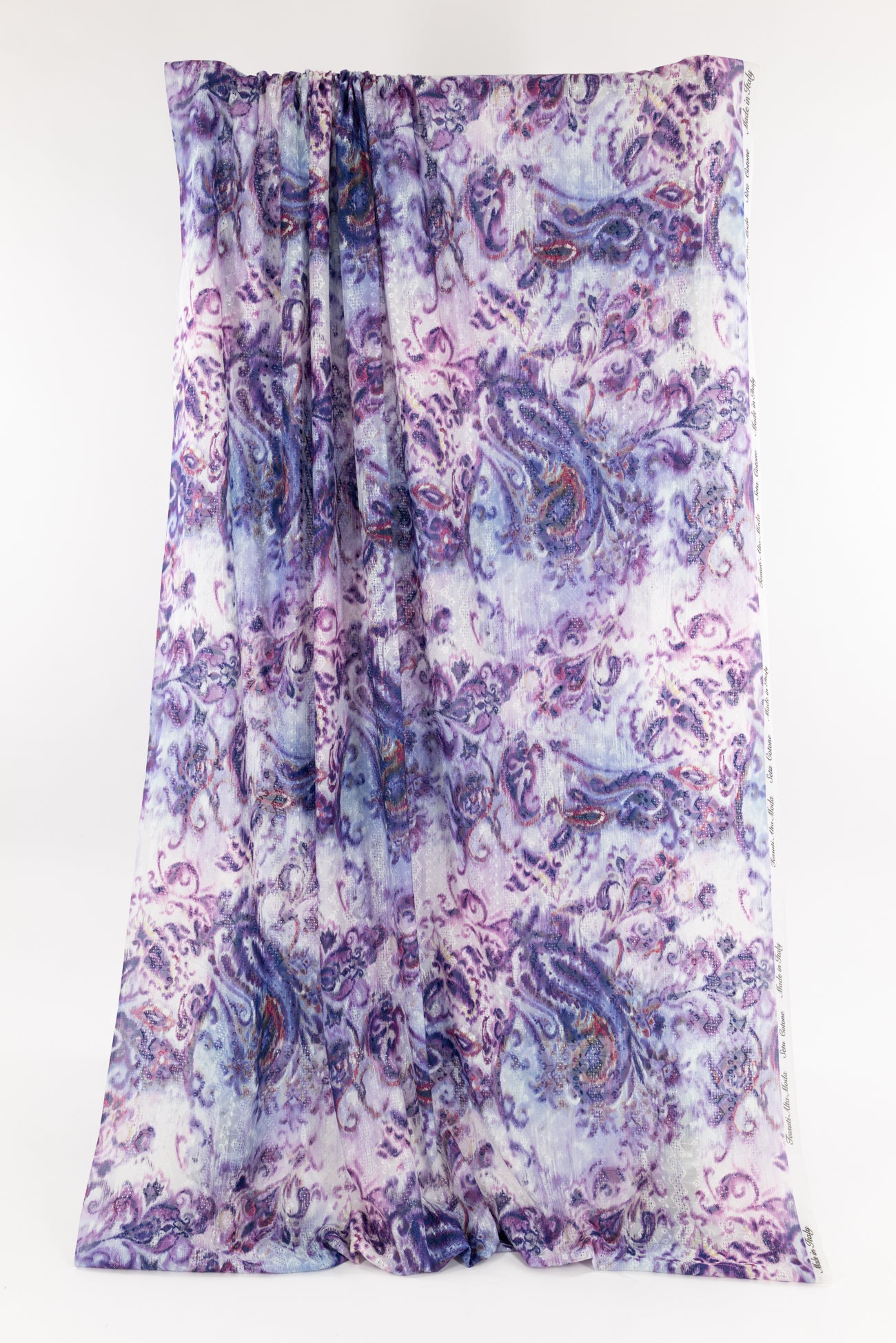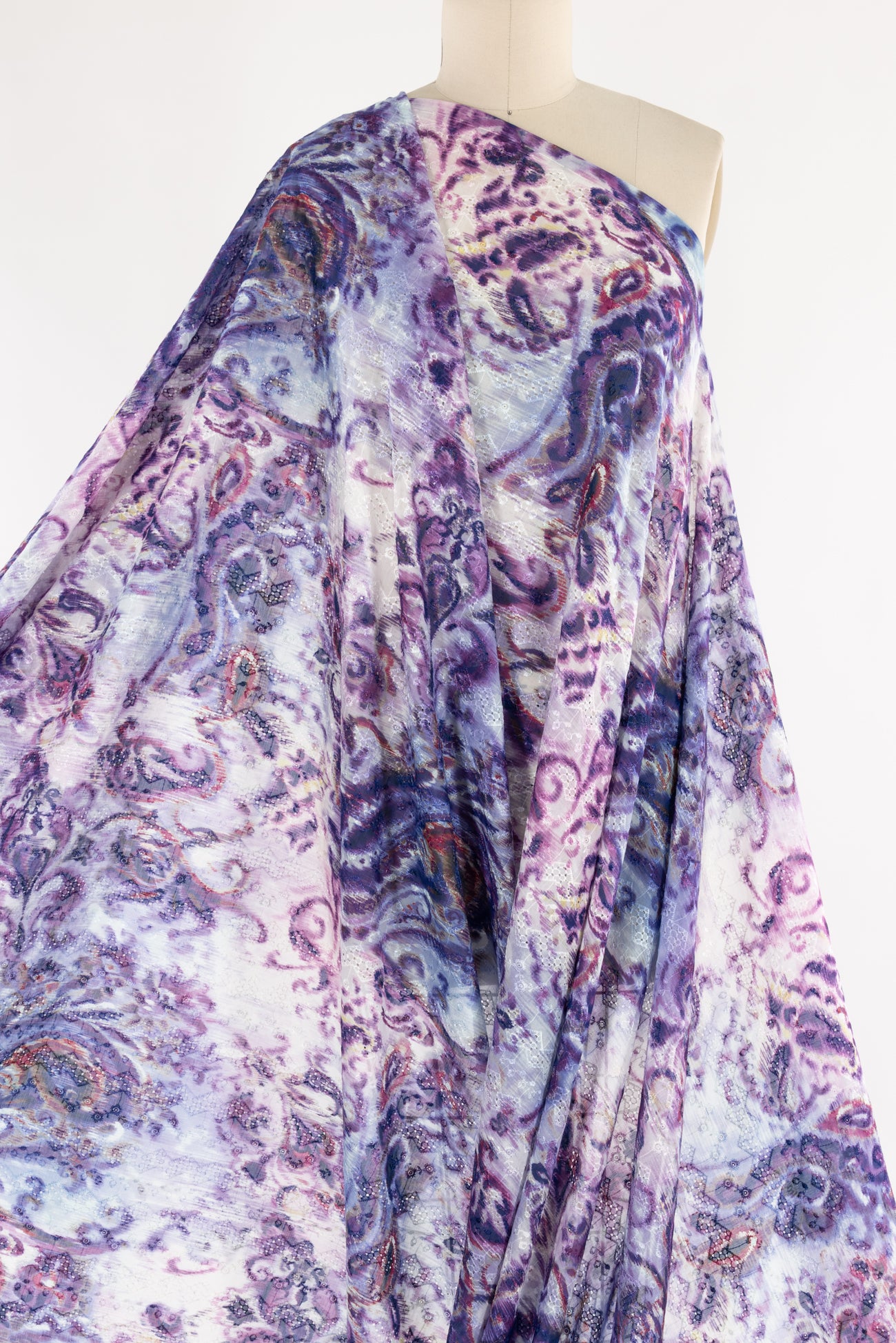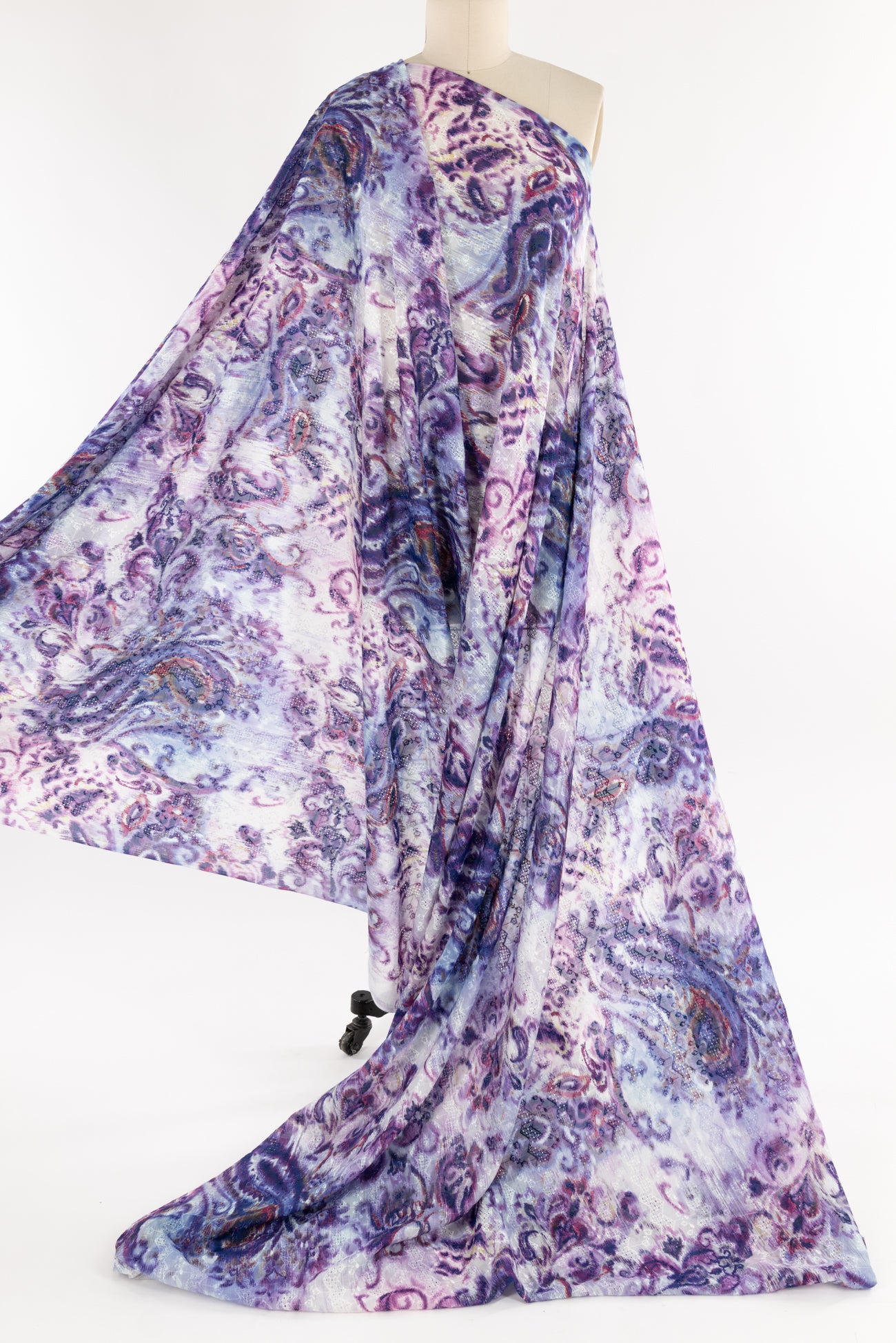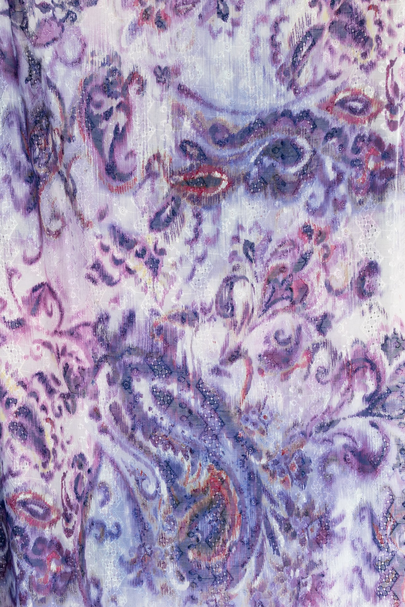 Stunning purple paisley and floral is printed on a fine white silk/cotton eyelet lawn. Lightweight, semi-sheer, with a softly textured silky hand, 31¼" repeat and supple airy drape - the embroidery adds a bit of weight to the drape. Right for a dress, shirt, blouse, tunic, caftan, kimono, caftan or children's. Limited quantity available.
