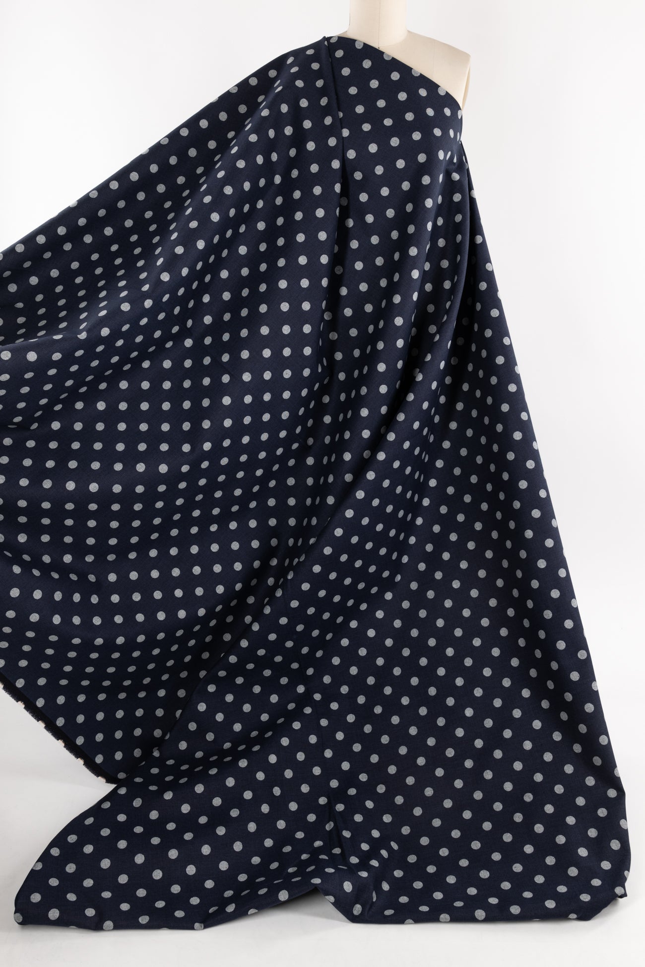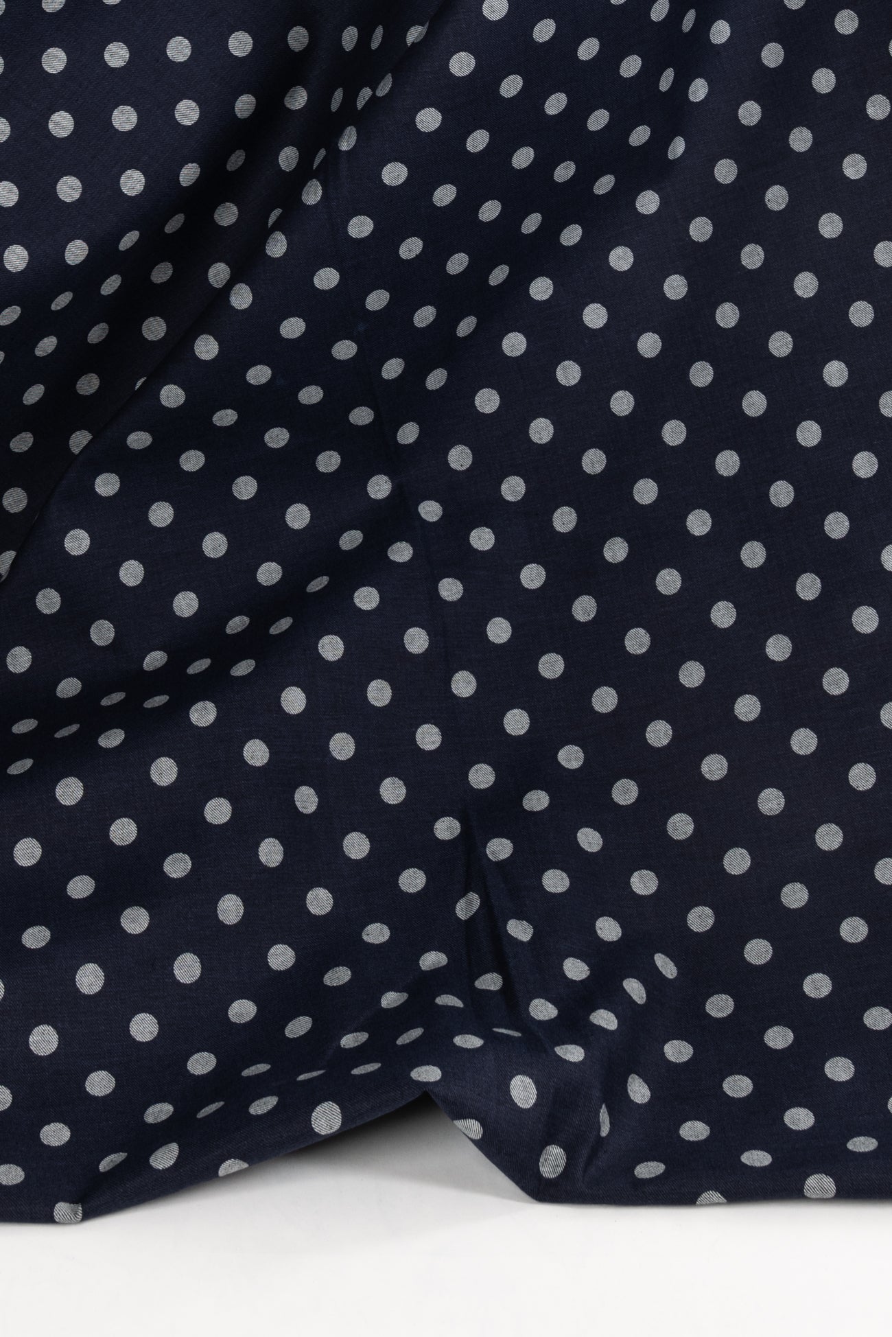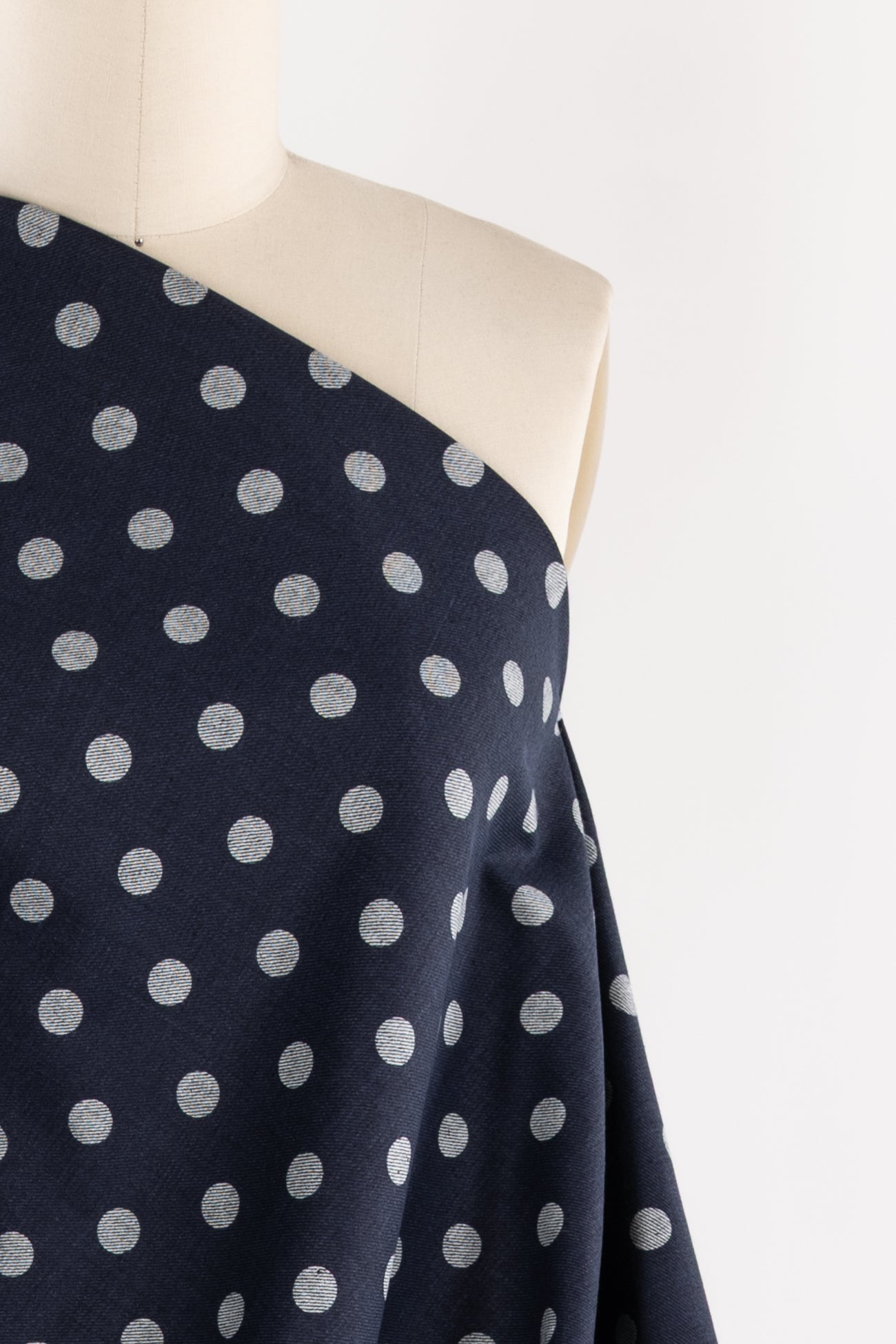 A delight of dots on denim. Top quality digitally printed deadstock from an Italian mill, made for Milanese brand J@cob Cohën, known for 'transforming denim into everyday luxury'. Think $400 jeans. A deep blue ground printed on the backside of classic navy denim creates the subtly striped ½" dots on this double-sided beauty. Use either or both sides. Mid/heavyweight with a lightly textured twill hand and structured drape. No stretch. Right for workwear, jeans, a light jacket or coat, dress, skirt, tunic, top, jumpsuit, men's or children's. Limited quantity available.