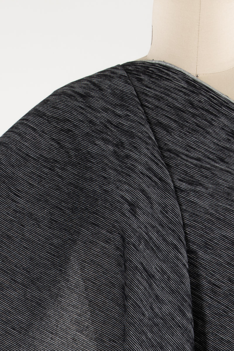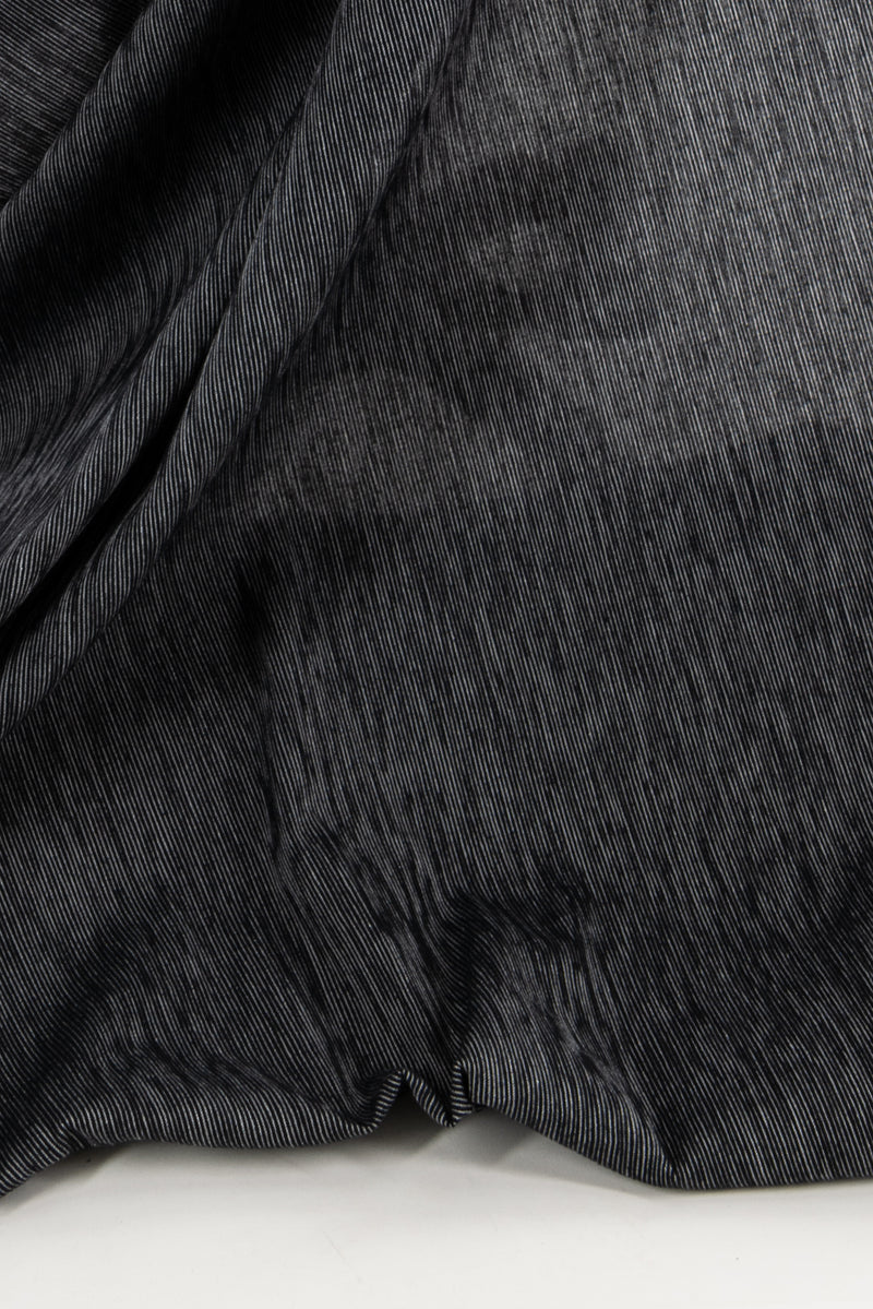 Cutting edge contemporary textile technology with a sophisticated effect! Clear black and white stripe shirting cotton with mechanically created pintucks which give an overall crinkle pattern. Finest quality Japanese cotton. The tucks add both a bit of dimension/texture, some crosswise stretch and a soft lightly crisp drape. The surprise with this fabric is that the tucks create a crosswise stretch with excellent recovery, so you could use as a stretch woven. The weight is right for a shirt, tunic, light jacket, soft pants, skirt, dress, or vest.