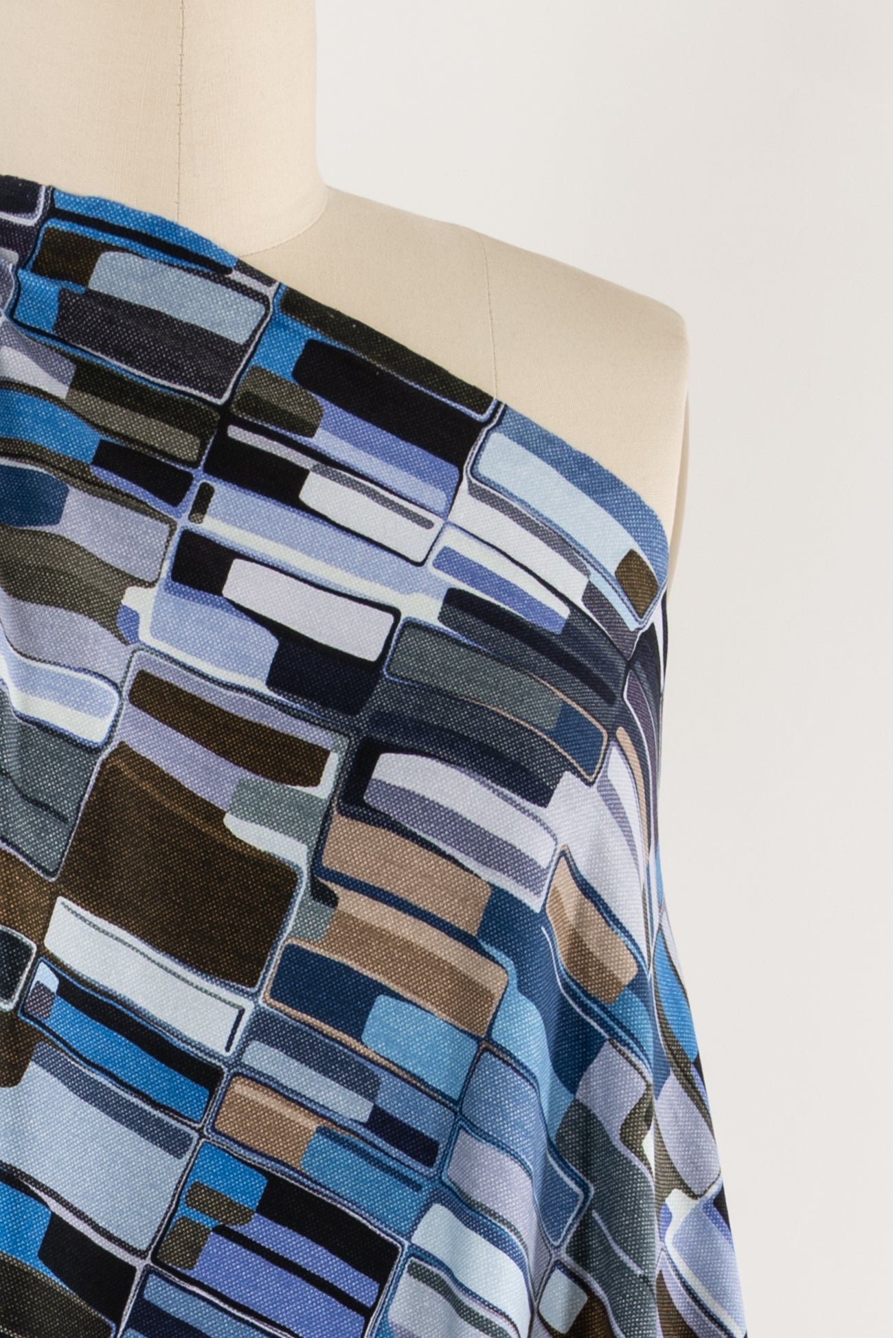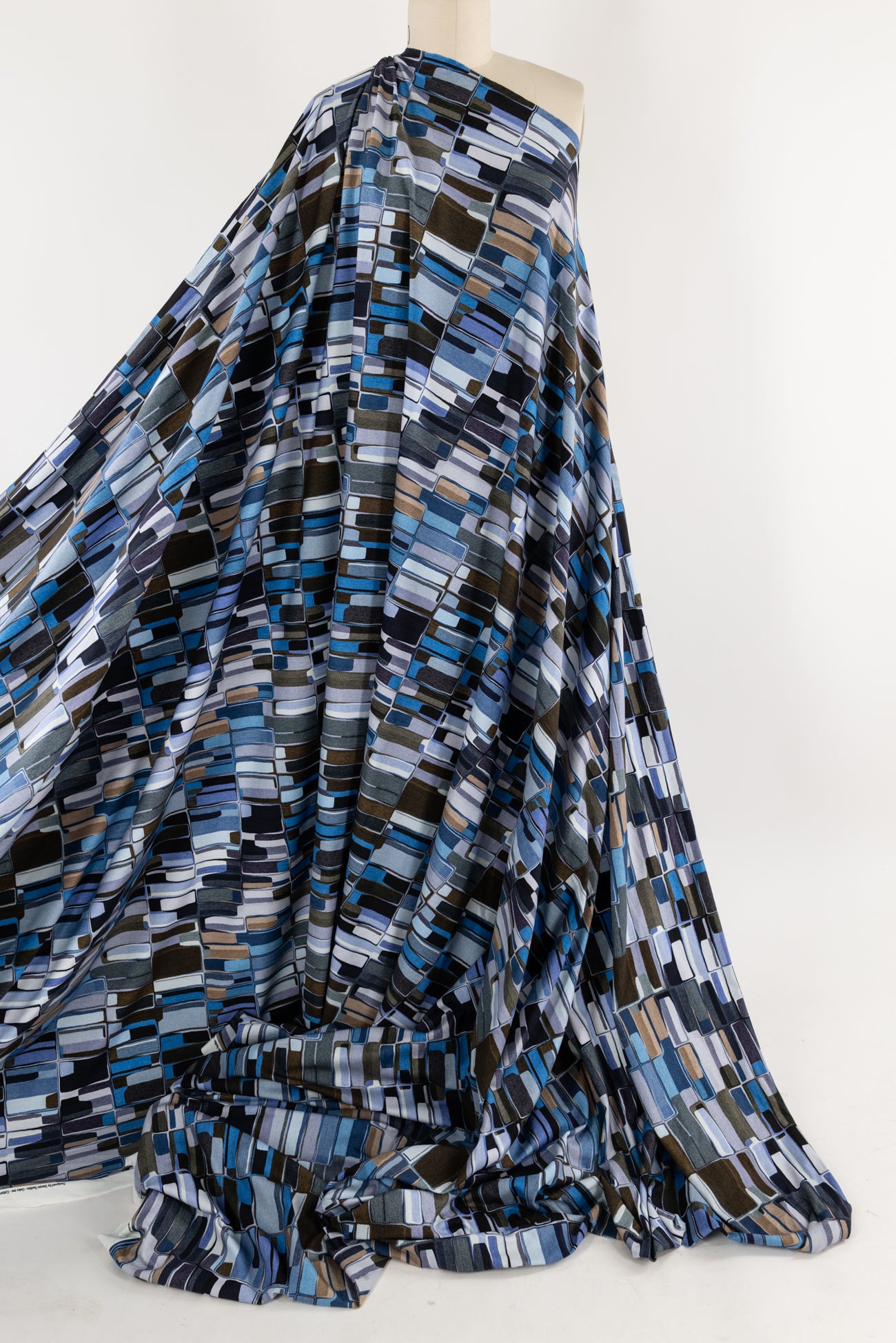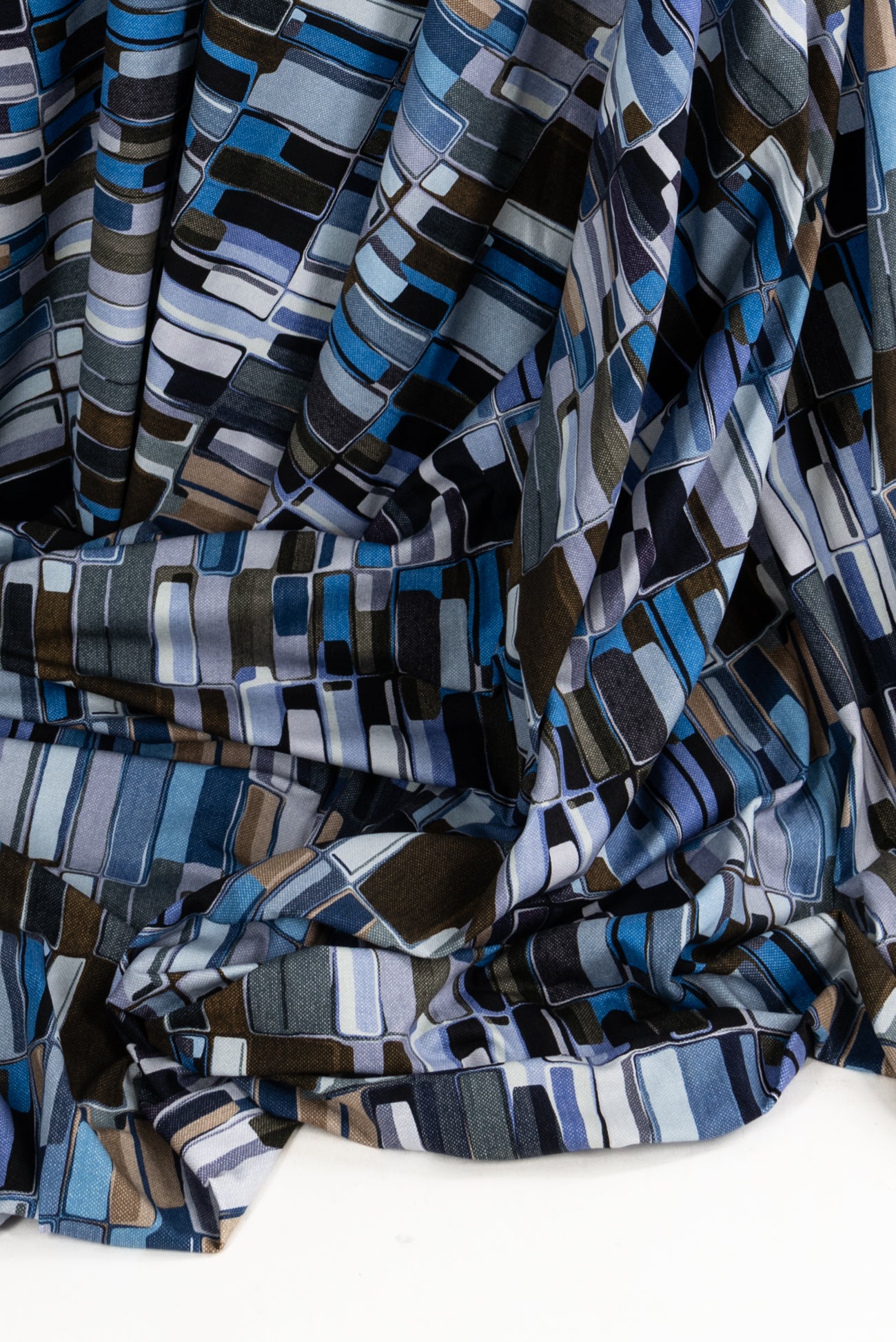 Contemporary cool toned geometric in shades of blue, brown, ecru, and white accented with black, digitally printed on luxurious cotton knit jersey in the Netherlands. Impeccable quality, light/mid-weight, opaque, with a flattering body-skimming flow, appealing soft hand, fluid drape, crosswise stretch, some lengthwise stretch, 12" repeat, one-way design, and some rolling at the cut edge. Ideal for a wide range of garments, t-shirt, tunic, dress, skirt, soft pants, loungewear, caftan, kimono, men's, or children's. Oeko-Tex® certified.