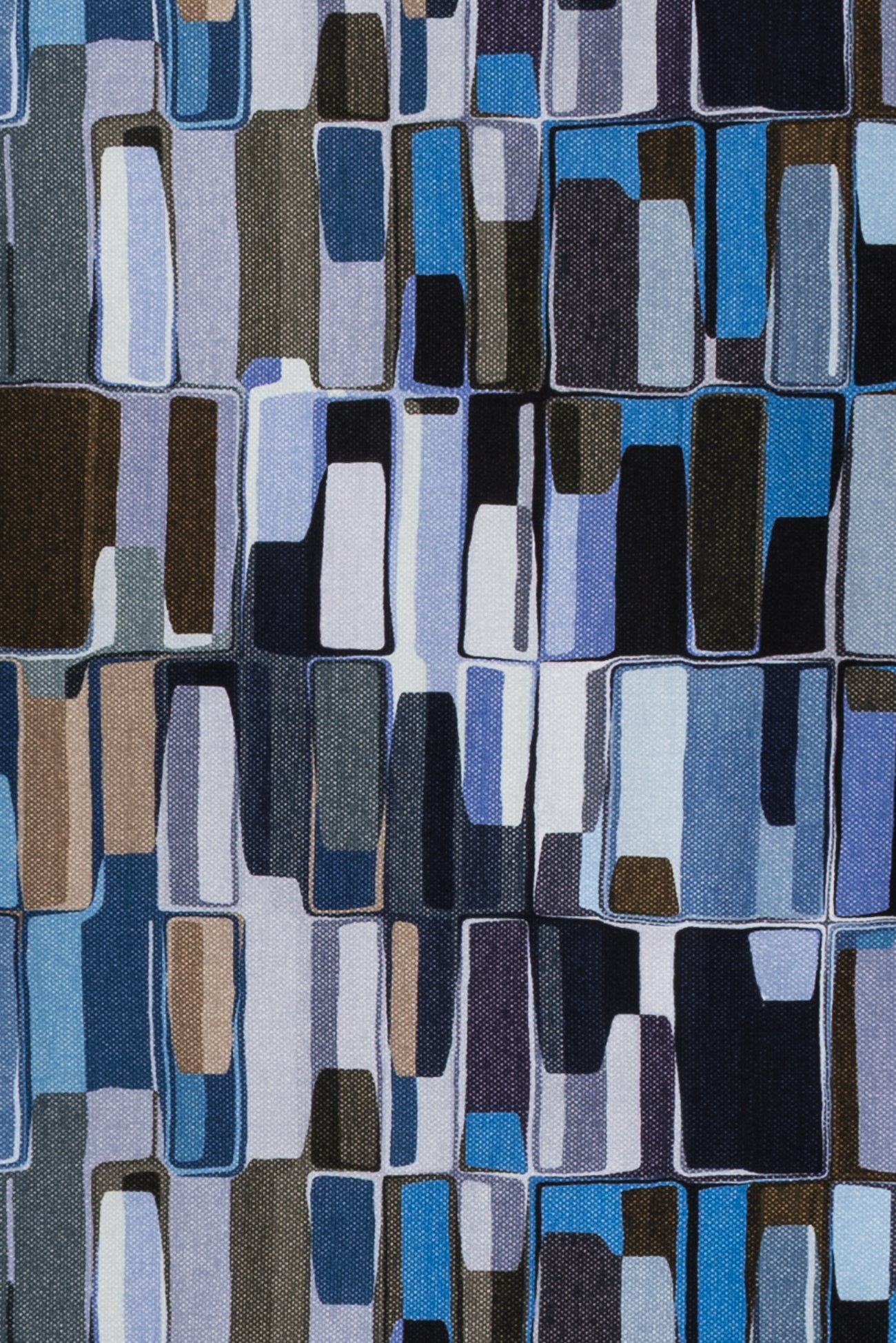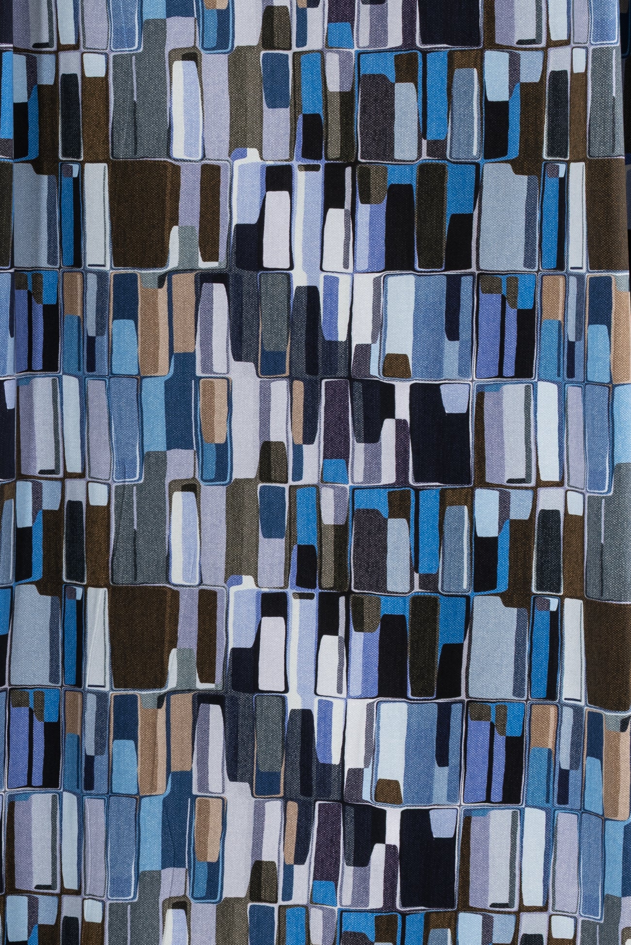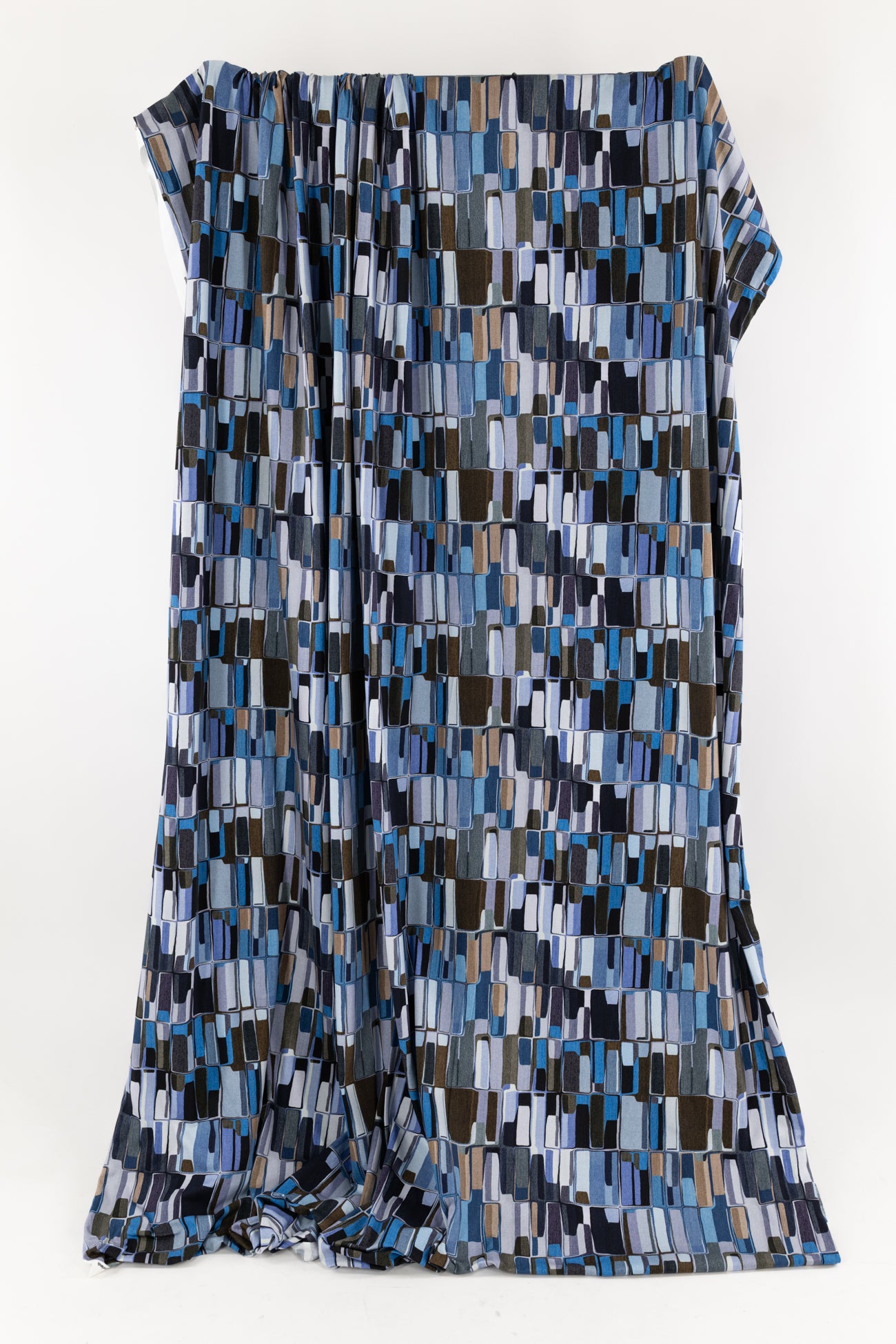 Contemporary cool toned geometric in shades of blue, brown, ecru, and white accented with black, digitally printed on luxurious cotton knit jersey in the Netherlands. Impeccable quality, light/mid-weight, opaque, with a flattering body-skimming flow, appealing soft hand, fluid drape, crosswise stretch, some lengthwise stretch, 12" repeat, one-way design, and some rolling at the cut edge. Ideal for a wide range of garments, t-shirt, tunic, dress, skirt, soft pants, loungewear, caftan, kimono, men's, or children's. Oeko-Tex® certified.