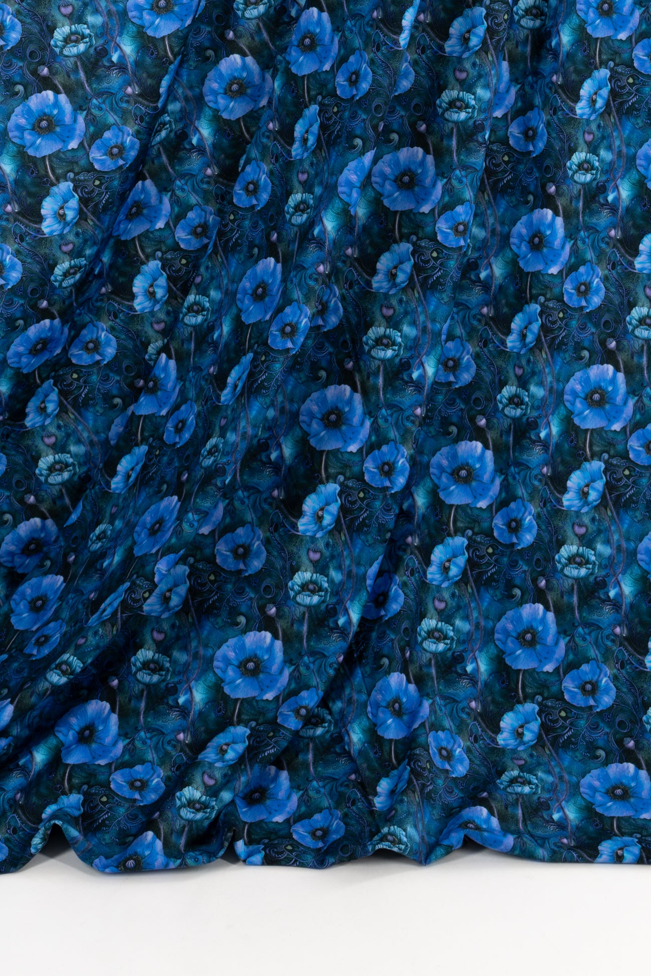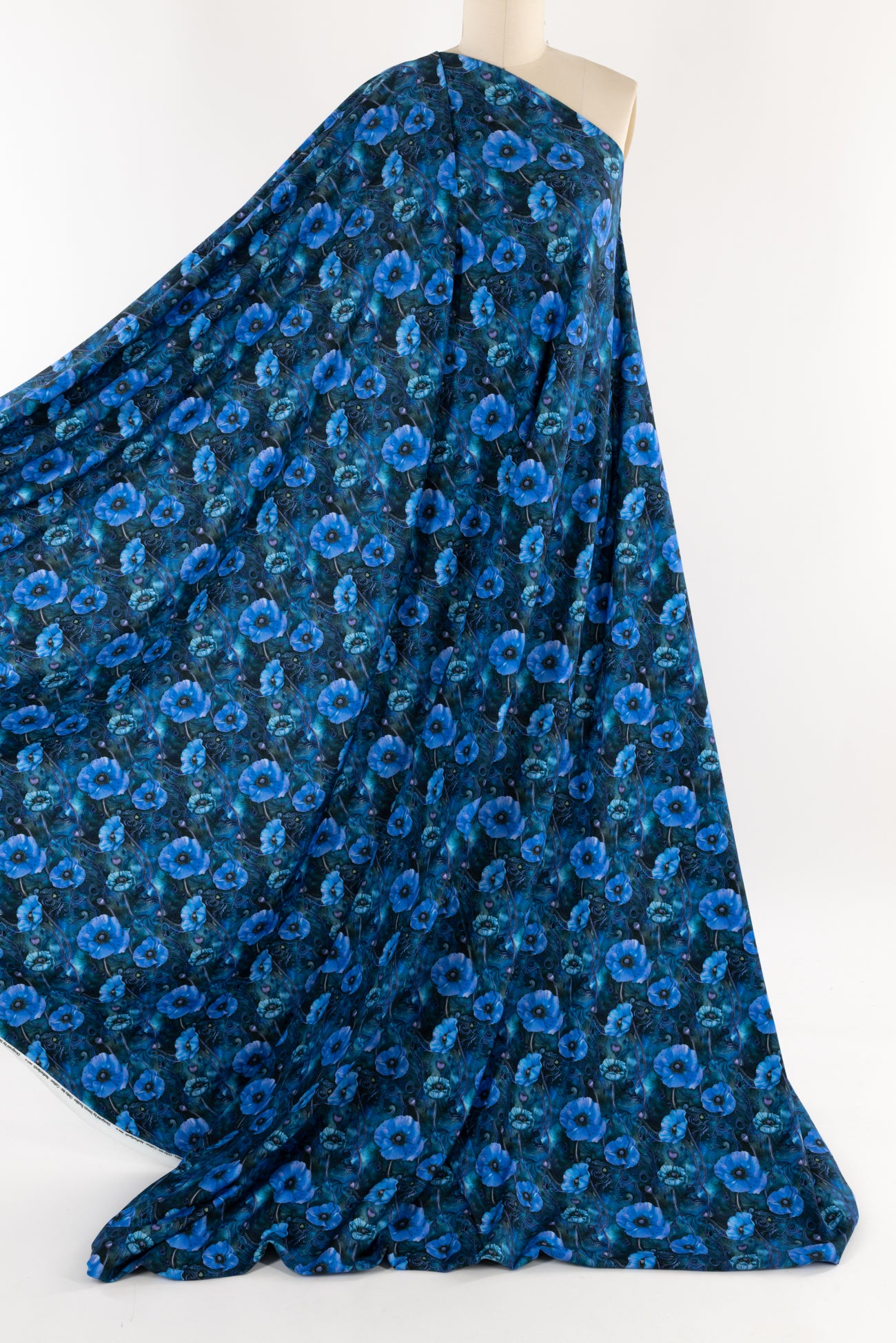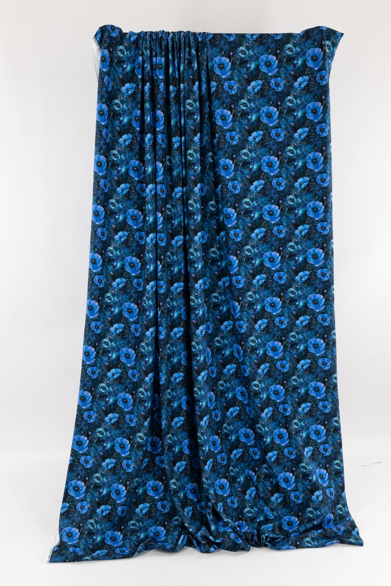 Brilliant blue poppies with violet accents, digitally printed on luxurious cotton French Terry. Impeccable quality, light/mid-weight, with a flattering body-skimming flow, smooth face, super soft cozy brushed white back side, supple drape, crosswise stretch, some lengthwise stretch, a 6" repeat and rolling at the cut edge. Right for a variety of garments such as T-shirts, tunics, dresses, skirts, soft pants, loungewear, a hoodie, light jacket, men's or children's. Oeko-Tex® certified.
