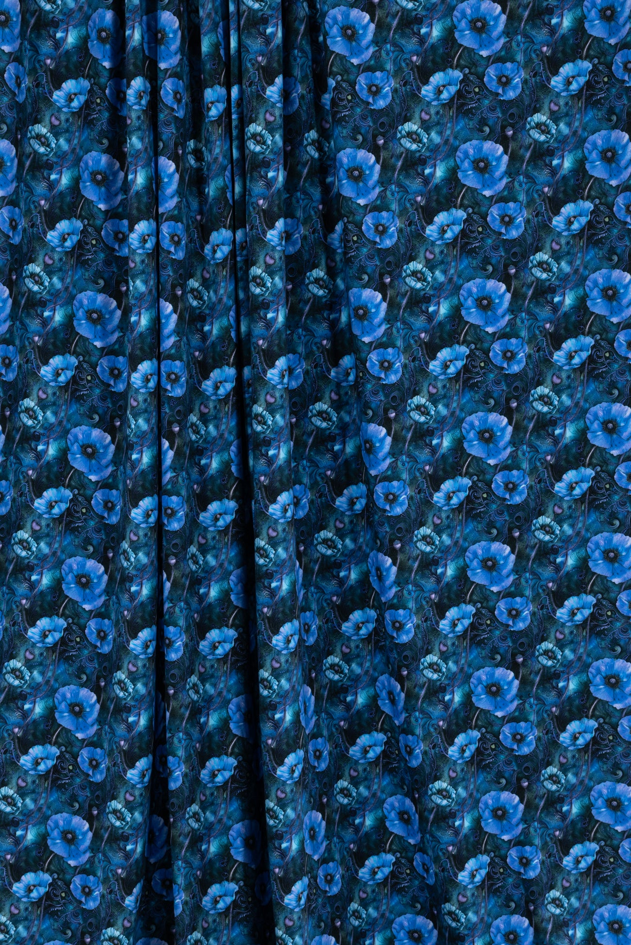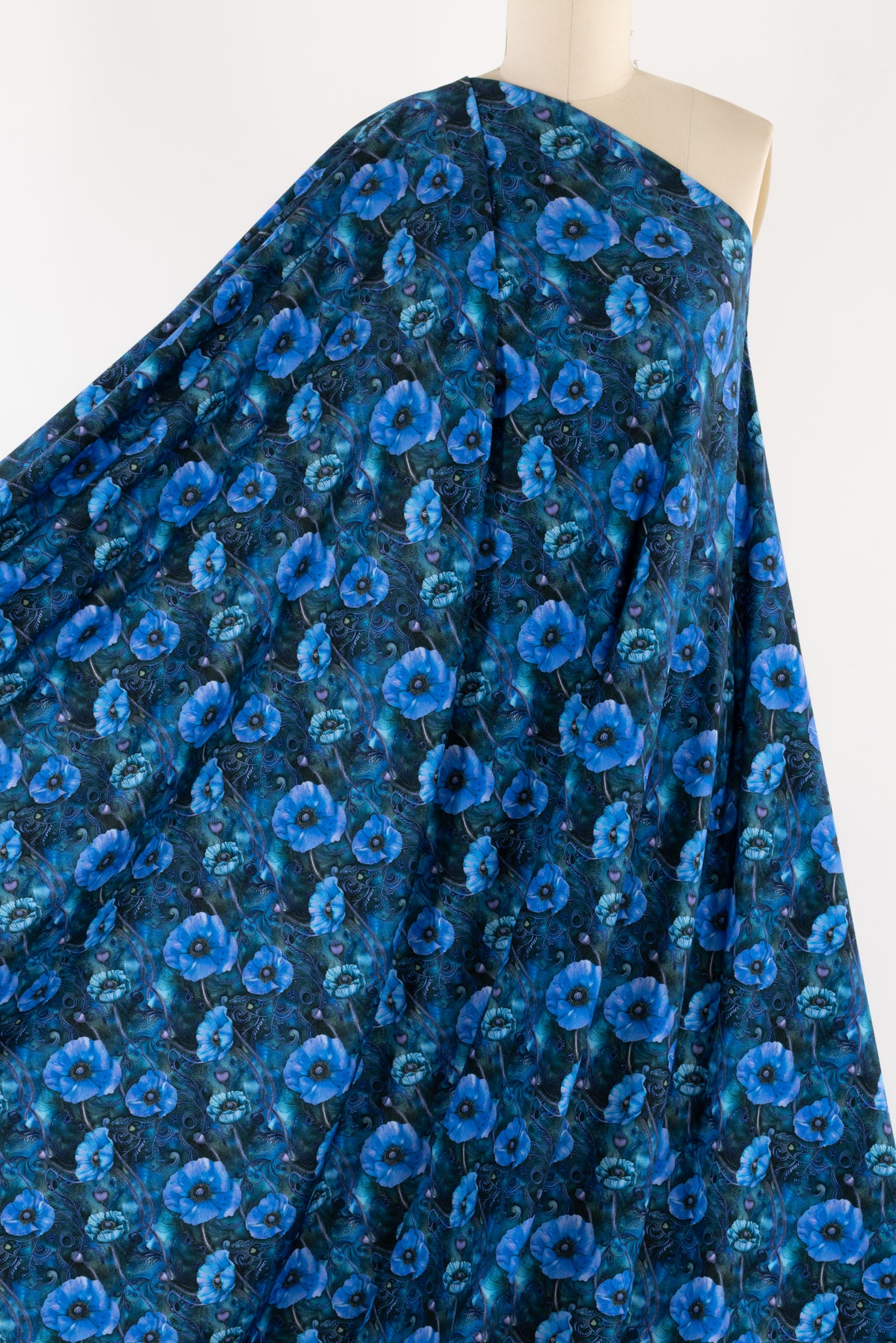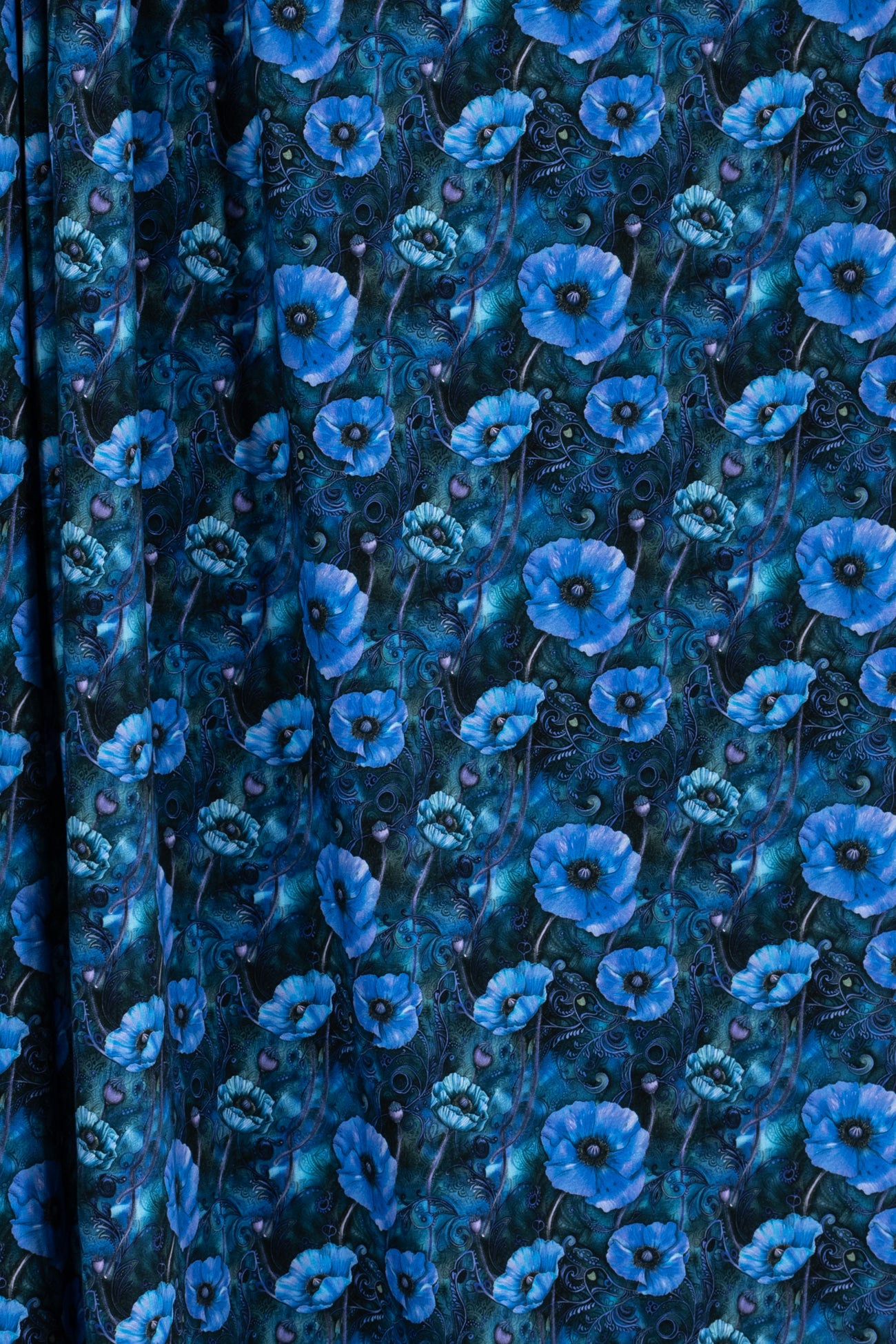 Brilliant blue poppies with violet accents, digitally printed on luxurious cotton French Terry. Impeccable quality, light/mid-weight, with a flattering body-skimming flow, smooth face, super soft cozy brushed white back side, supple drape, crosswise stretch, some lengthwise stretch, a 6" repeat and rolling at the cut edge. Right for a variety of garments such as T-shirts, tunics, dresses, skirts, soft pants, loungewear, a hoodie, light jacket, men's or children's. Oeko-Tex® certified.