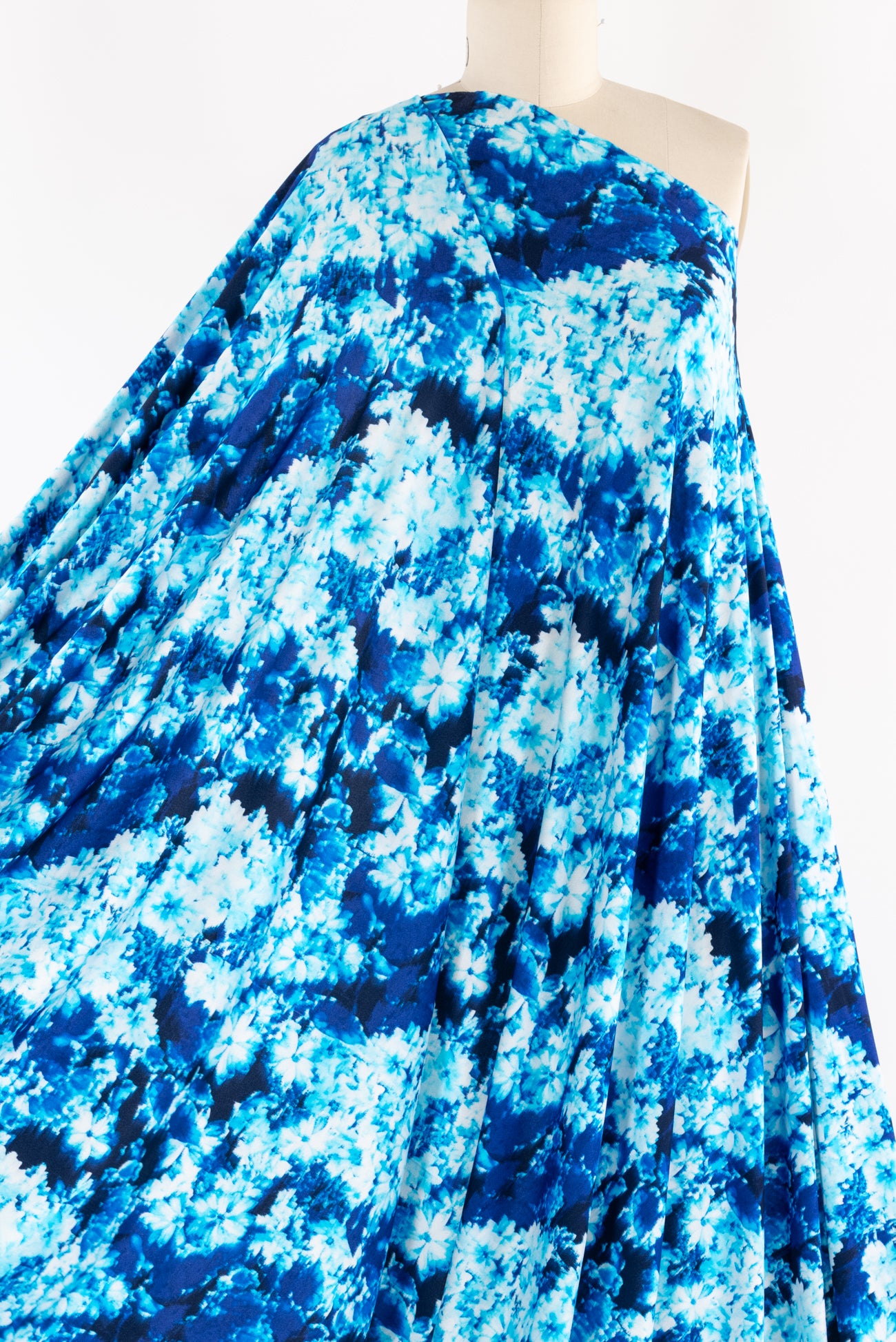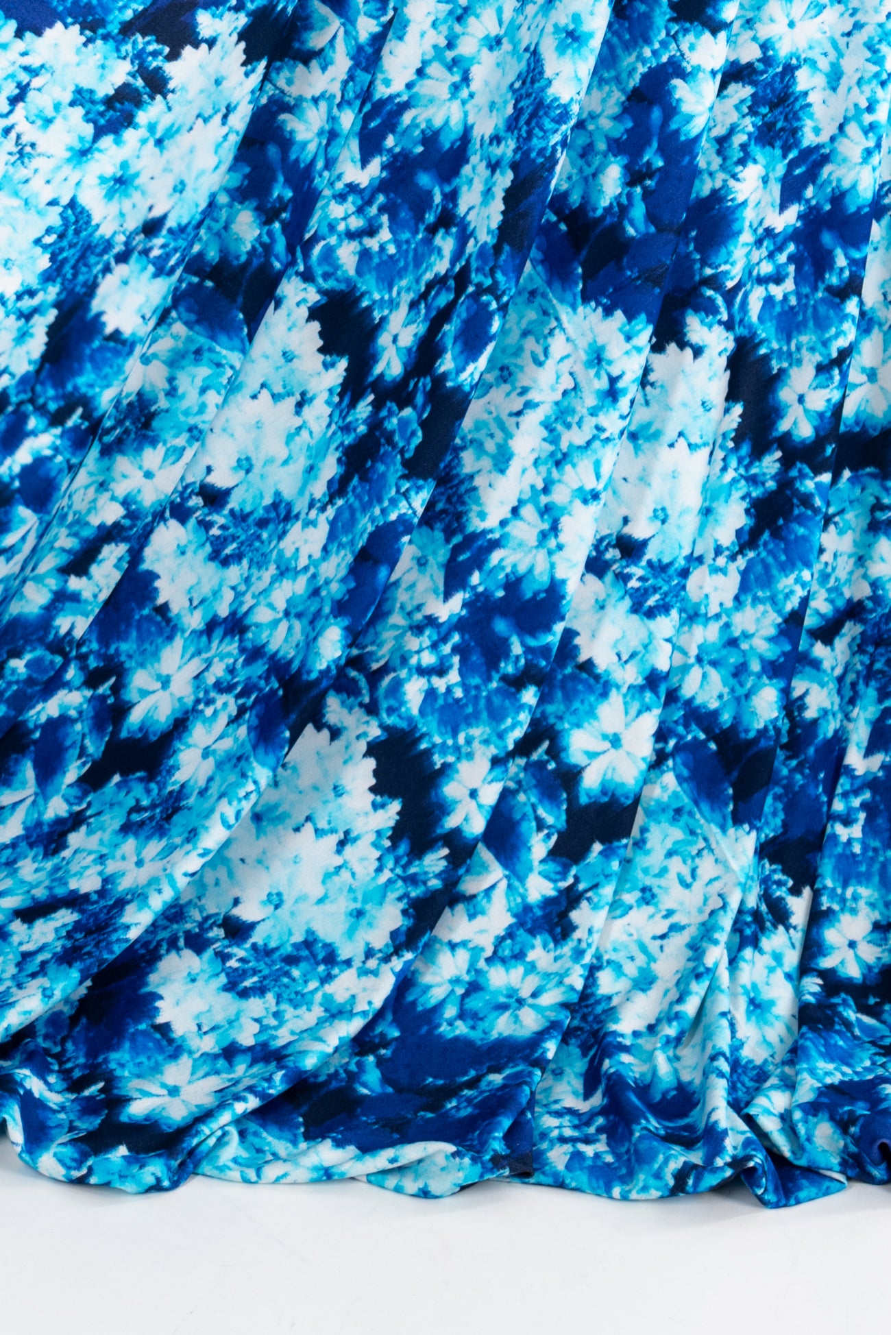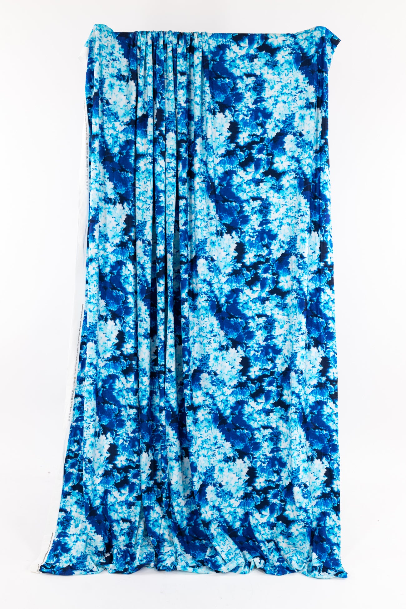 Elegant floral in brilliant shade of blue and turquoise in a digital print on an impeccable European quality cotton/spandex jersey knit, from Denmark. Light/mid-weight, opaque, and will skim the body in a flattering way. It has a soft, smooth texture, fluid drape, 4-way stretch, a 14¼" repeat, and some rolling at the cut edge. Right for a t-shirt, tunic, dress, soft pants, leggings, cardigan, skirt, or loungewear, as well as children's or men's clothing. Oeko-Tex® certified.