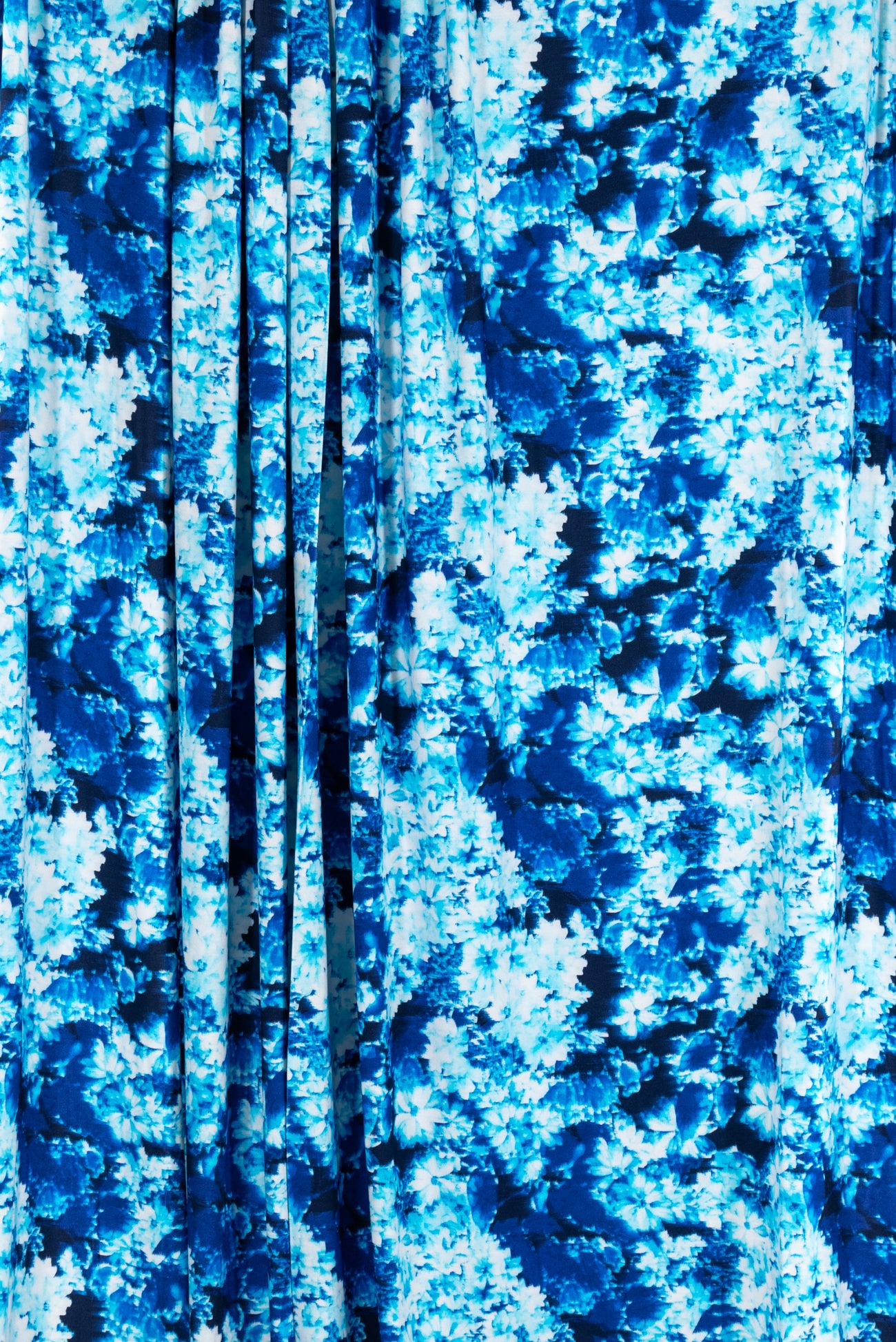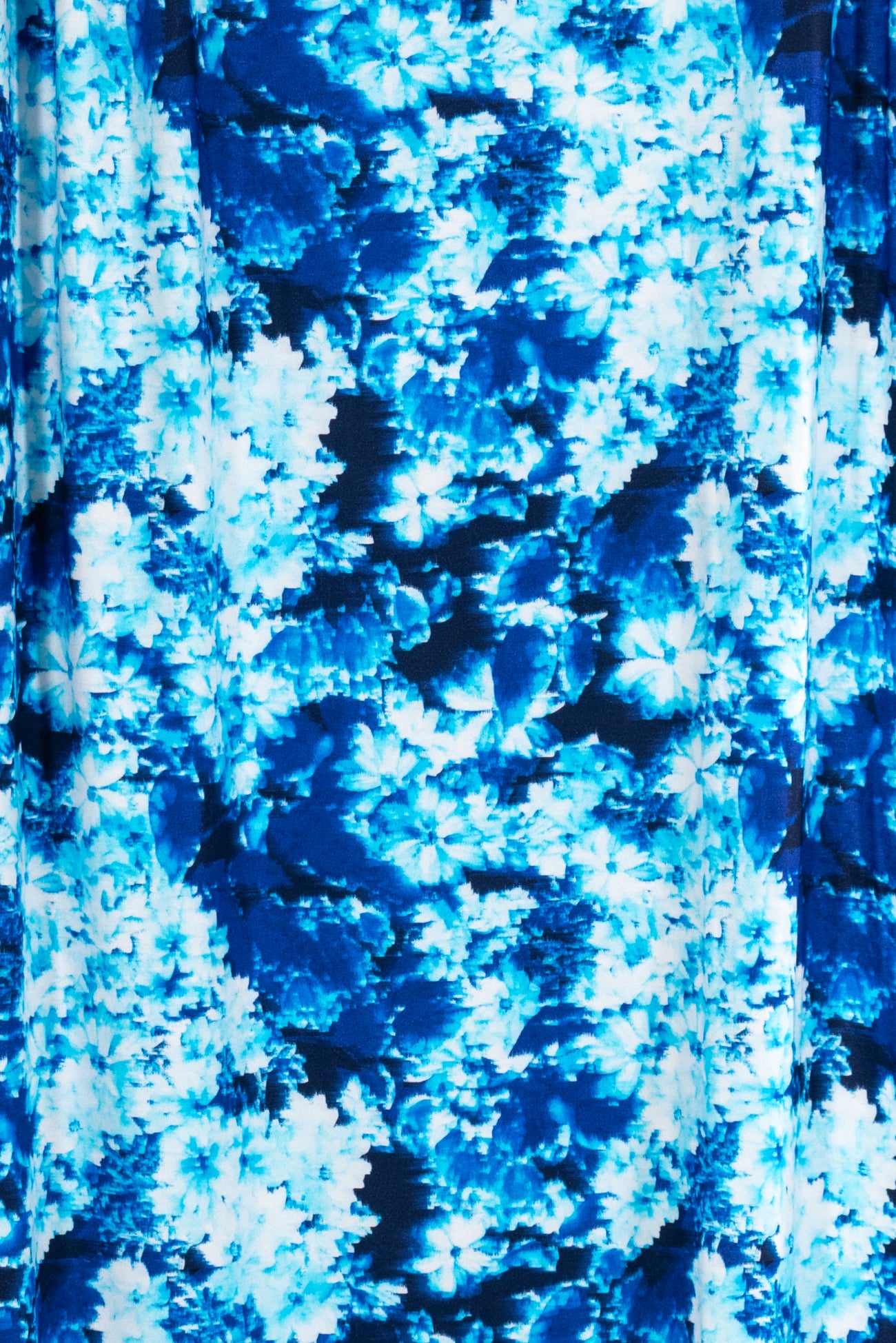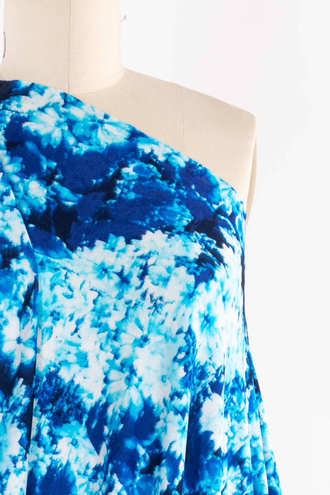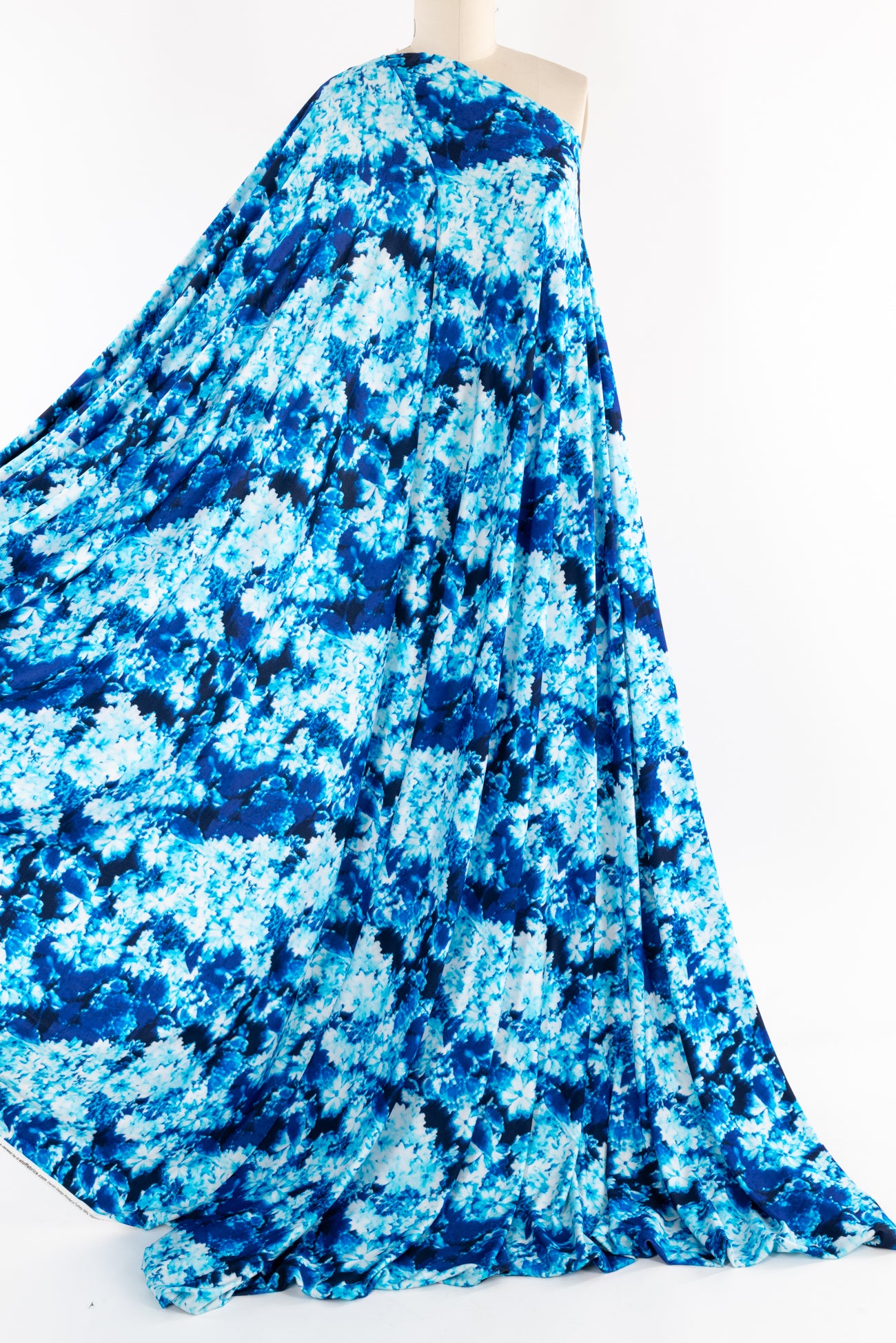 Elegant floral in brilliant shade of blue and turquoise in a digital print on an impeccable European quality cotton/spandex jersey knit, from Denmark. Light/mid-weight, opaque, and will skim the body in a flattering way. It has a soft, smooth texture, fluid drape, 4-way stretch, a 14¼" repeat, and some rolling at the cut edge. Right for a t-shirt, tunic, dress, soft pants, leggings, cardigan, skirt, or loungewear, as well as children's or men's clothing. Oeko-Tex® certified.