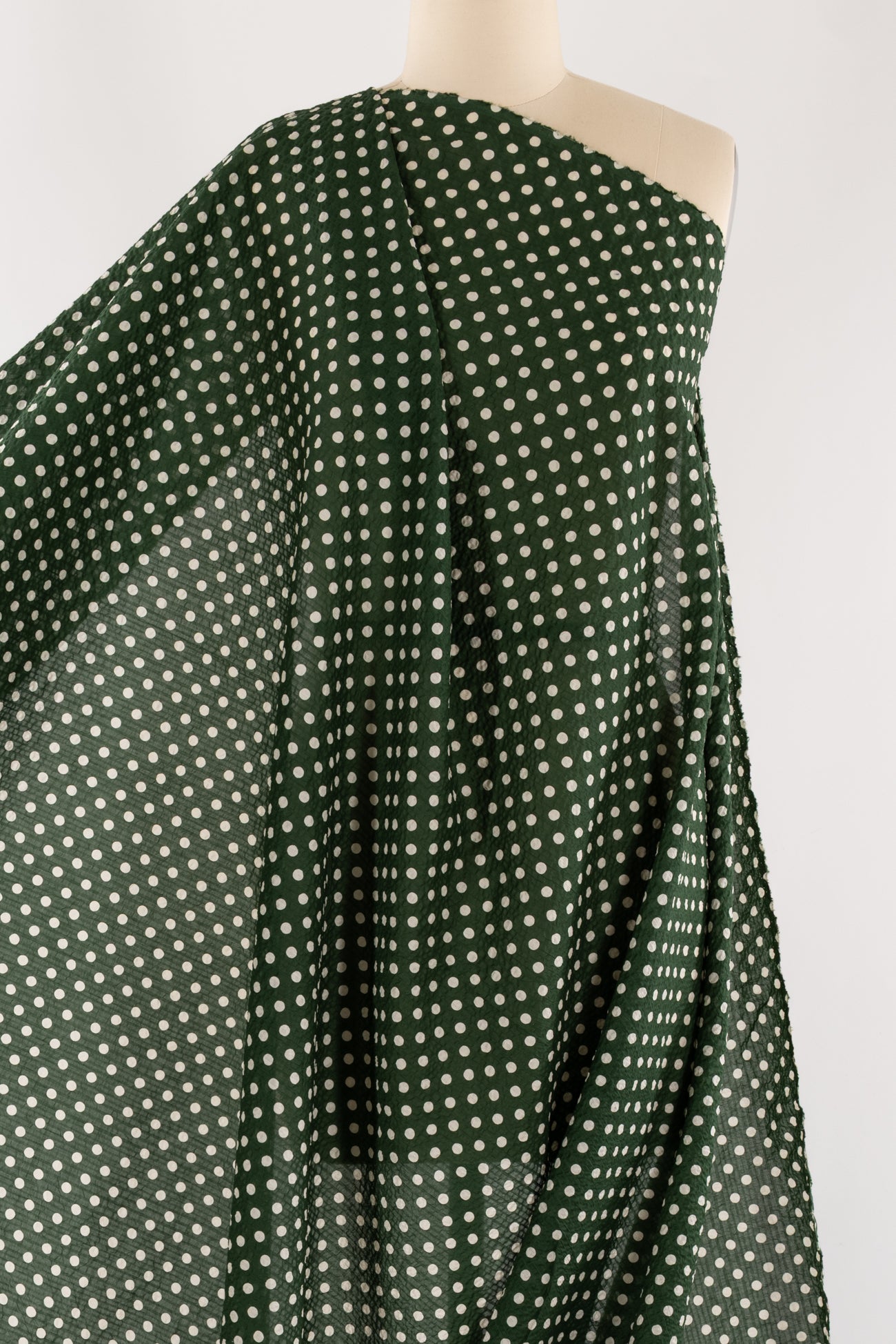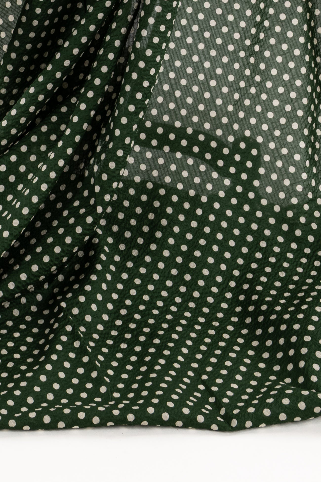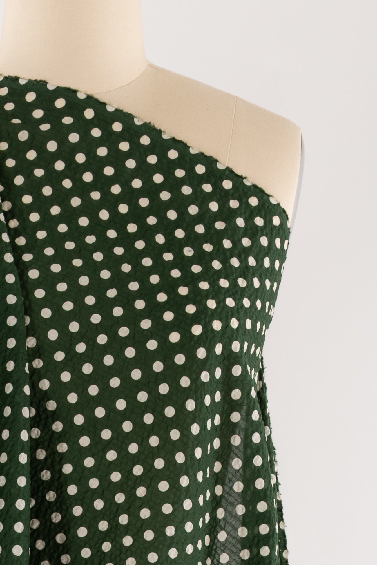 Delightful dots in laurel green on white seersucker, impeccable quality deadstock from a Japanese mill. The softly crimped texture of seersucker ensures it does not cling, delivering cool comfort even in the hottest climates. Perfect for the heat of summer whether you are in city or country. Lovely shirting/dress weight with an appealing soft cool lightly textured hand, supple drape and 1" repeat. Perfect for a shirt, blouse, dress, tunic, soft pants, caftan, kimono, men's or children's. Limited quantity available.
