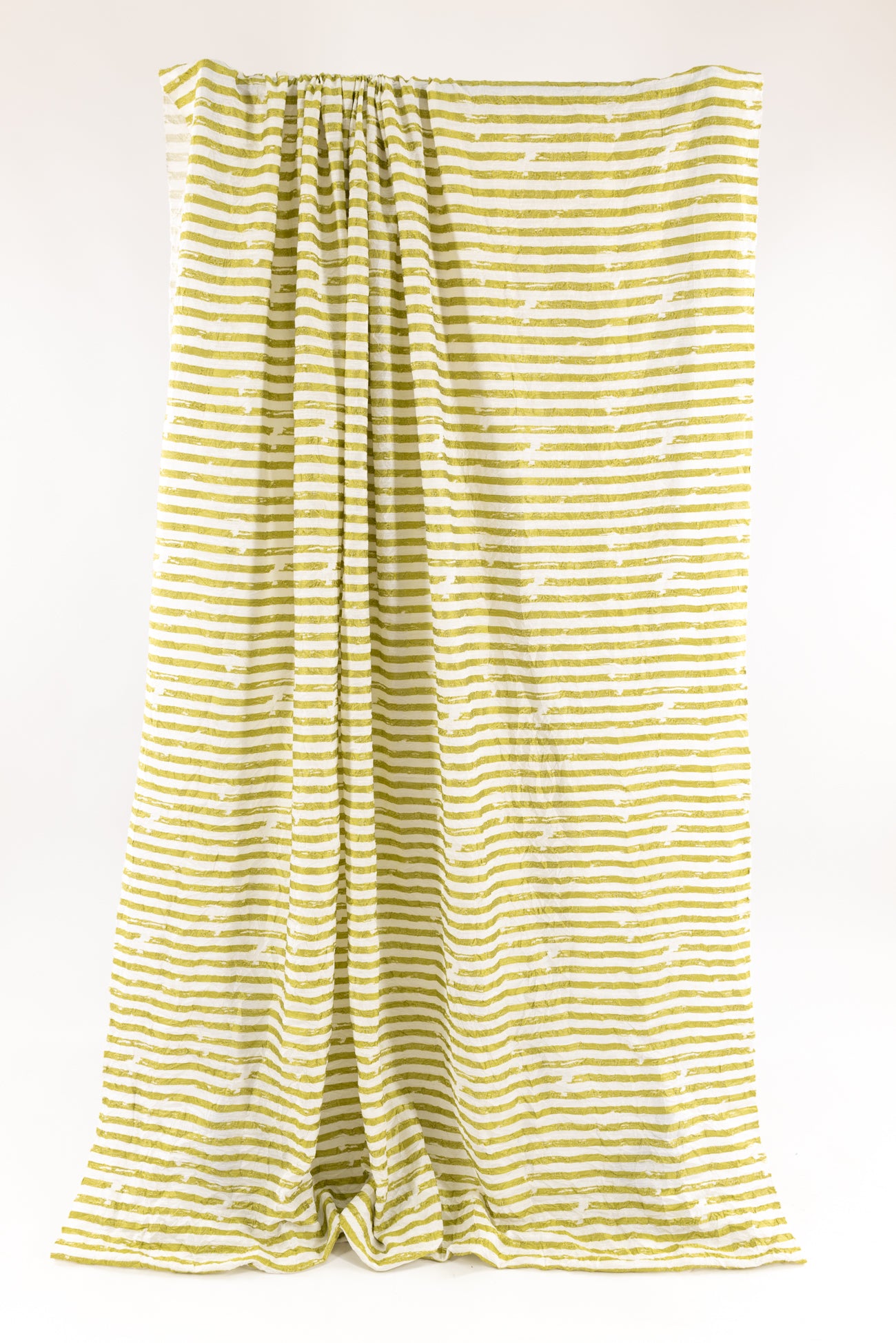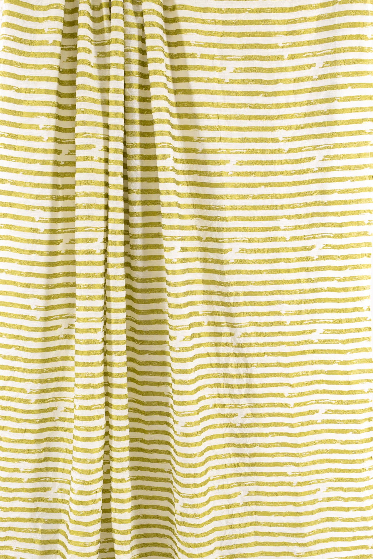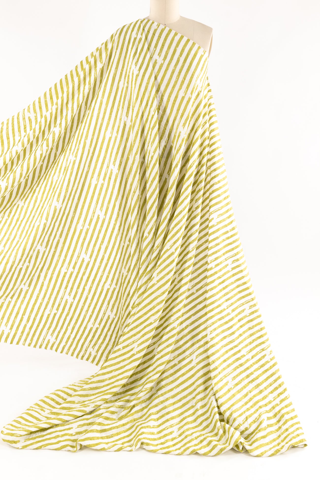 Hand drawn effect lime/acid green 1/2" horizontal stripes are printed overall on an airy, lightly textured, softly crinkled rayon, deadstock from LA cult couturier Jane Mohr for Dress to Kill. Lightweight, semi-opaque, with a smooth, cool, dry lightly textured hand and airy fluid drape. Right for a dress, shirt, skirt, tunic, soft pants, caftan, menswear.
