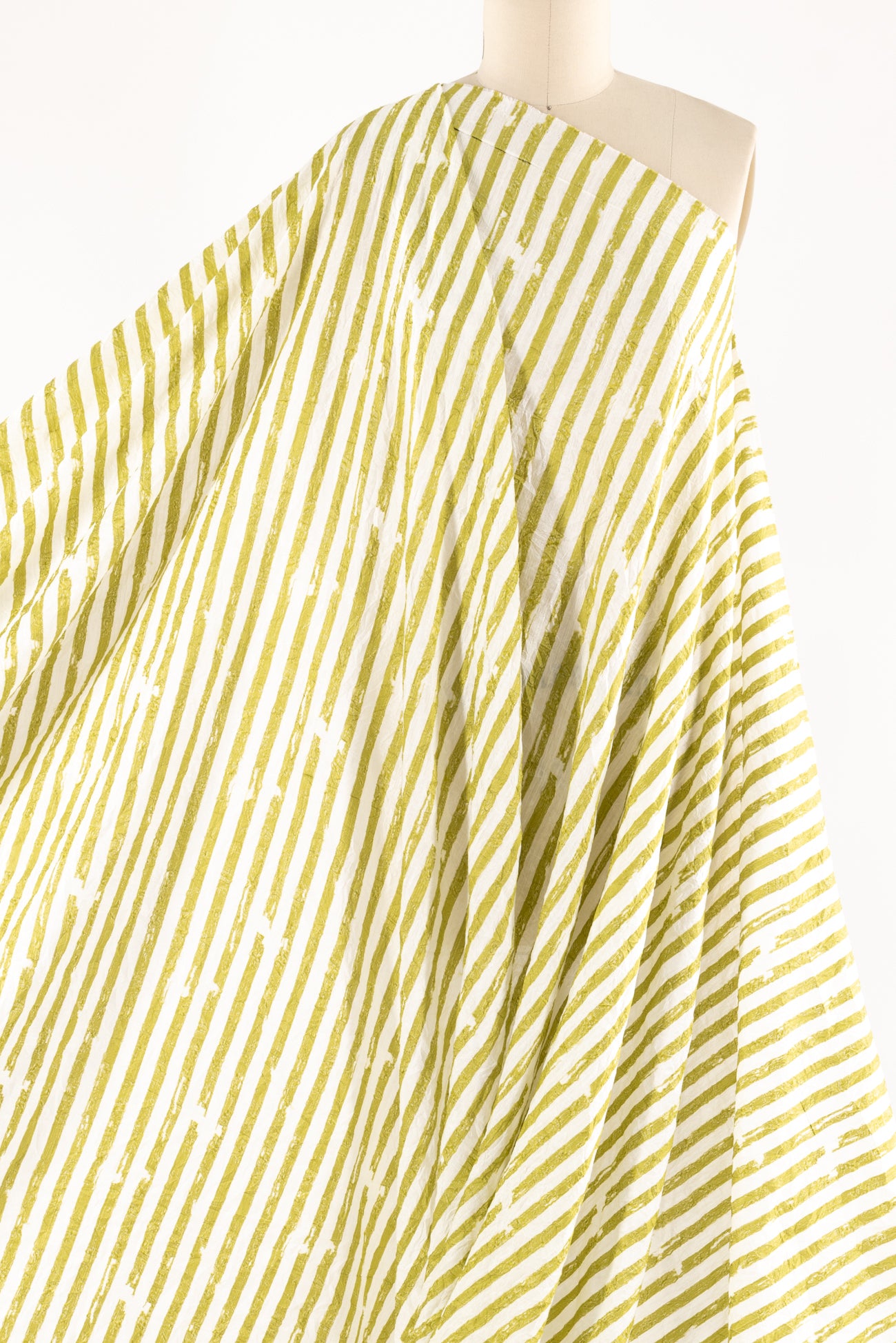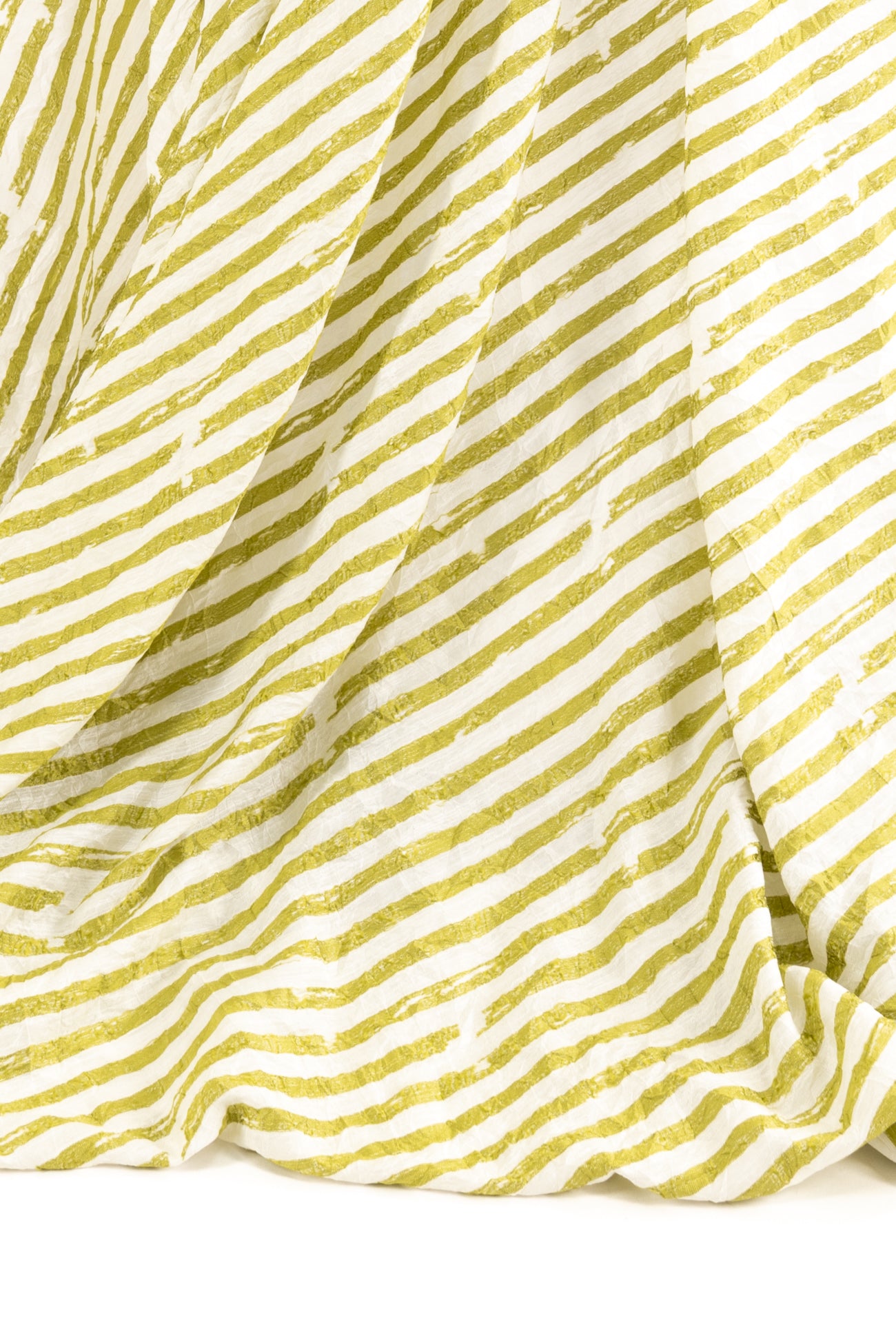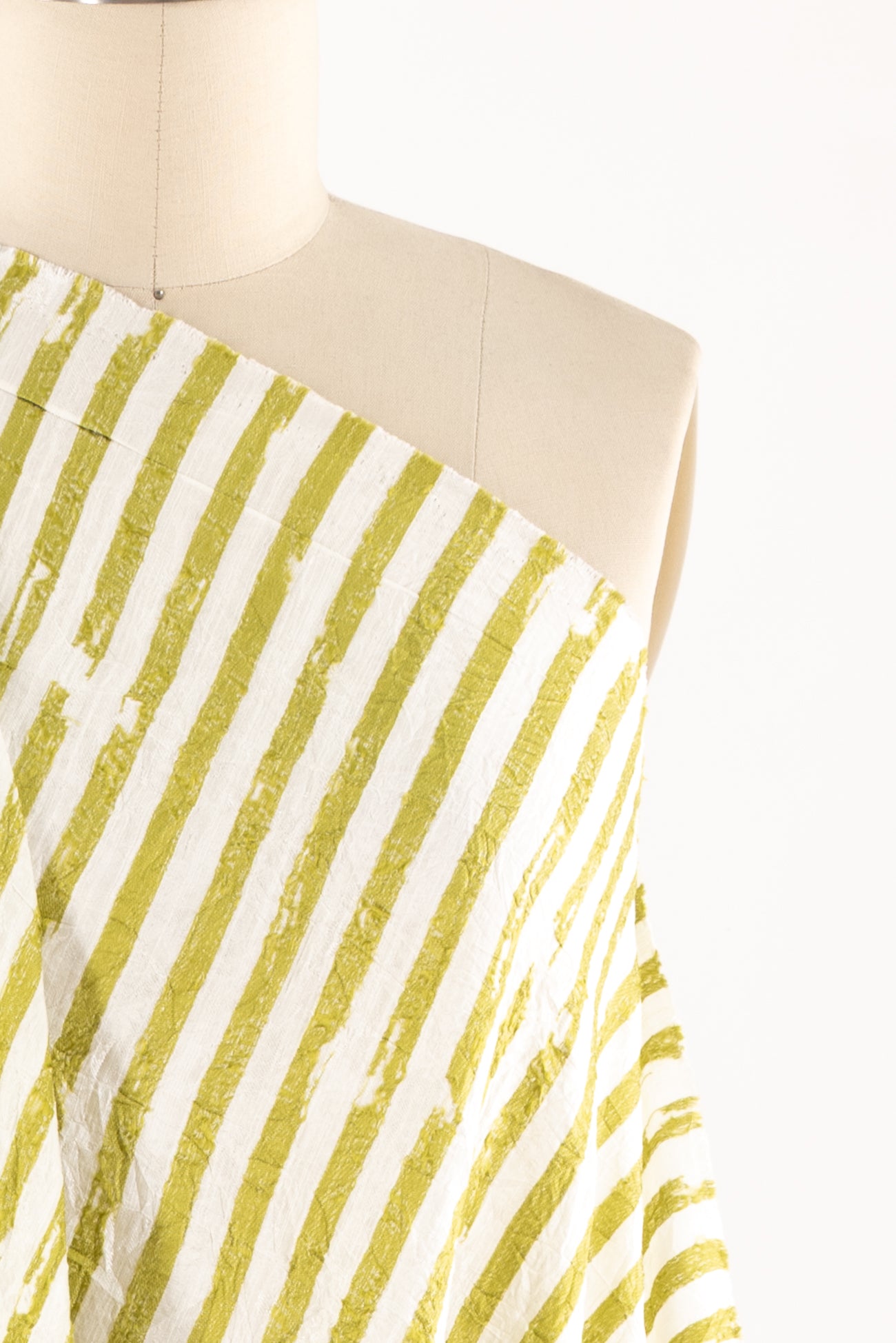 Hand drawn effect lime/acid green 1/2" horizontal stripes are printed overall on an airy, lightly textured, softly crinkled rayon, deadstock from LA cult couturier Jane Mohr for Dress to Kill. Lightweight, semi-opaque, with a smooth, cool, dry lightly textured hand and airy fluid drape. Right for a dress, shirt, skirt, tunic, soft pants, caftan, menswear.