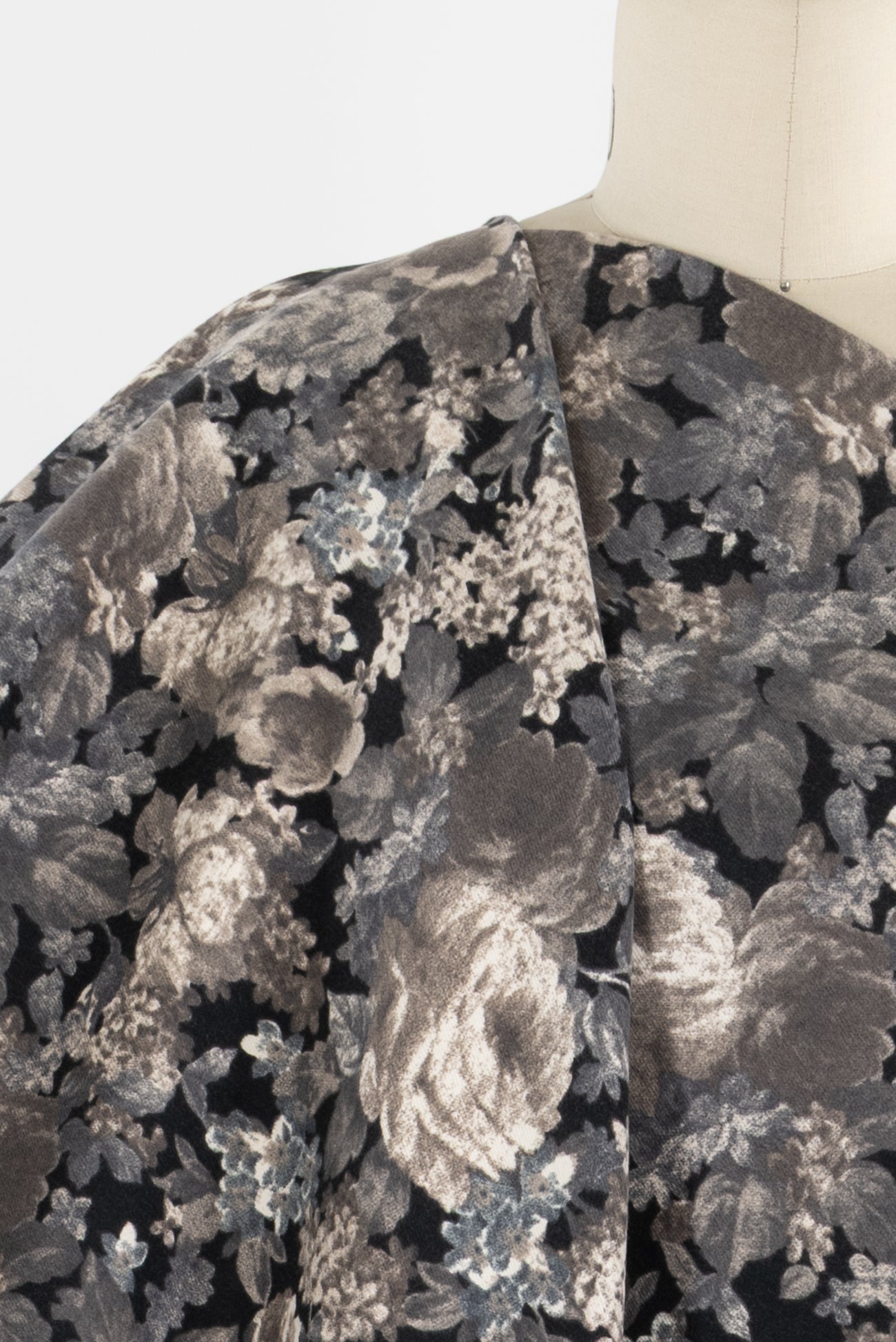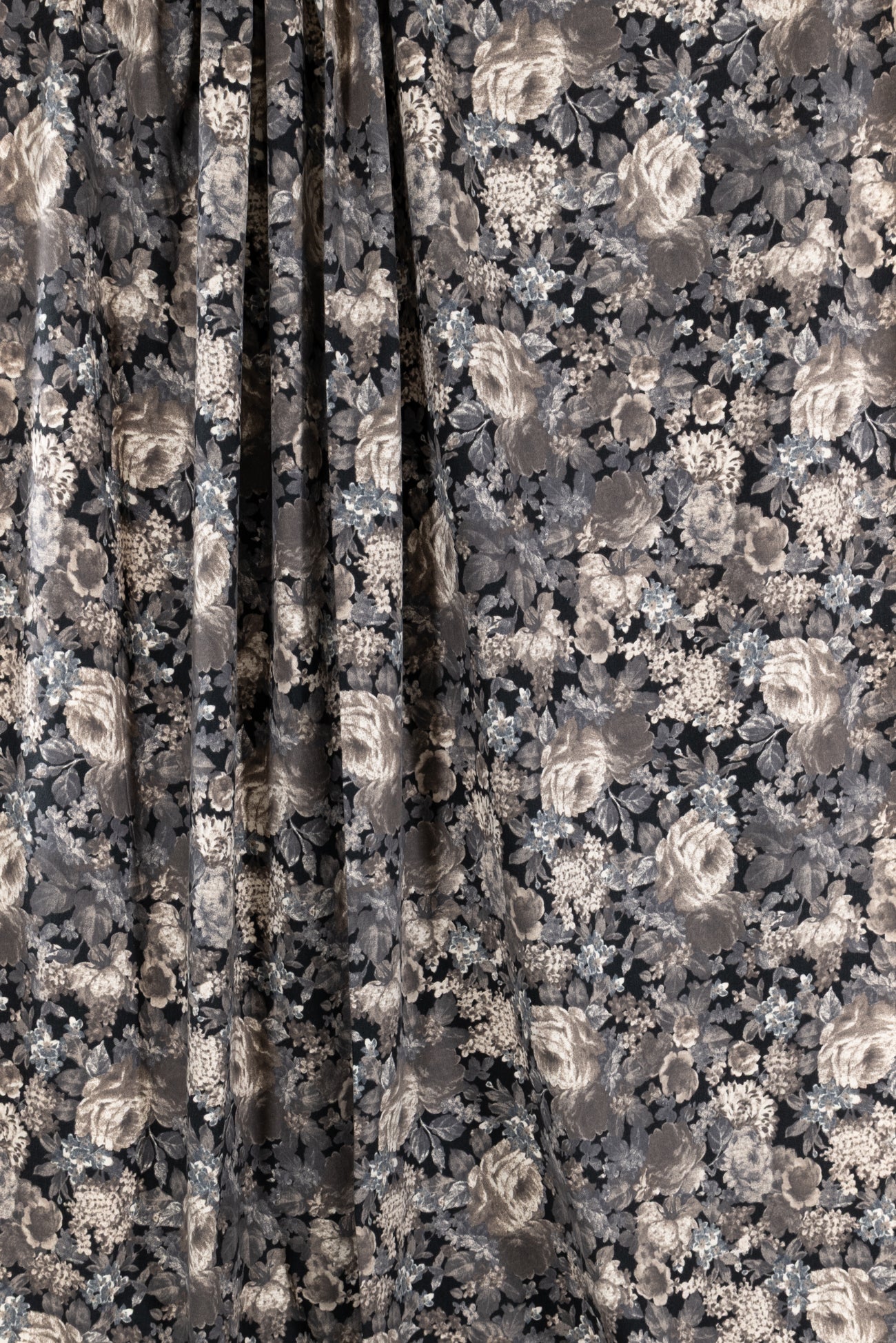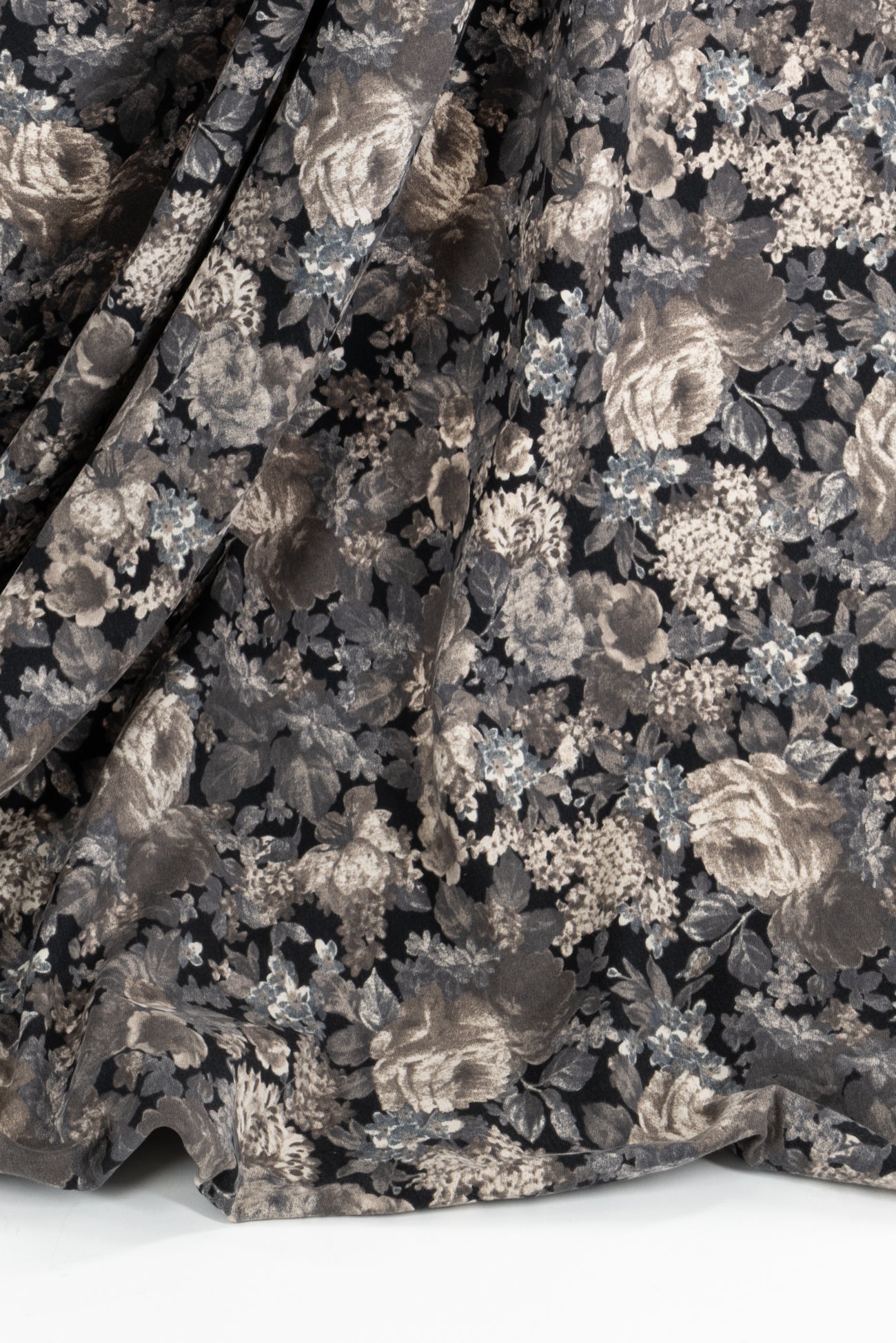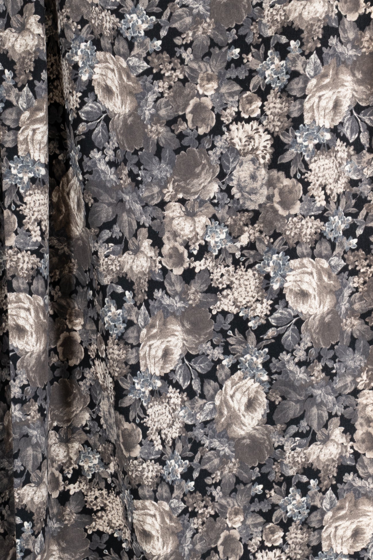 Romantic monochrome floral printed in shades of black, gray, and taupe on cotton, charming deadstock from an LA designer. Mid/shirting weight, opaque, with a soft lightly textured hand, a 14¼" repeat, and a lightly structured drape. Right for a shirt, dress, tunic, skirt, soft pant, light jacket or vest, jumpsuit, caftan, kimono, crafting, or home decor.