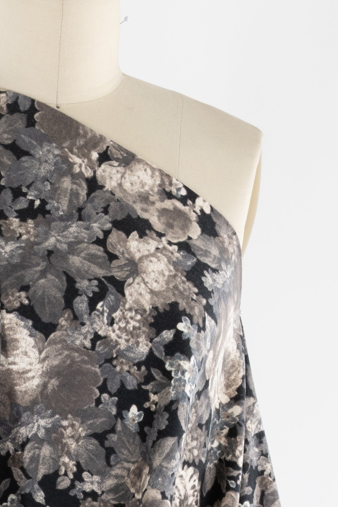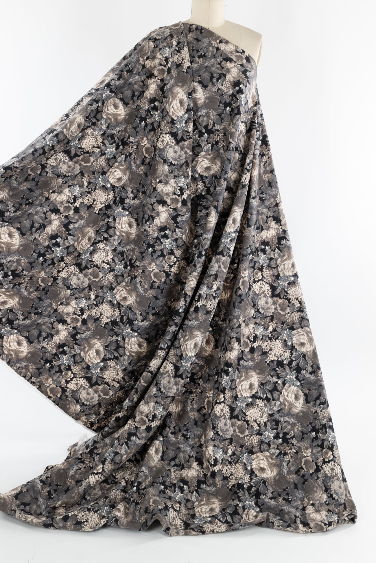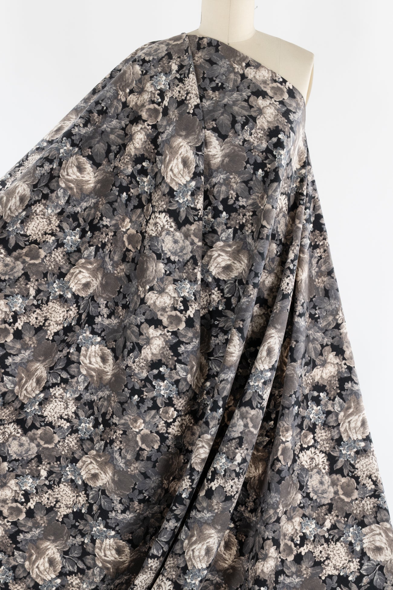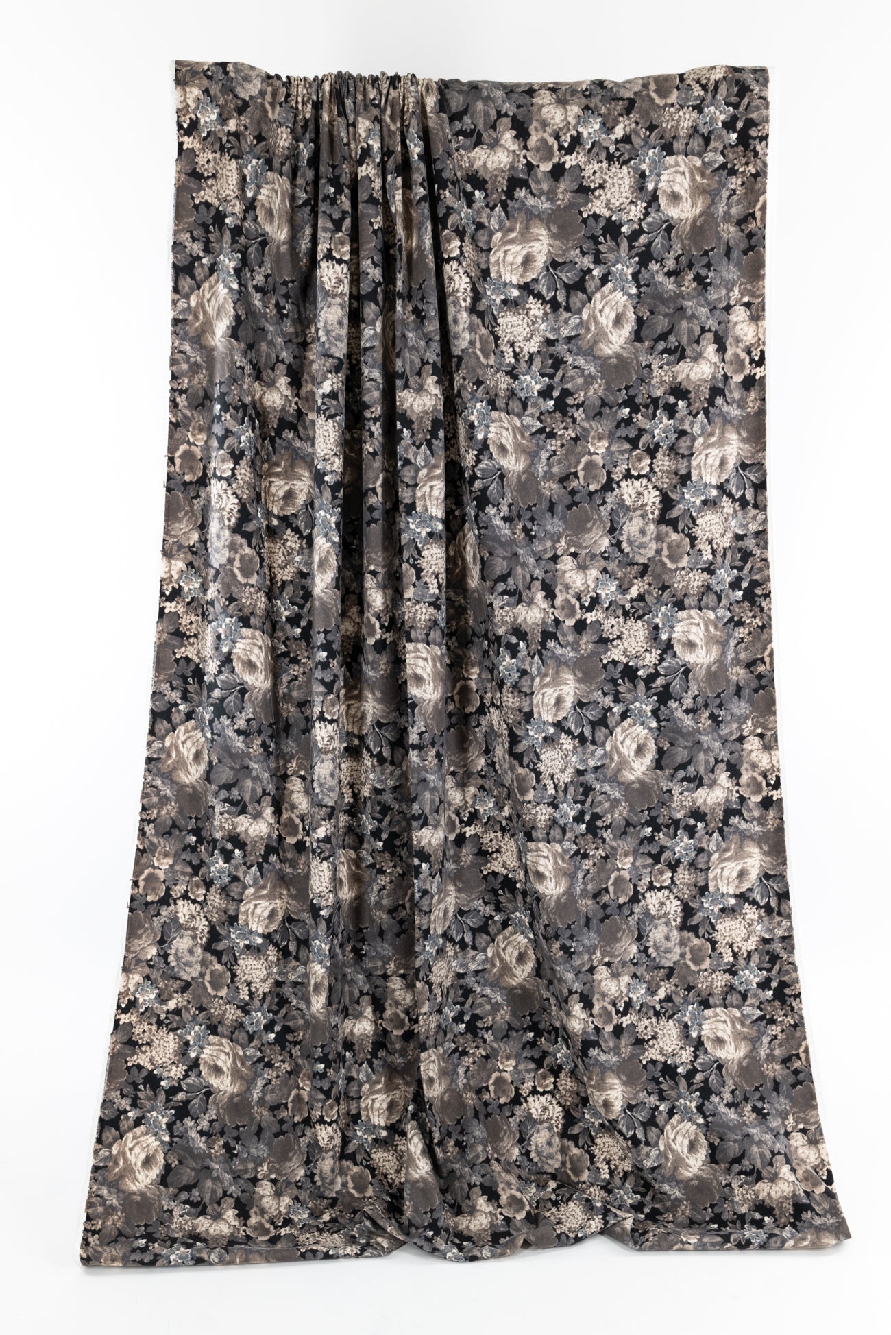 Romantic monochrome floral printed in shades of black, gray, and taupe on cotton, charming deadstock from an LA designer. Mid/shirting weight, opaque, with a soft lightly textured hand, a 14¼" repeat, and a lightly structured drape. Right for a shirt, dress, tunic, skirt, soft pant, light jacket or vest, jumpsuit, caftan, kimono, crafting, or home decor.