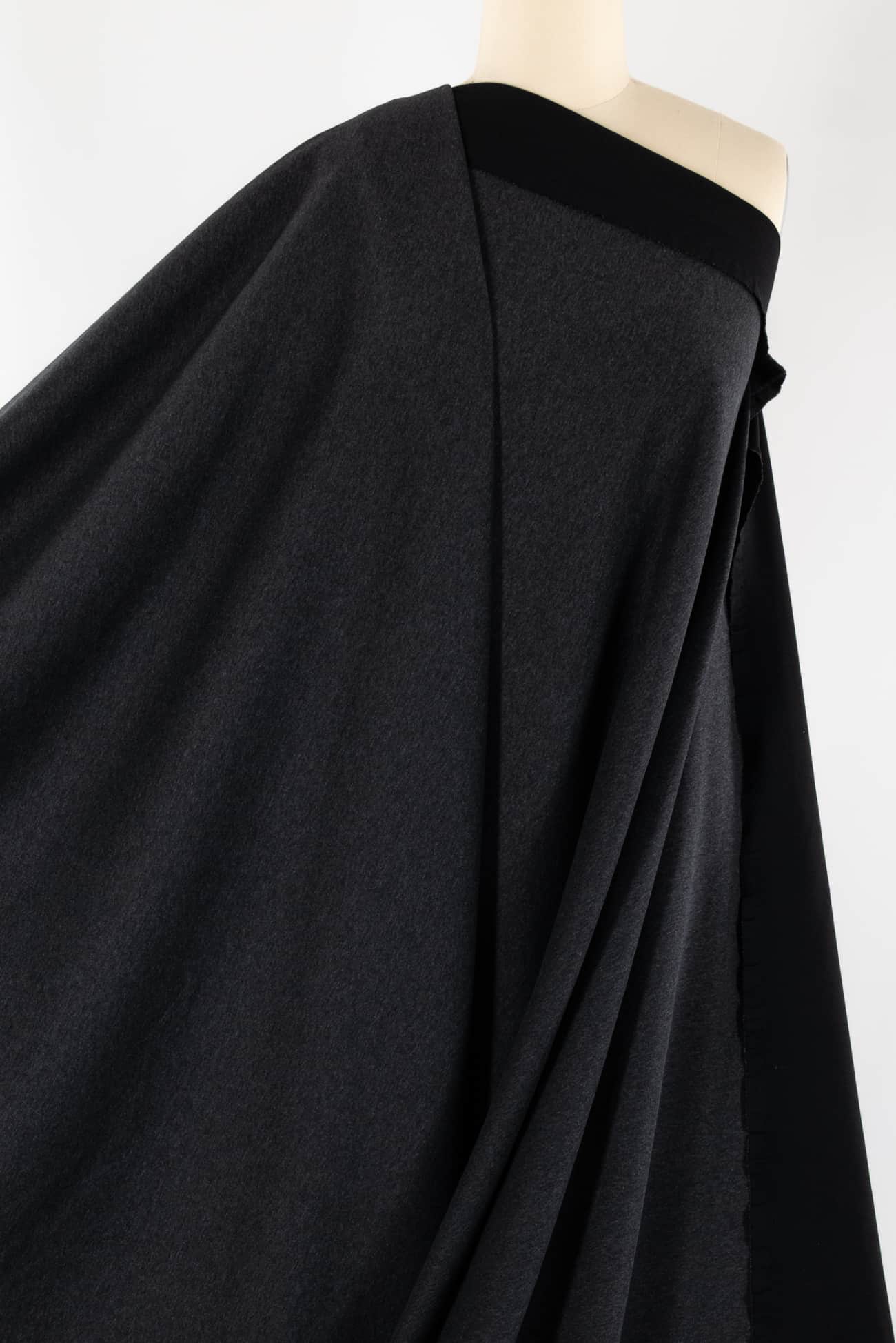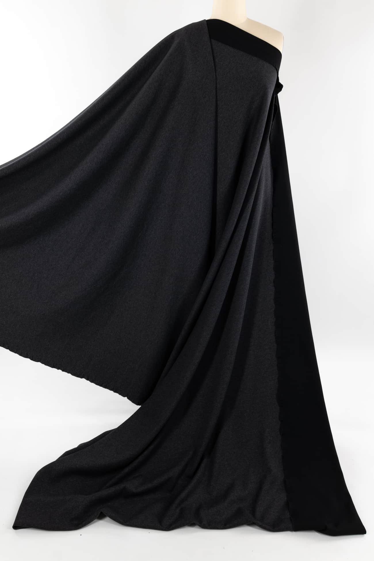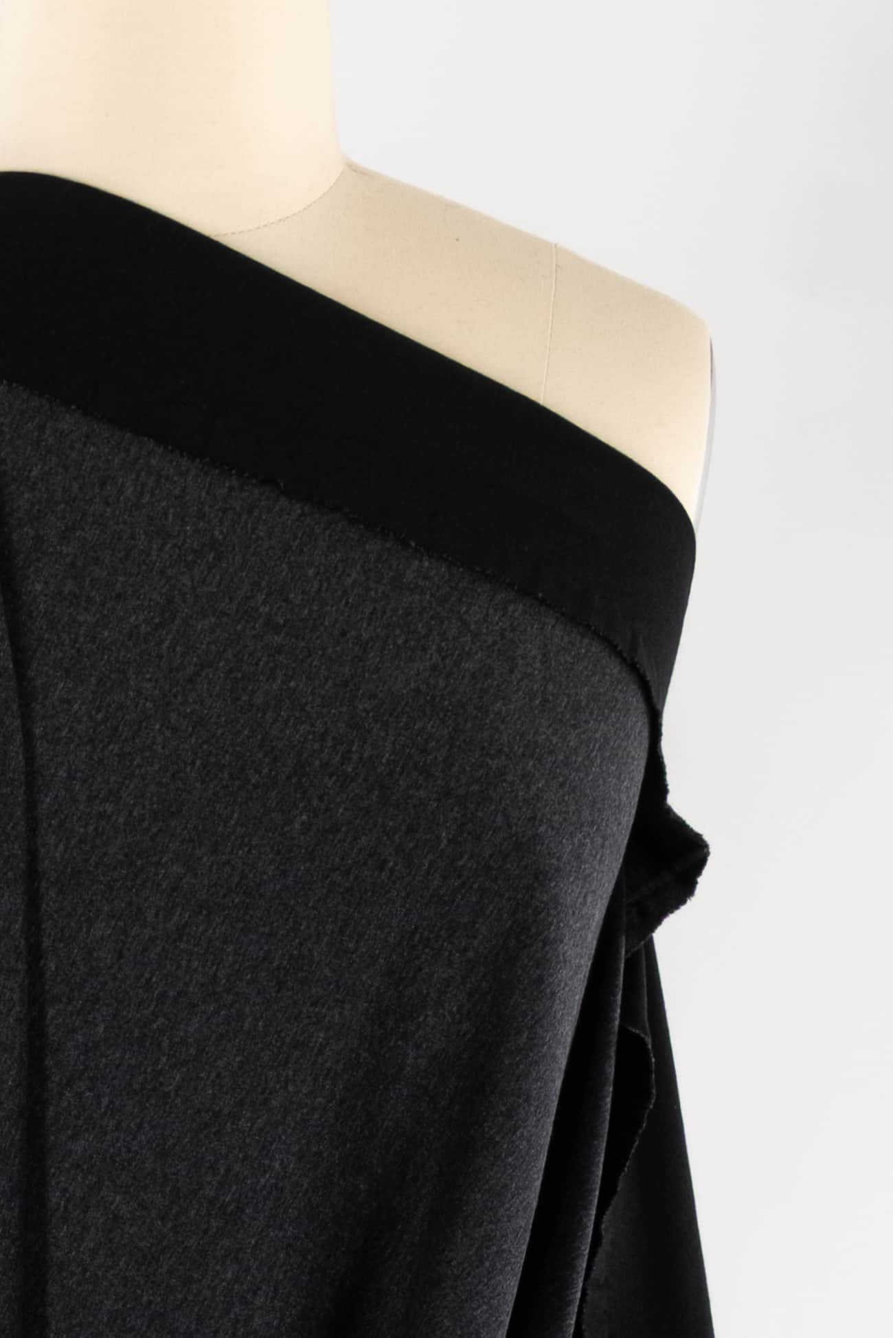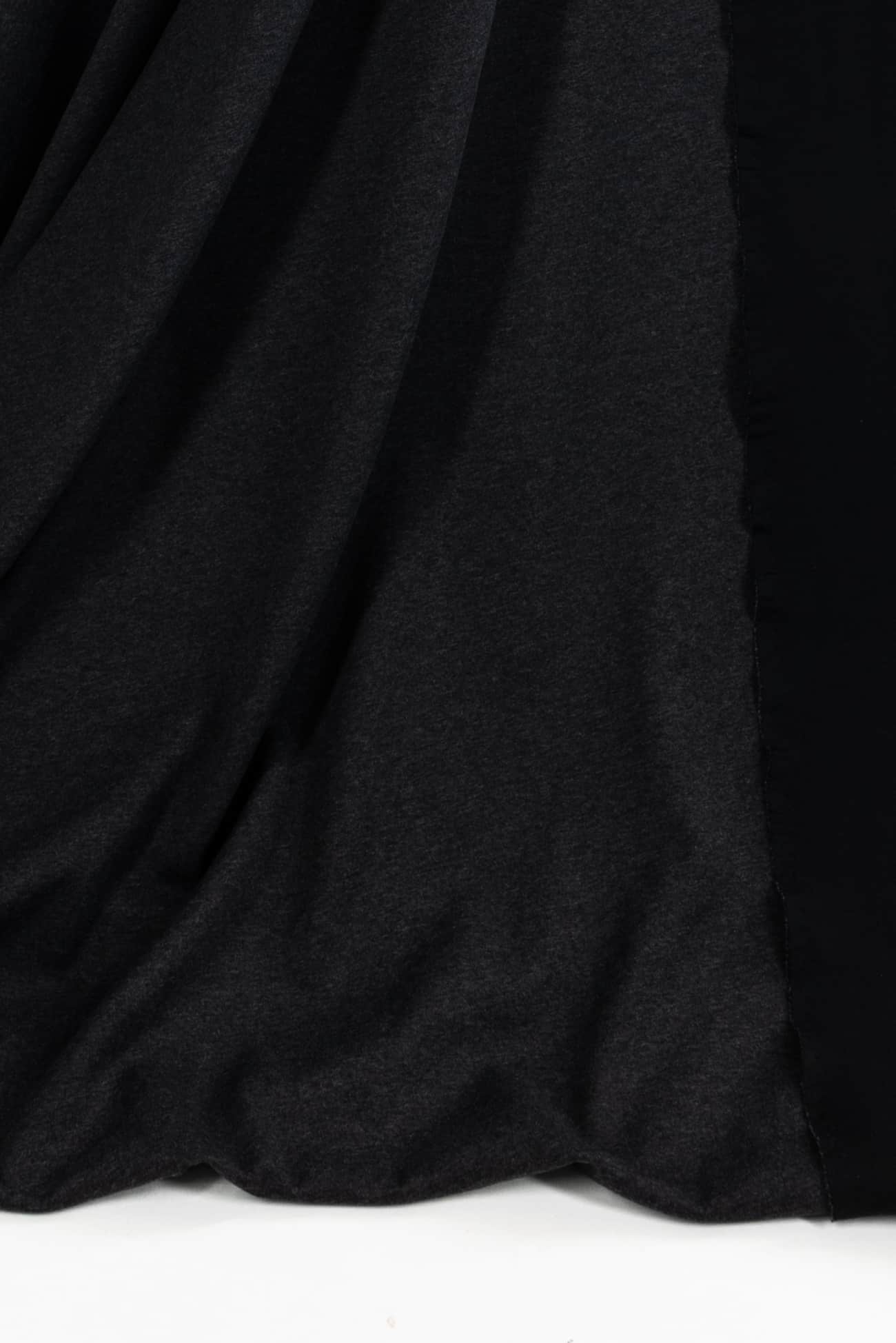 Elegant double sided ponte in gray and black, deadstock from a USA mill. Very nice, use either or both sides. Mid weight with a smooth hand, stable with a good drape, an appealing smooth hand and crosswise stretch with good recovery. No rolling at the cut edge and no seam finish required, making it is easy to sew. Works for both tops and bottoms; the weight is right for a t-shirt, top, tunic, dress, vest, hoodie, jumpsuit, coat or jacket.