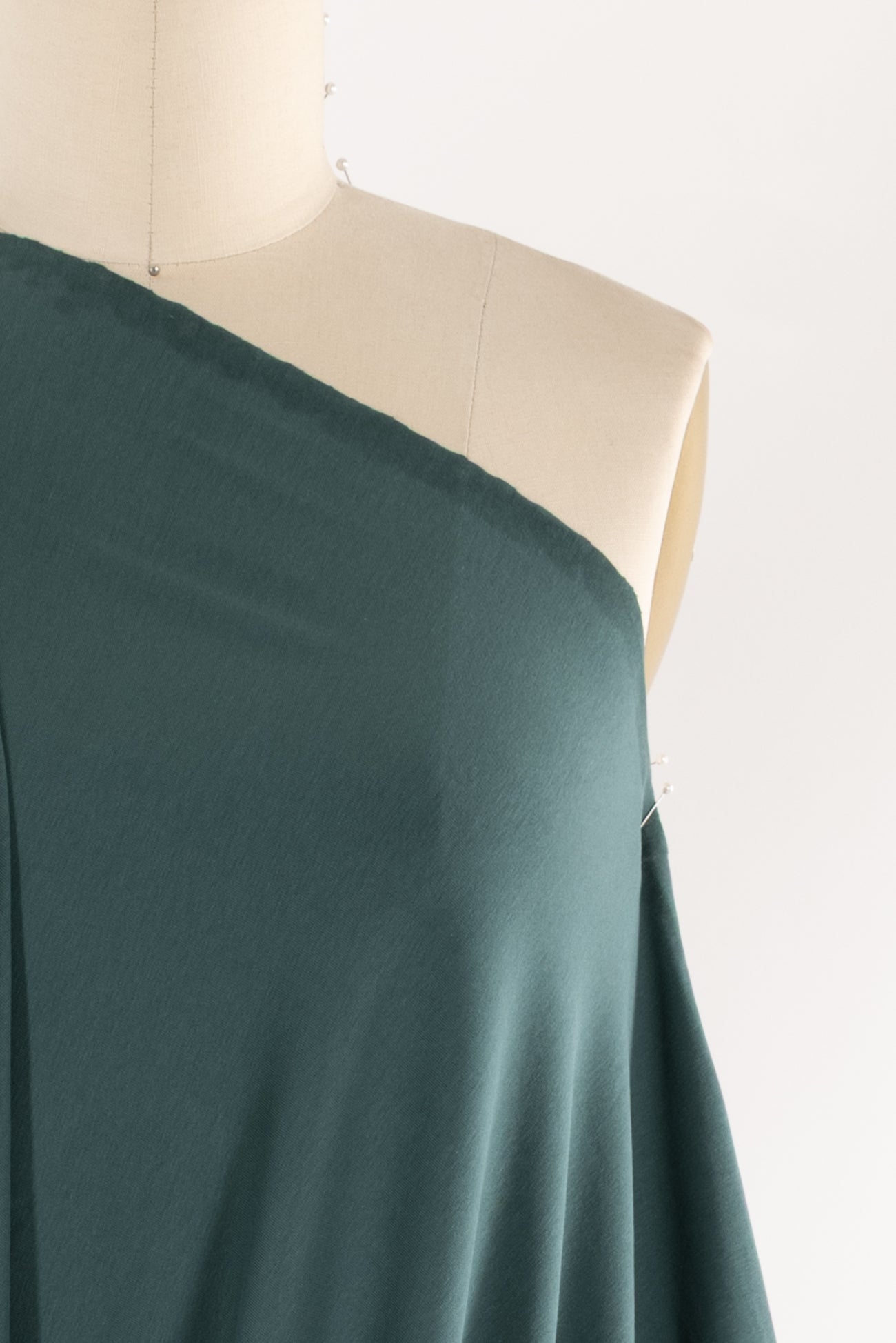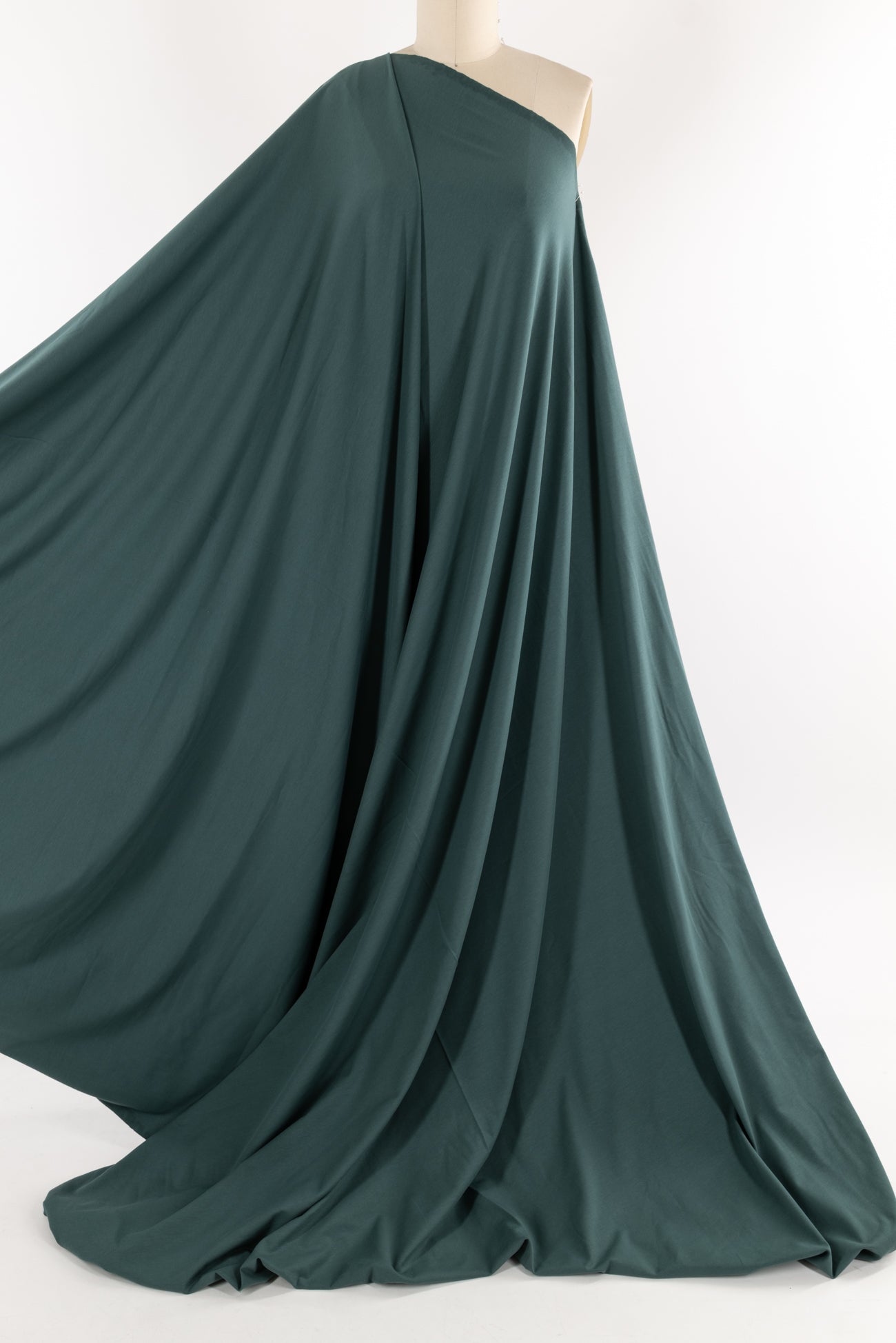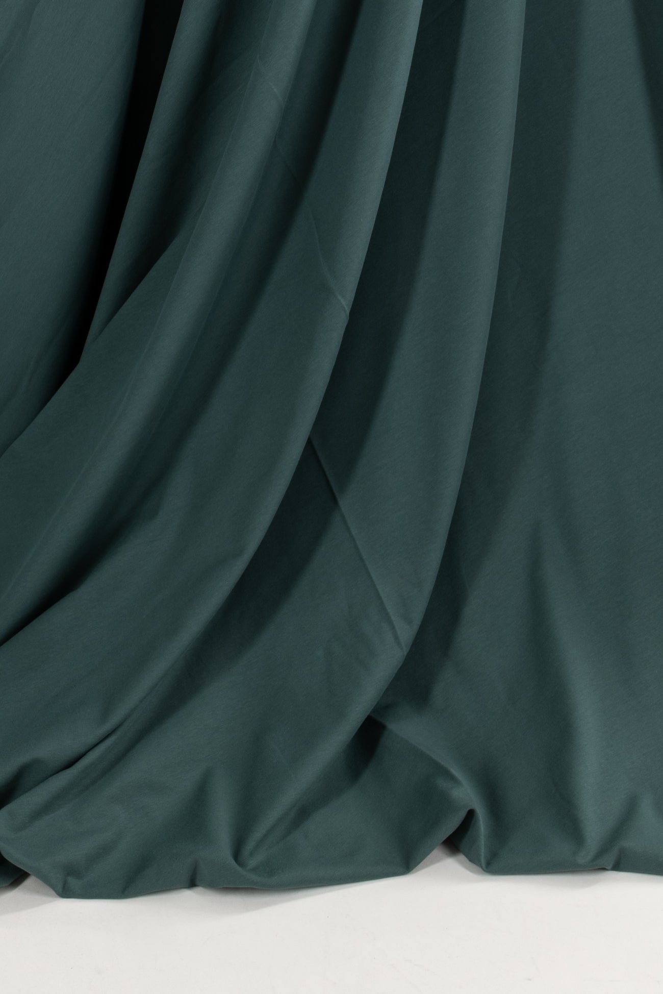 Muted piney teal in an impeccable European quality cotton/spandex jersey knit, produced in Denmark. Light/mid-weight, opaque, and will skim the body in a flattering way. It has a soft, smooth hand, fluid drape, 4-way stretch and some rolling at the cut edge. Right for a variety of garments: t-shirt, tunic, dress, soft pants, leggings, cardigan, caftan, skirt, or lounge-wear, as well as children's and men's clothing. Oeko-Tex® certified.