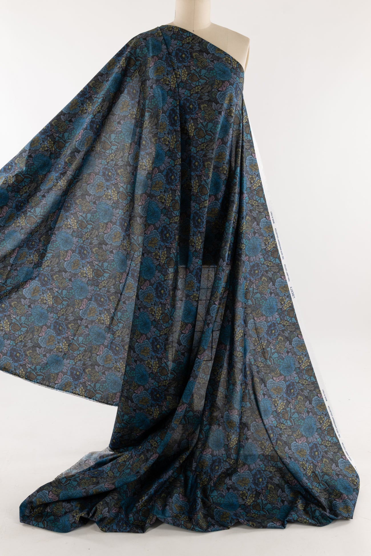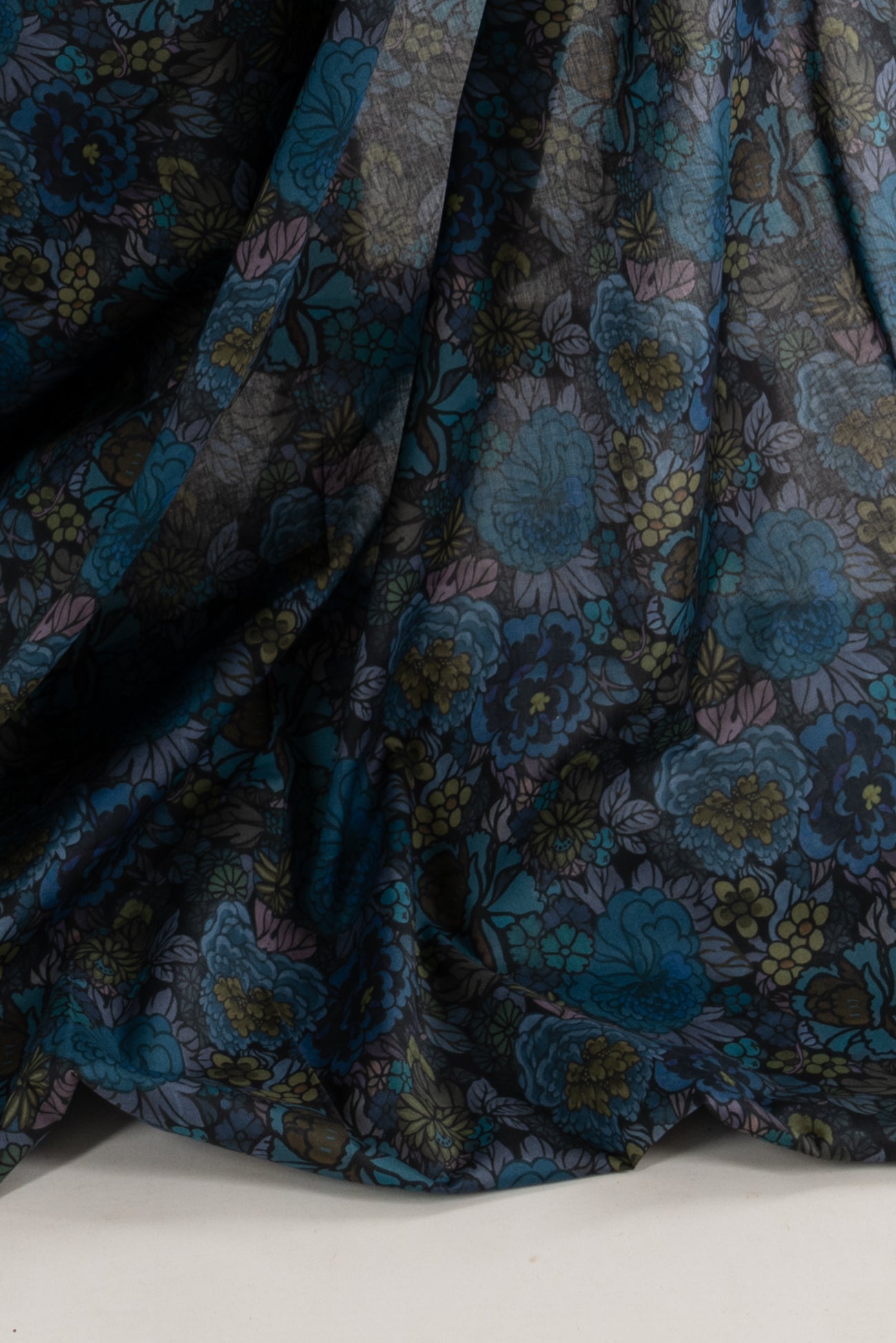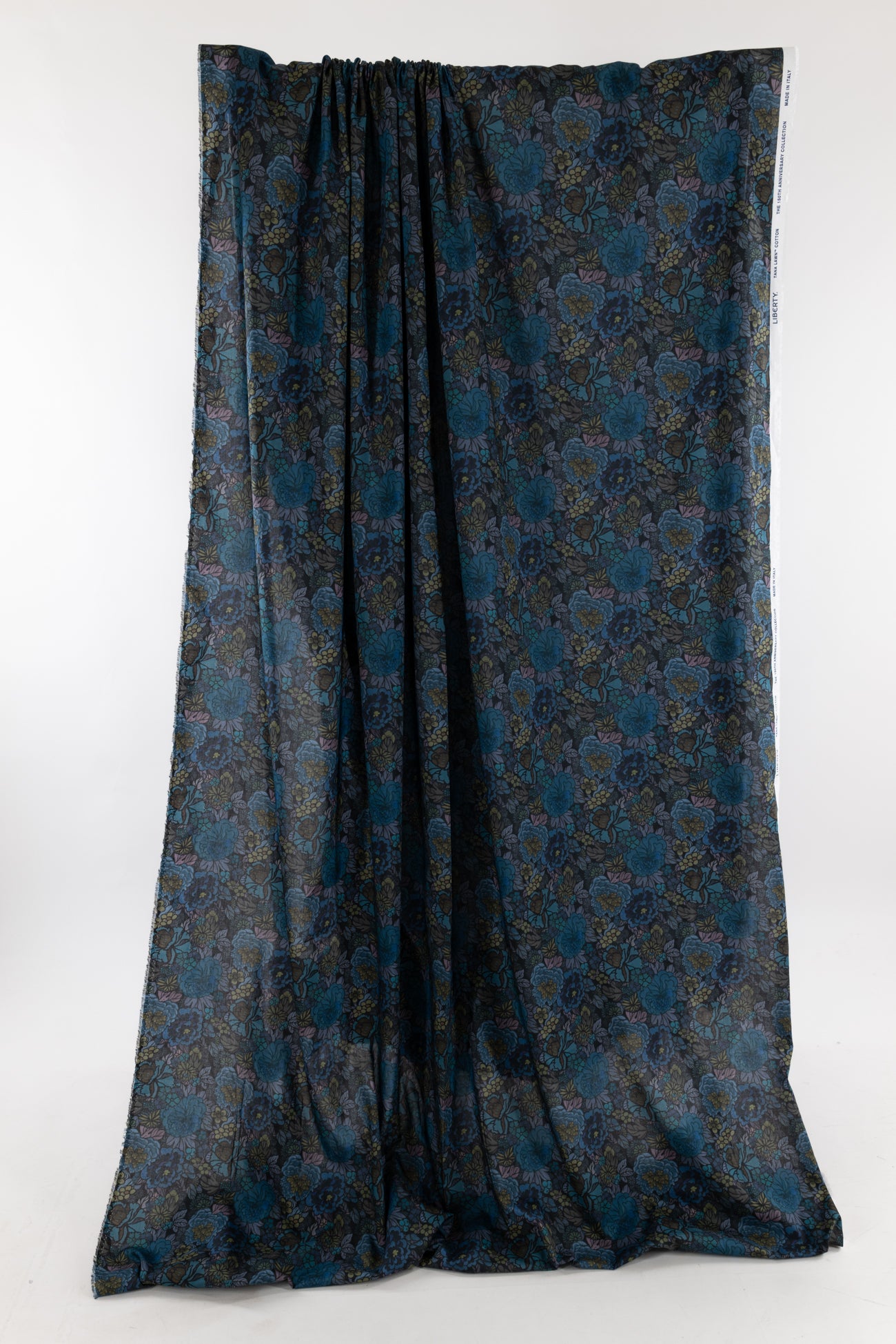 Contemporary floral inspired by vintage Liberty designs in shades of blue and gray with green and black accents. Produced in Northern Italy for Liberty of London, printed on the renowned and exceptional Tana Lawn, the cotton that behaves and feels like silk. Fine-grained, with a cool, smooth, soft hand, fluid drape, and depth of color. Perfect for a shirt, dress, skirt, tunic, soft pant, caftan, loungewear, children's or men's clothes, accessories, or home decor. Right to wear everyday or for statement pieces. One-way design 8¼" repeat. OEKO-TEX® certified.